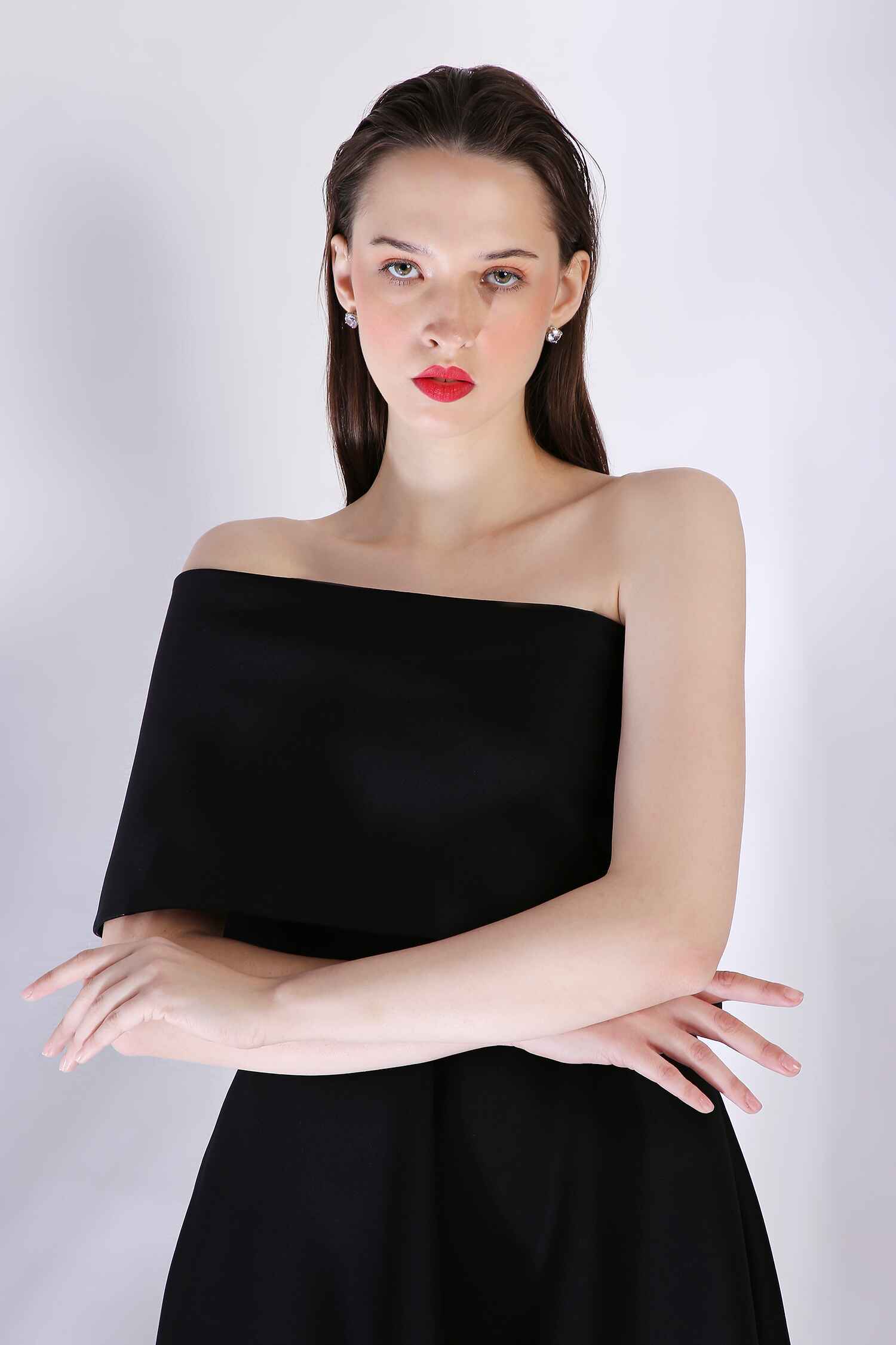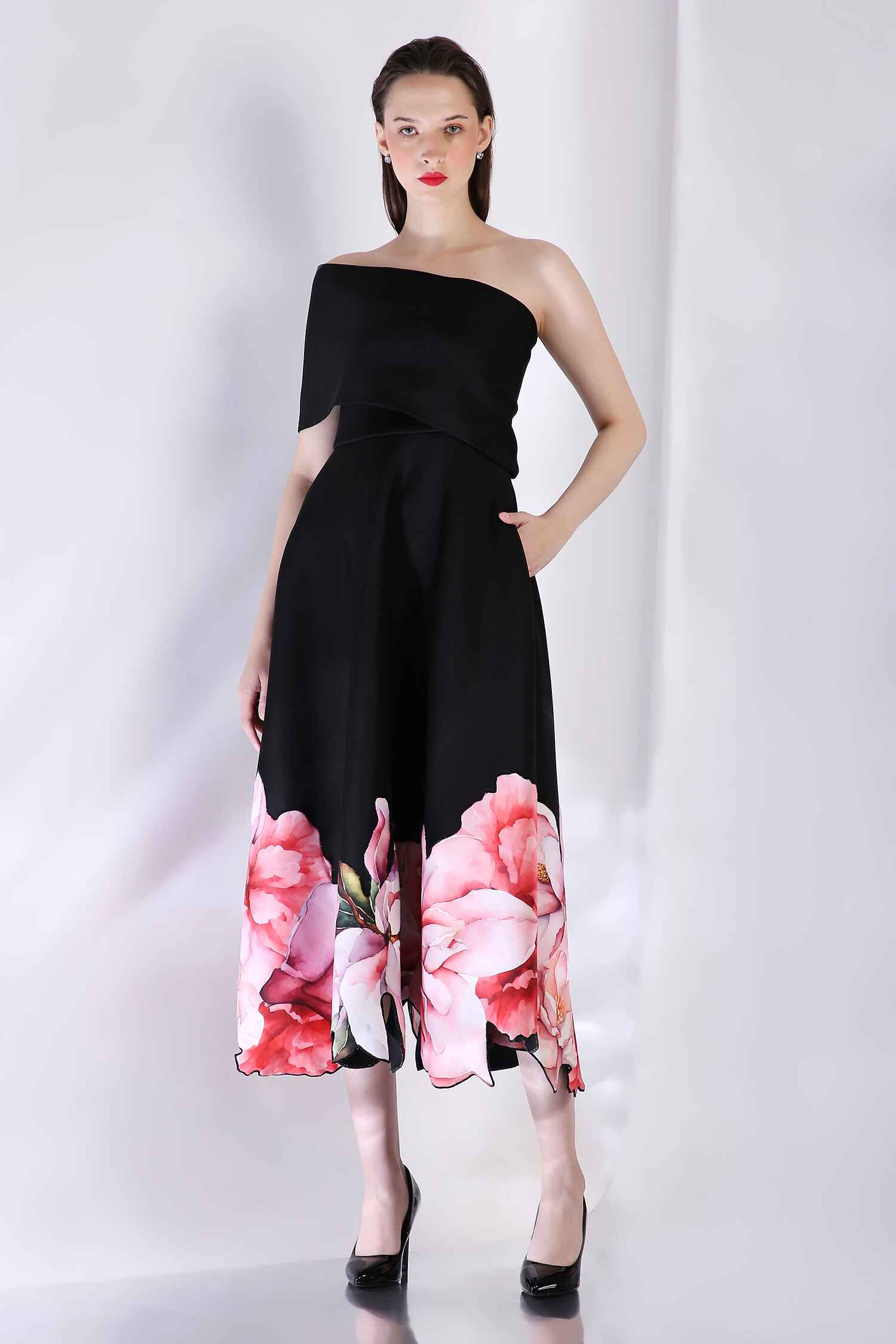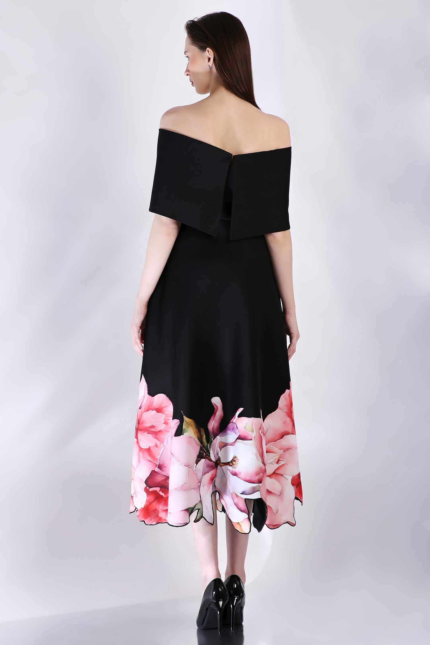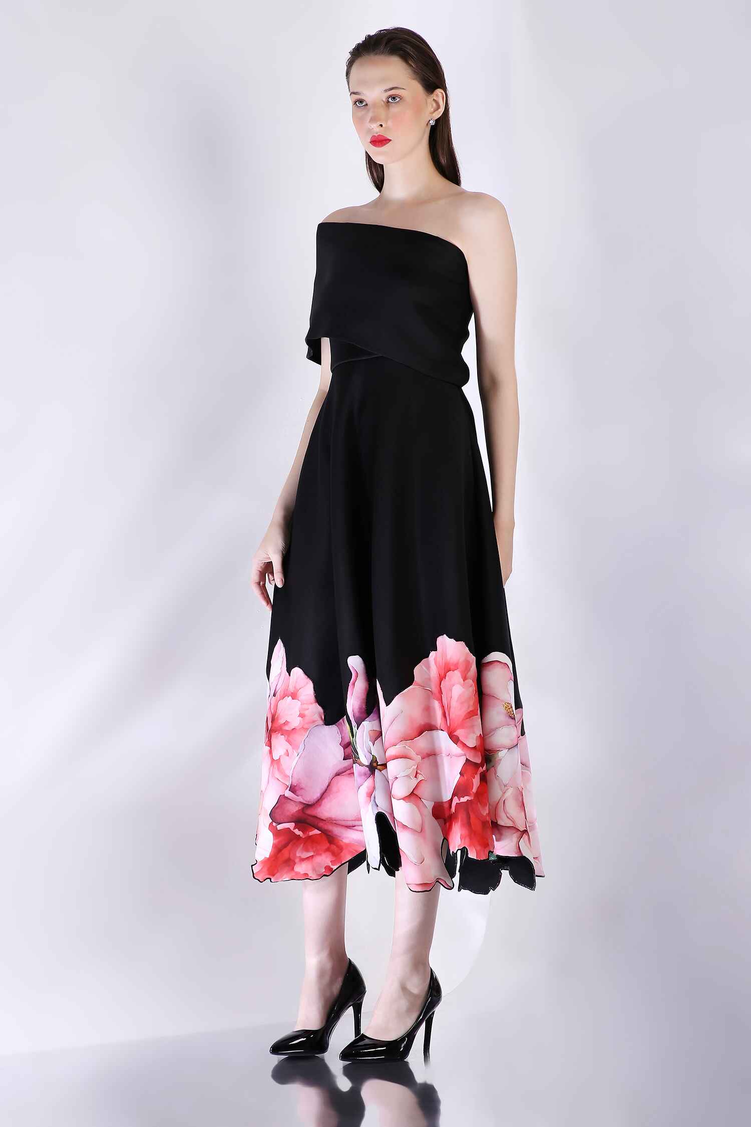 The Vivienne dress embodies subtle elegance with its intricate floral design, accentuated by cutwork around the hem and a flowing, mid-calf silhouette. Crafted from premium black neoprene fabric, it offers the perfect blend of comfort and sophistication.