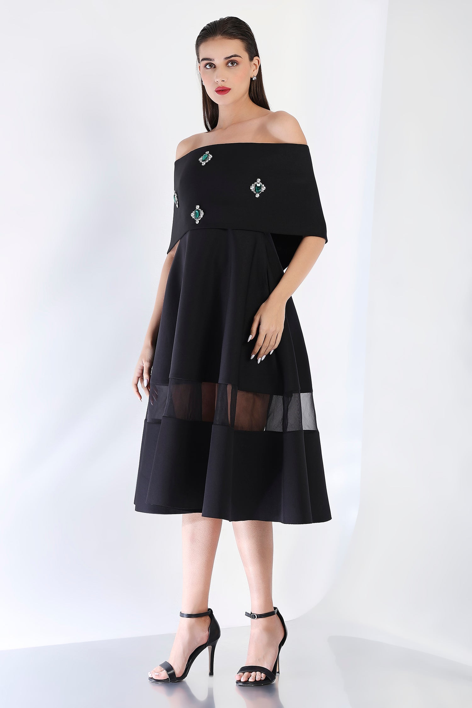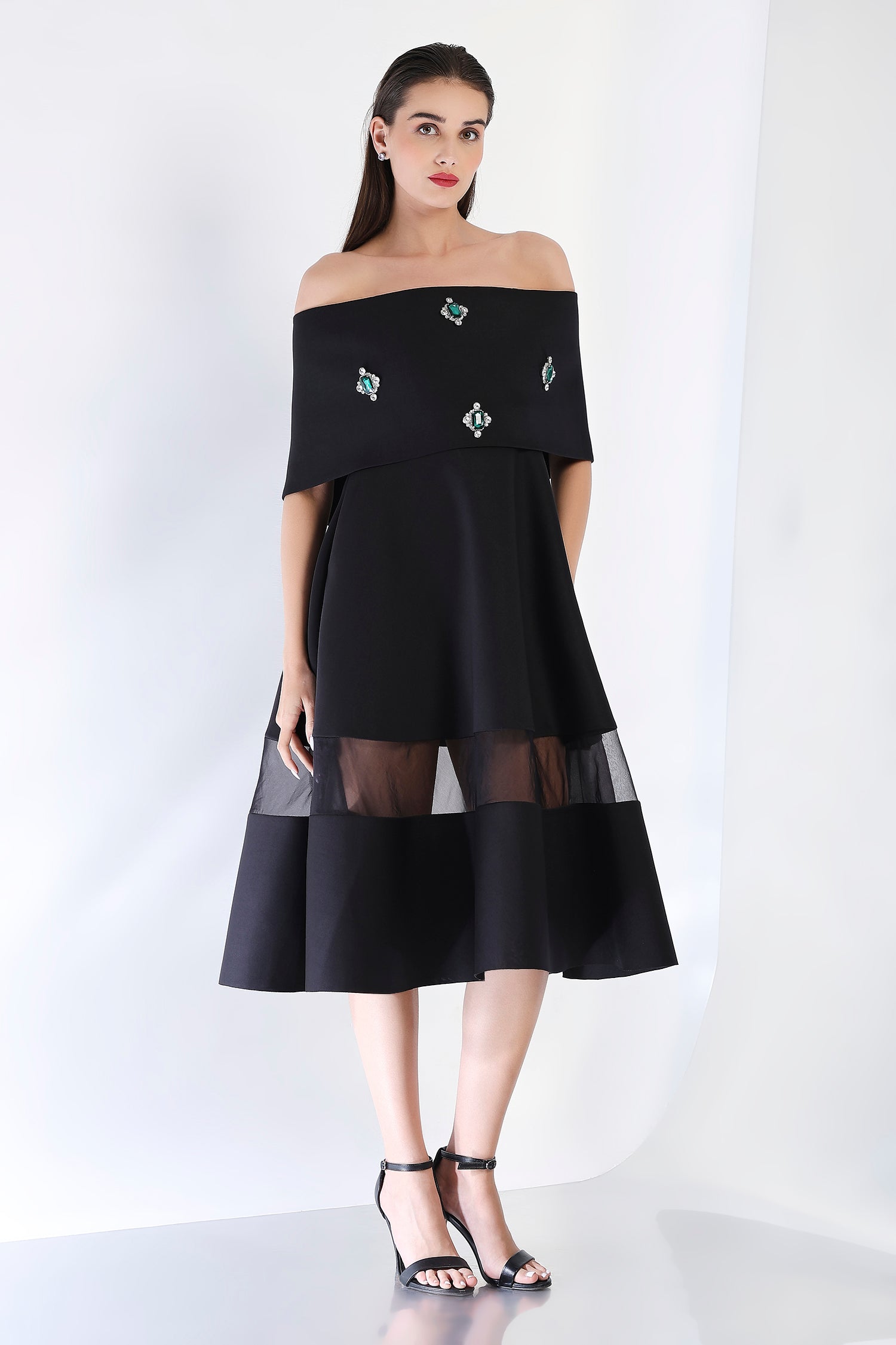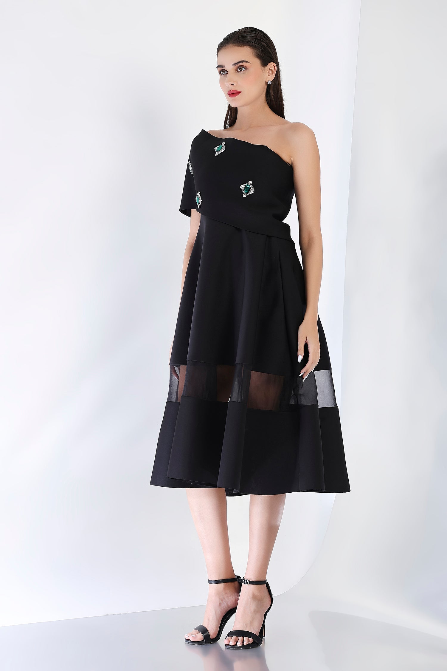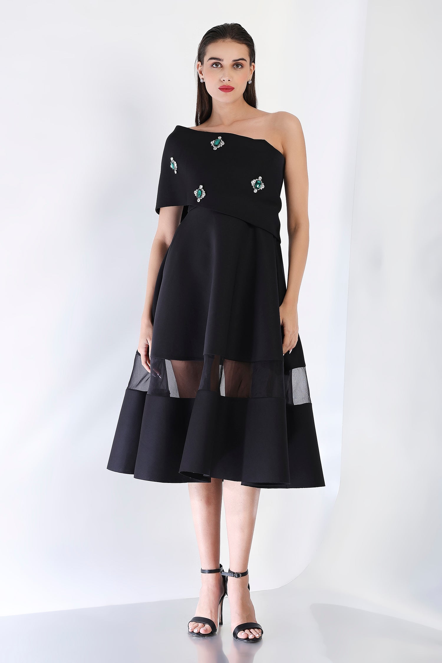 This striking strapless midi dress, with its flattering fit-and-flare silhouette and sheer organza detail panels, offers a refined look perfect for special occasions. Paired with an emerald-studded wrap, styled either one-shoulder or off-shoulder, this dress captures the essence of glamour and sophistication in one stunning ensemble.