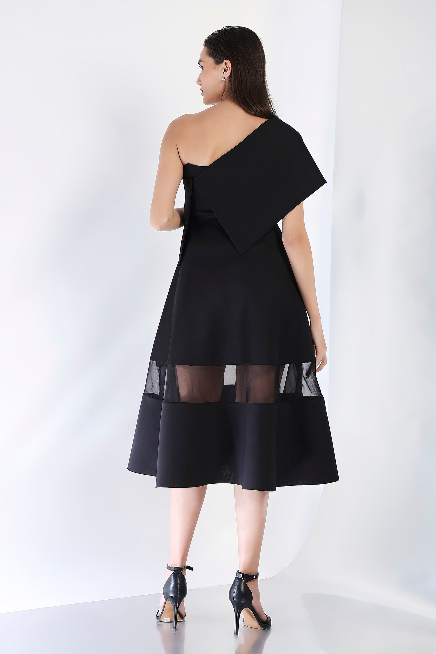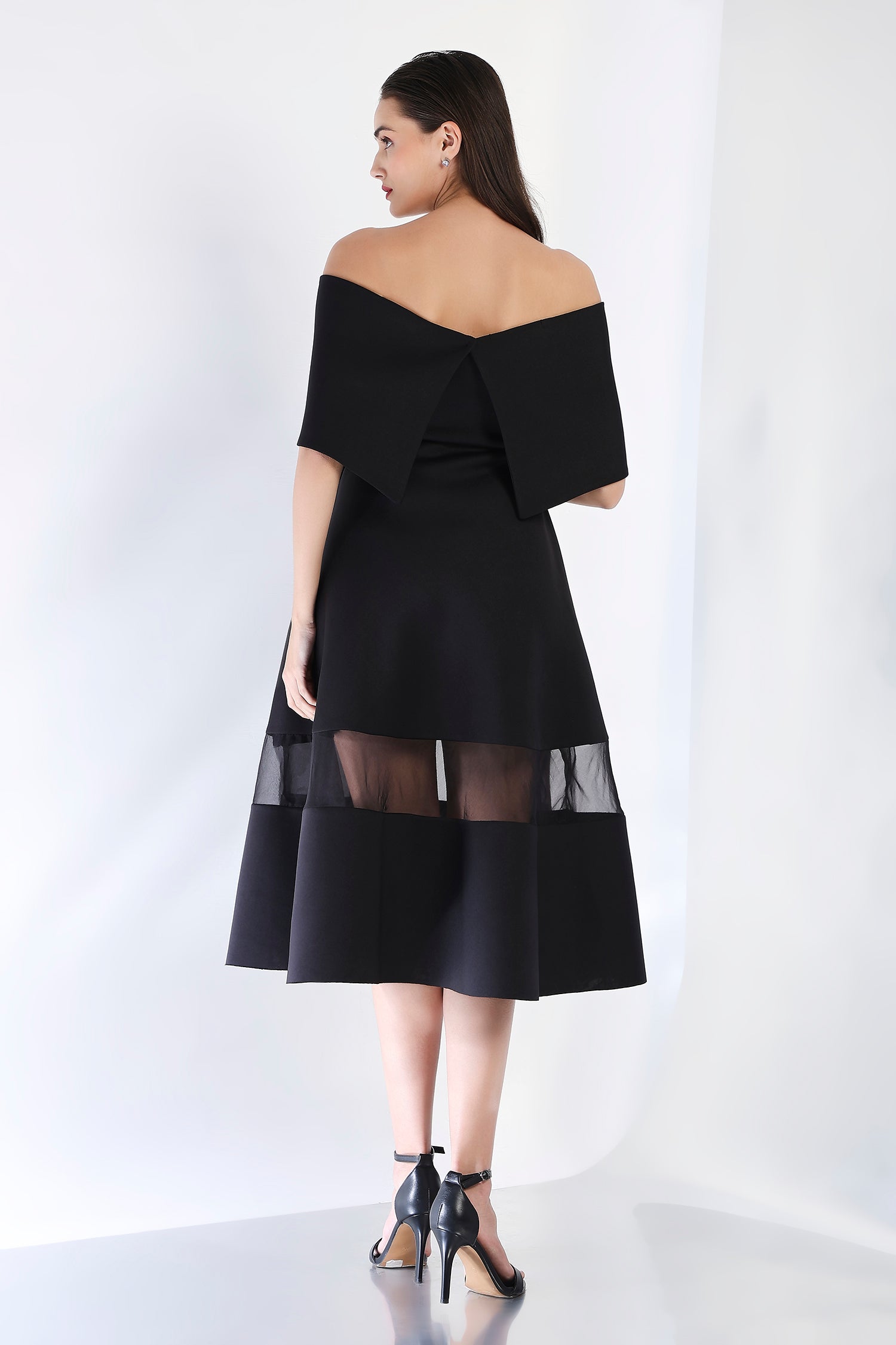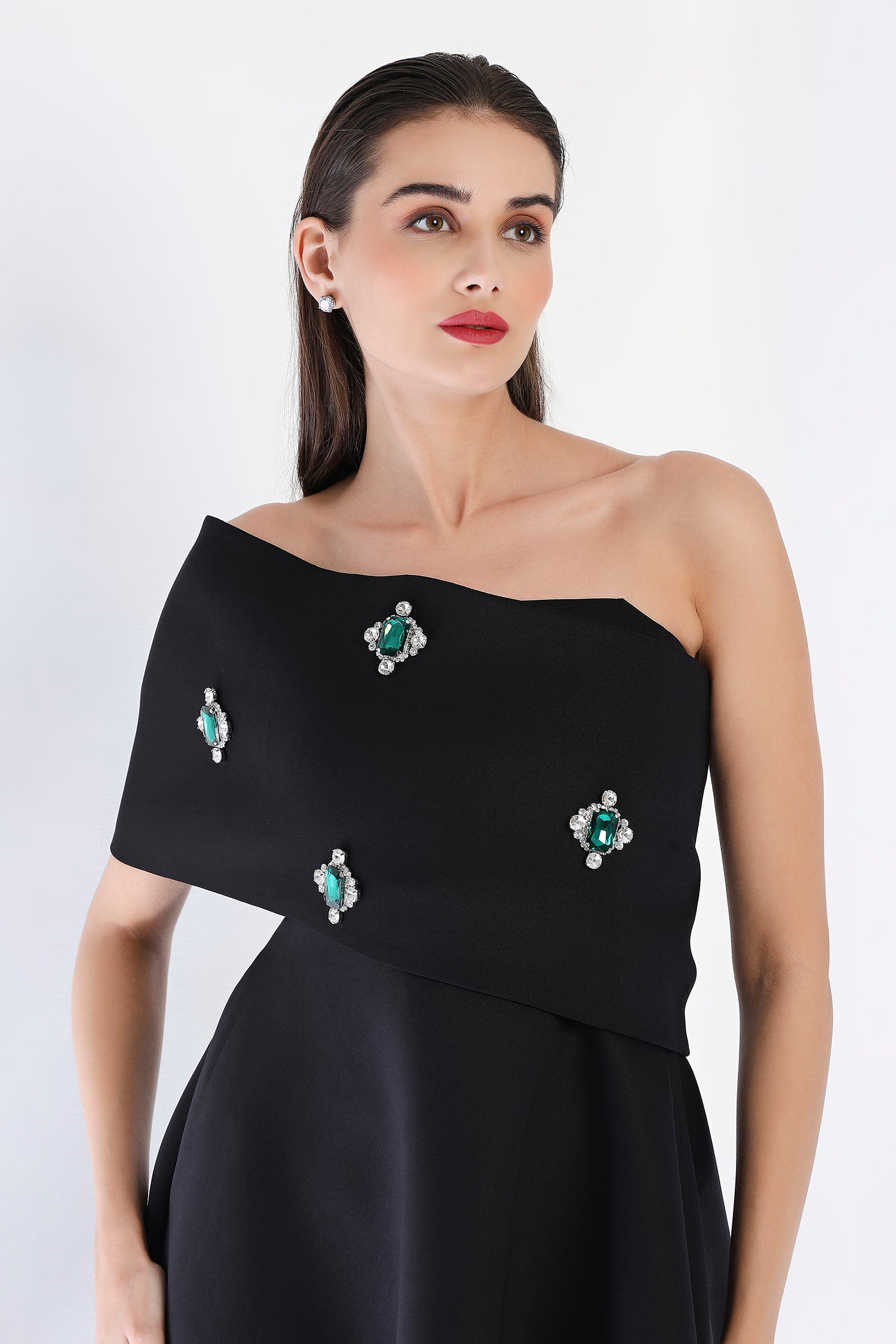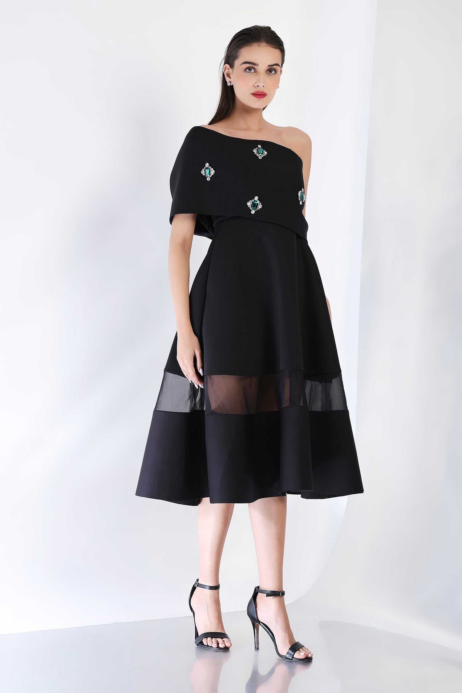 This striking strapless midi dress, with its flattering fit-and-flare silhouette and sheer organza detail panels, offers a refined look perfect for special occasions. Paired with an emerald-studded wrap, styled either one-shoulder or off-shoulder, this dress captures the essence of glamour and sophistication in one stunning ensemble.