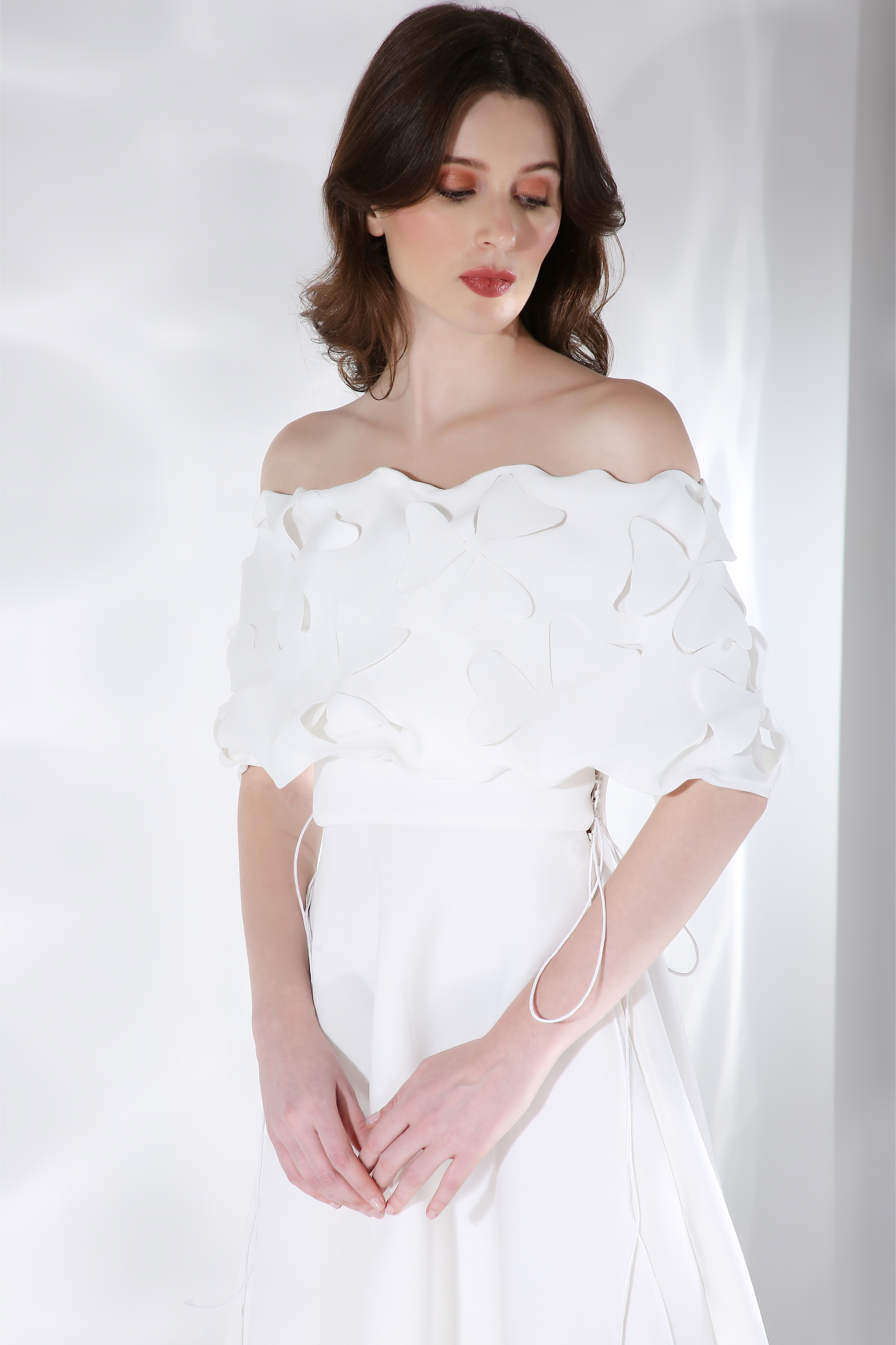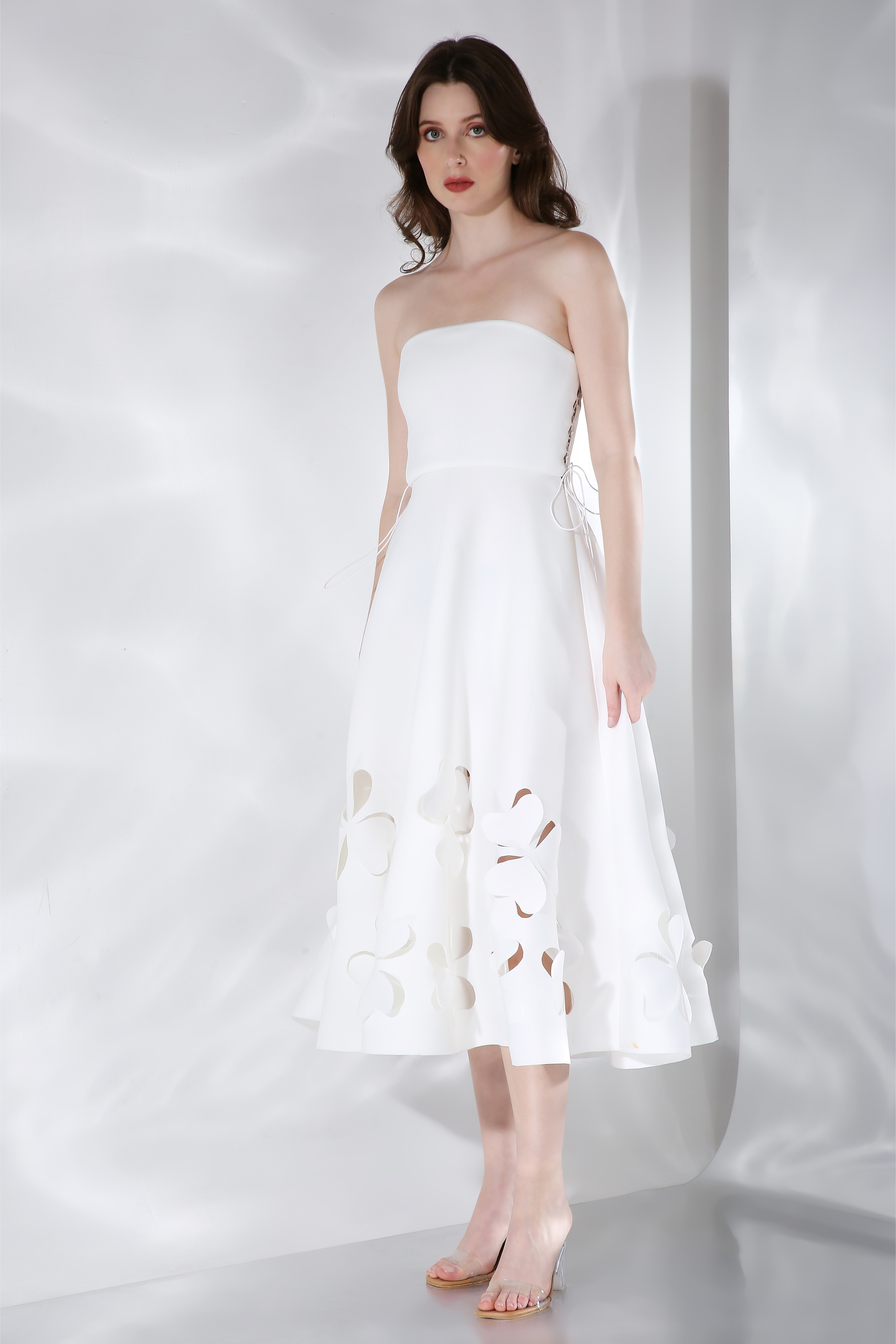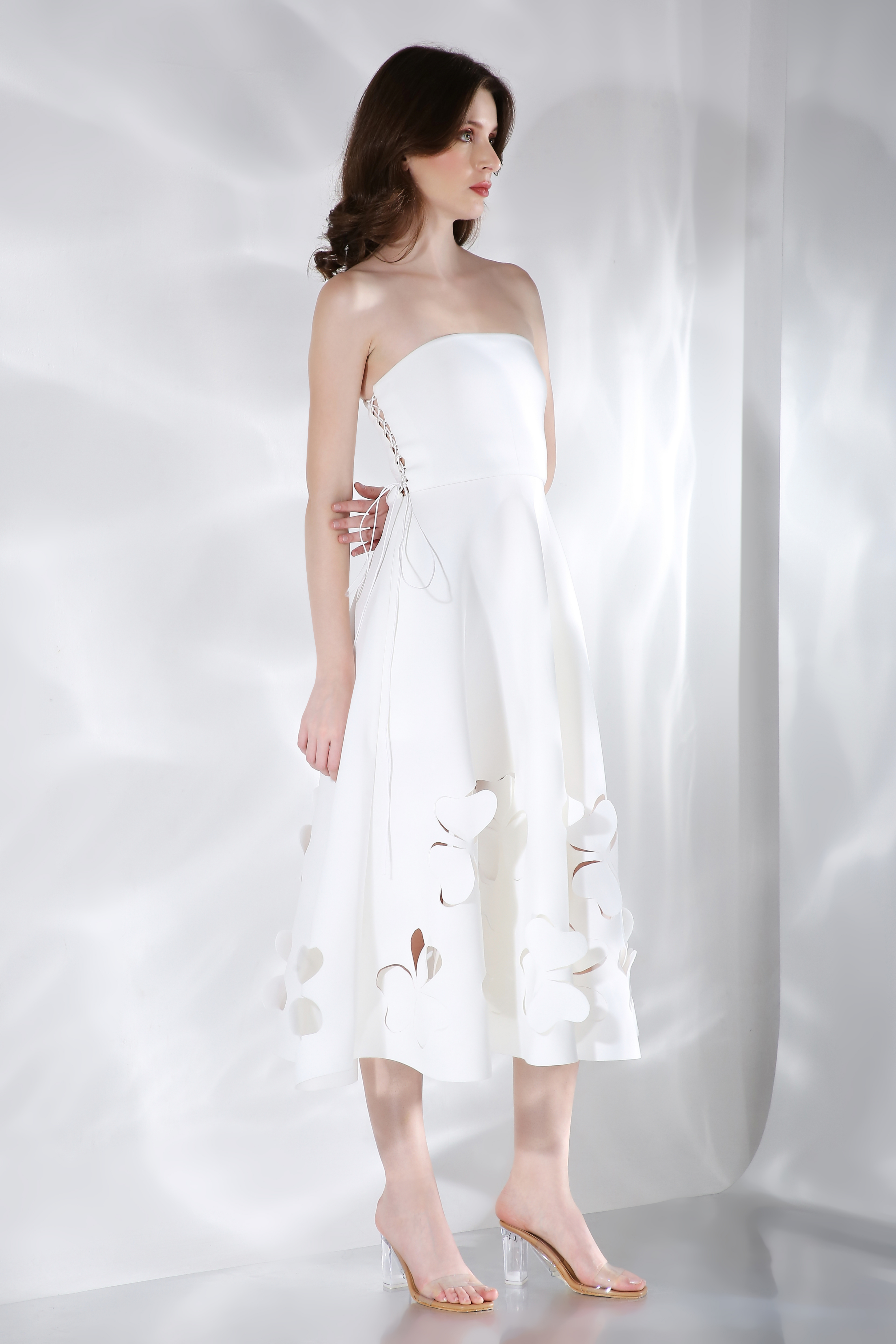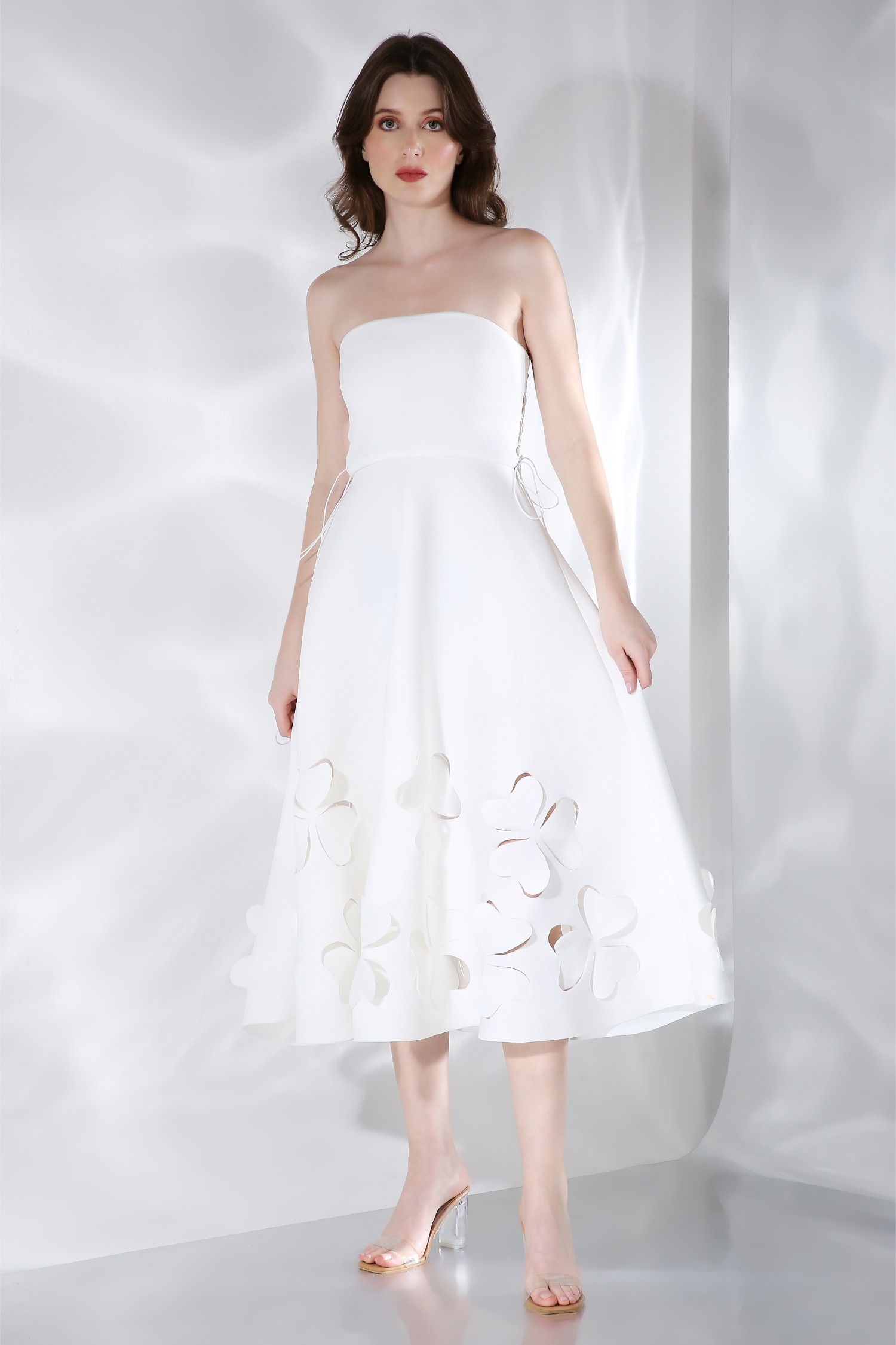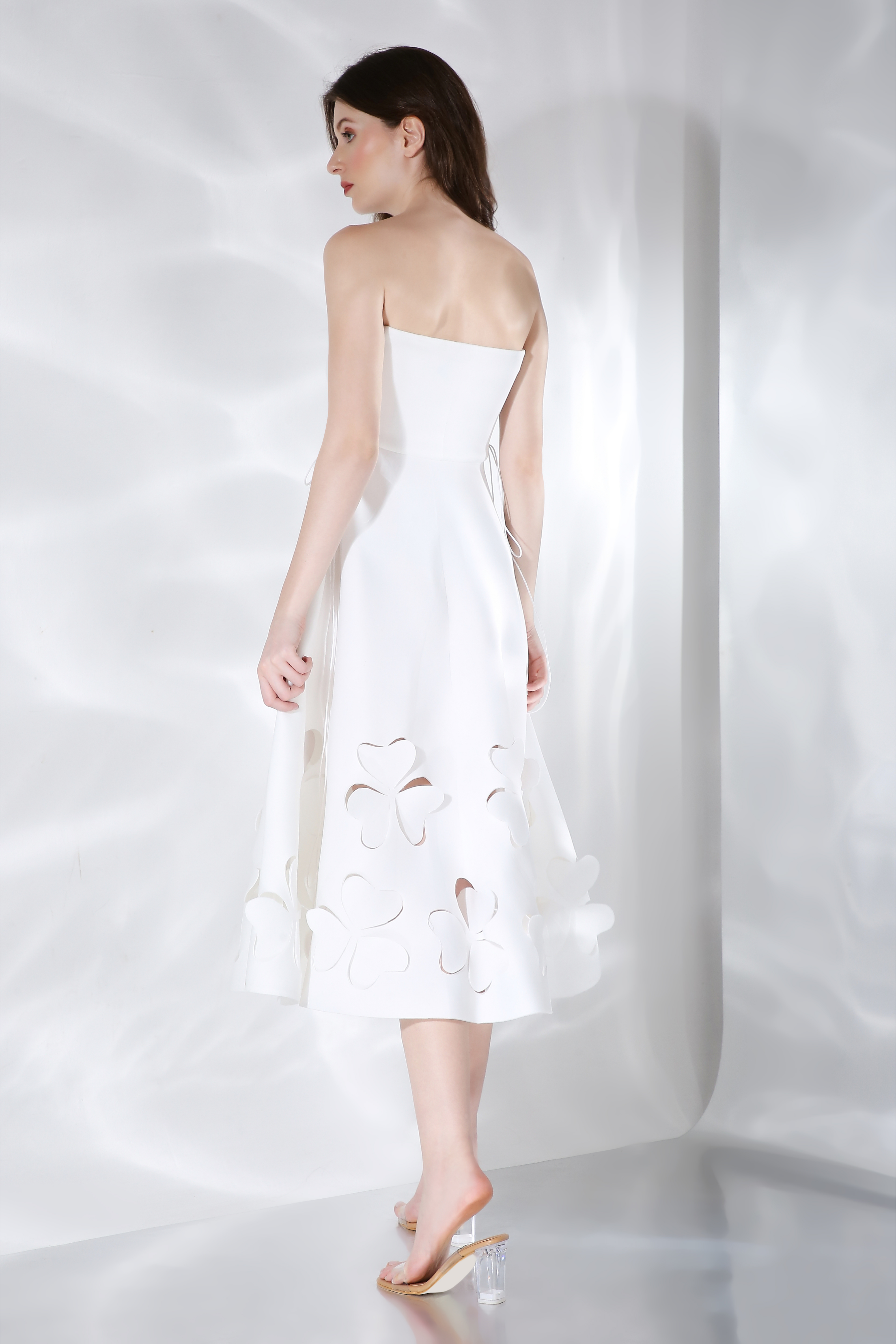Featuring a fit and flare midi dress with floral cut-outs intricately done by hand. Wearable in two ways,