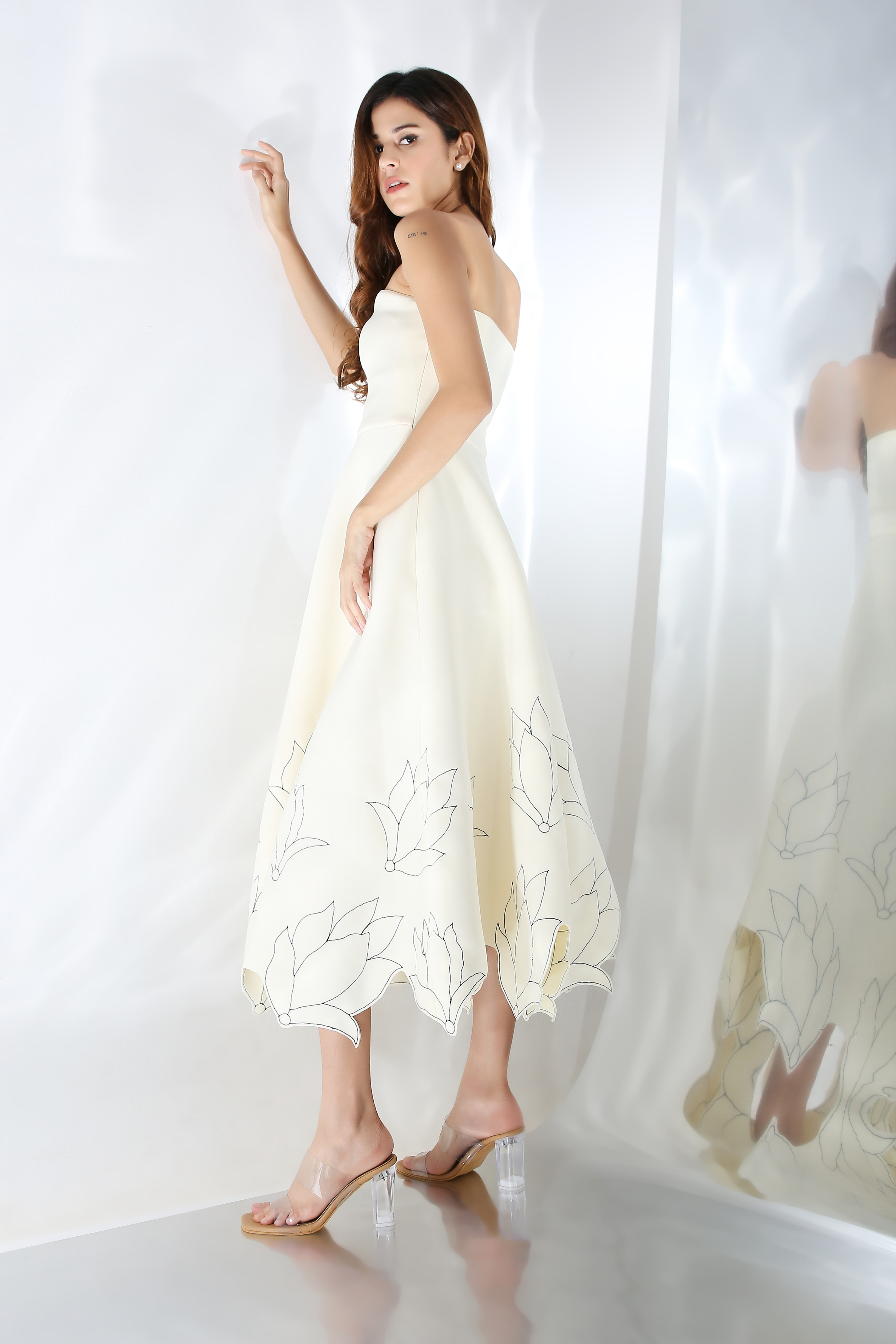 Featuring a fit and flare dress with floral hand embroidery and cutouts on the base dress. Wear it in two ways,
