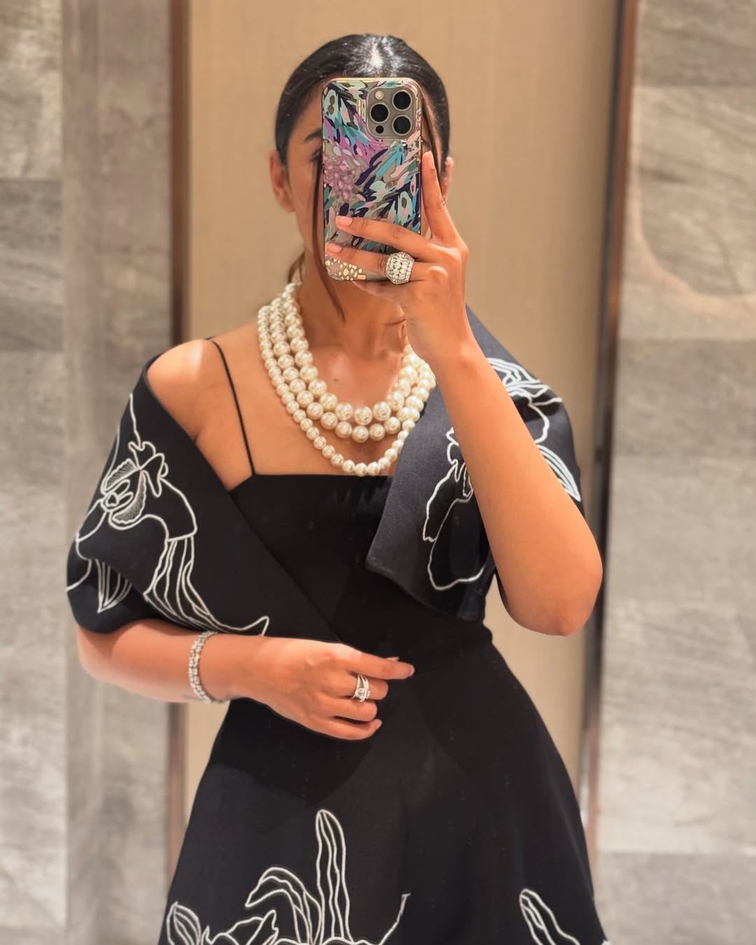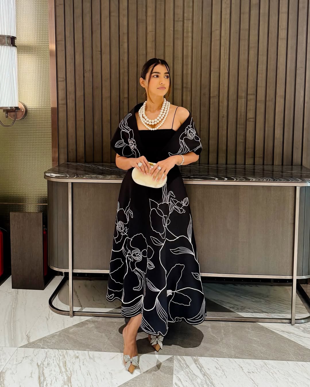 It comes paired with a versatile embroidered wrap, designed to be styled either one-shoulder or off-shoulder — letting you switch from classic to contemporary with ease.