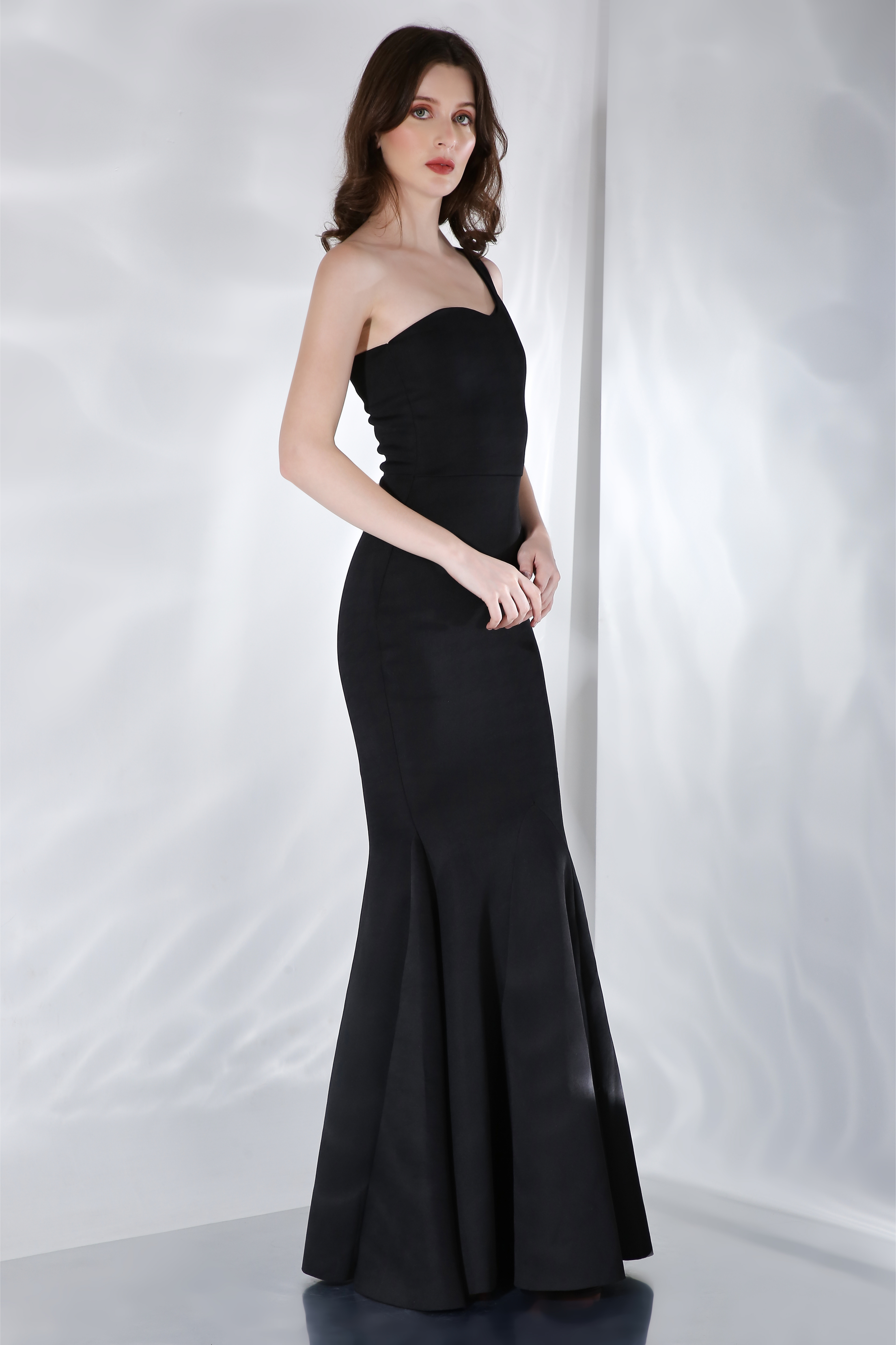 Featuring a one shoulder panelled gown which accentuates your body in a fish cut silhouette. Hugging all your curves perfectly with a flattering fit, since is a made-to-measure product, you can also specify the exact length desired by you.