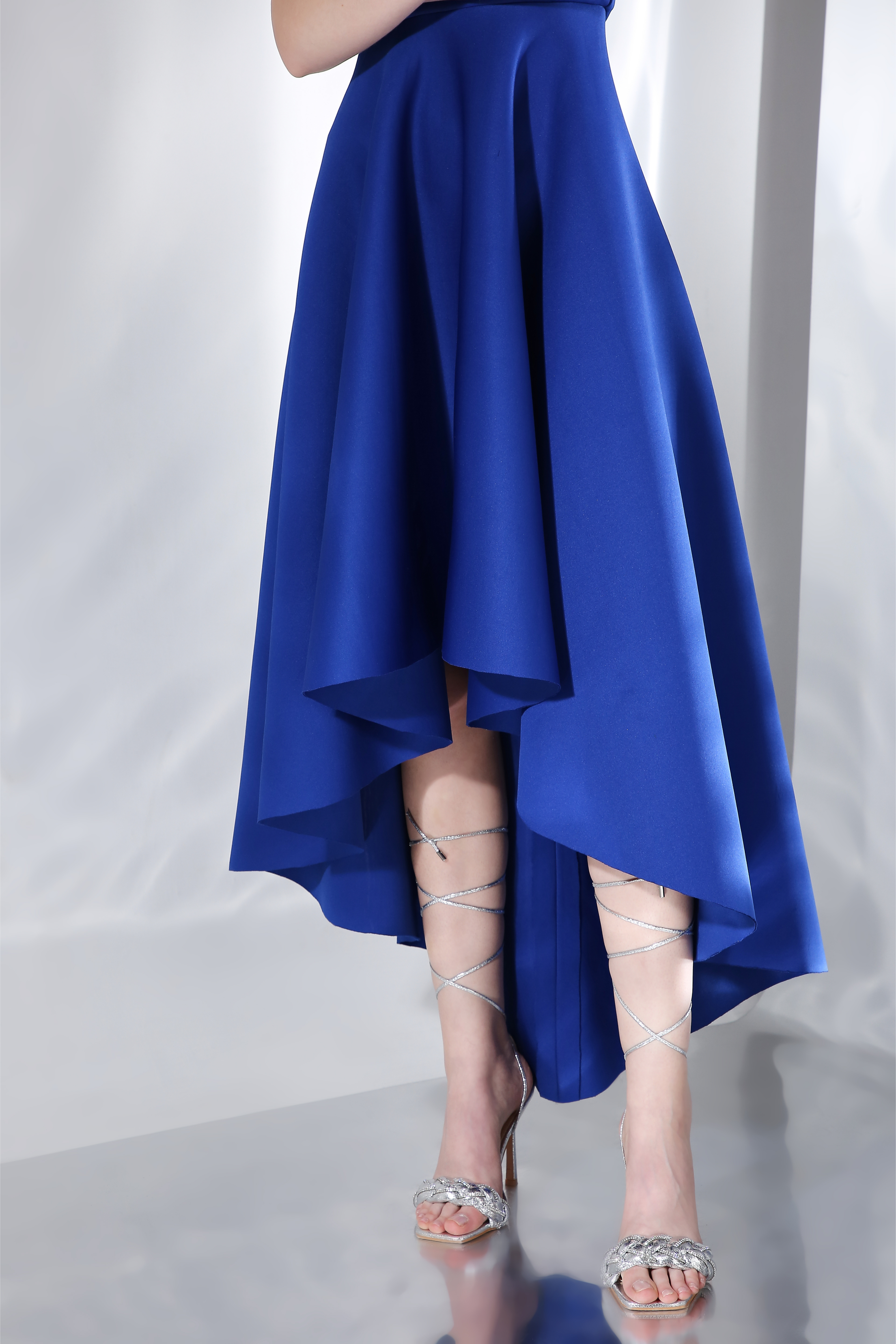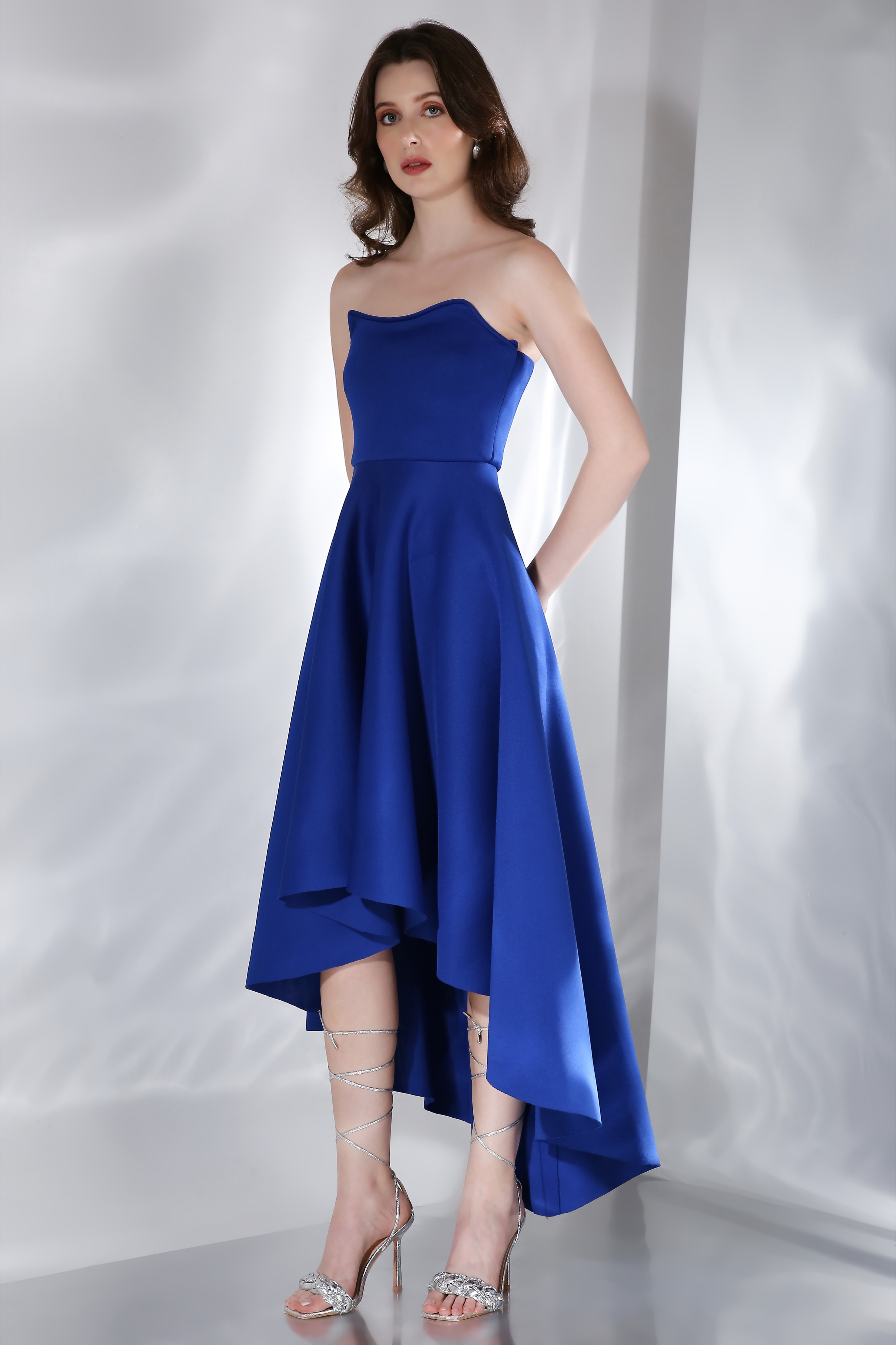 Featuring our best-selling silhouette, a strapless dress which is fitted upto the bust and flares out thereafter in a high-low fashion.