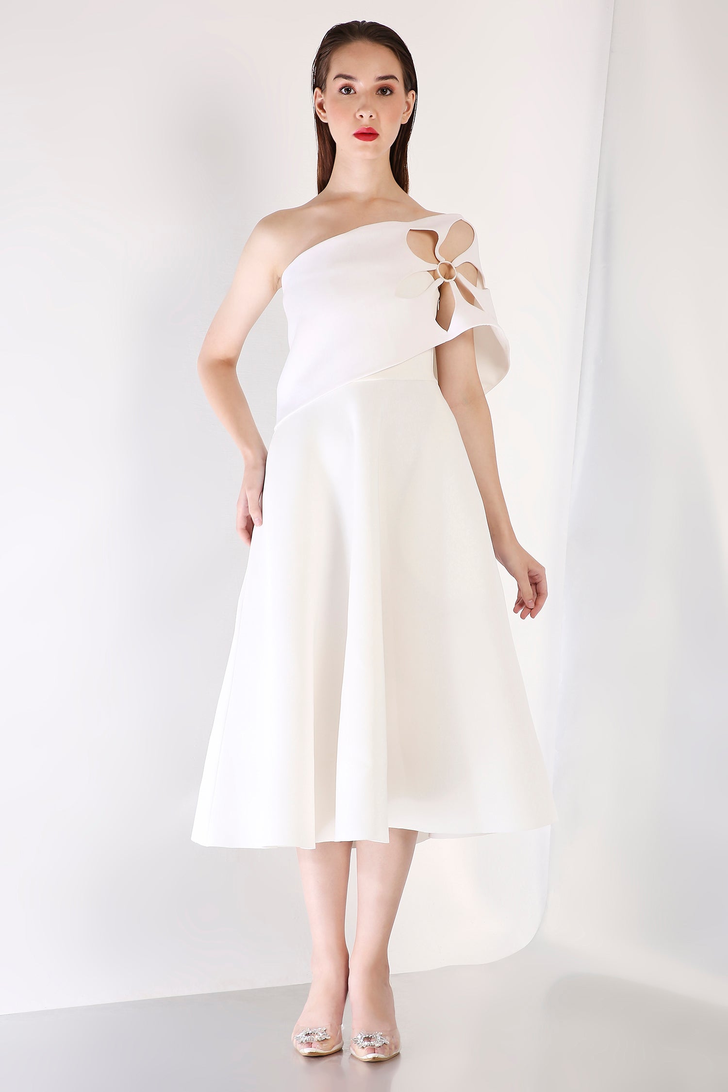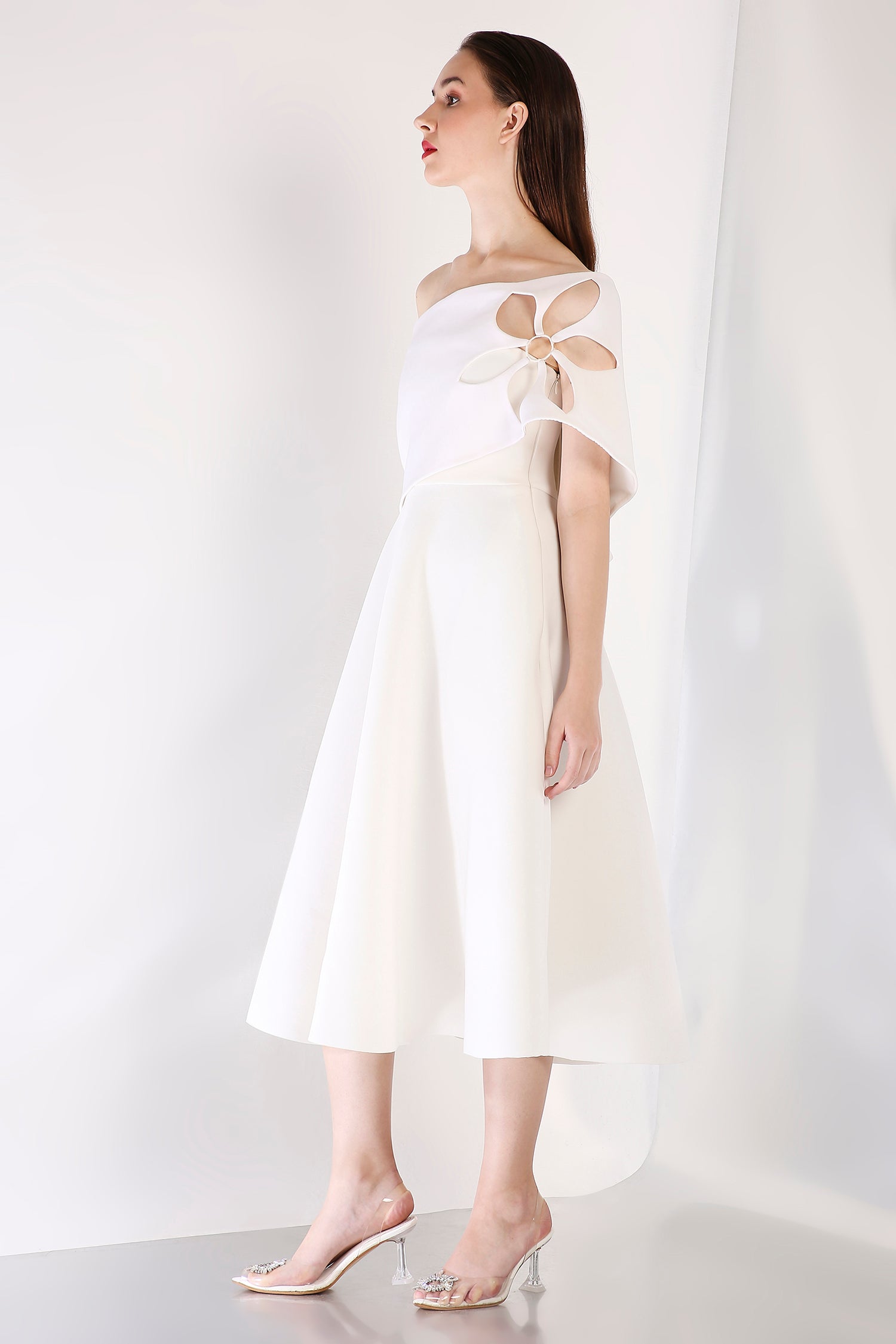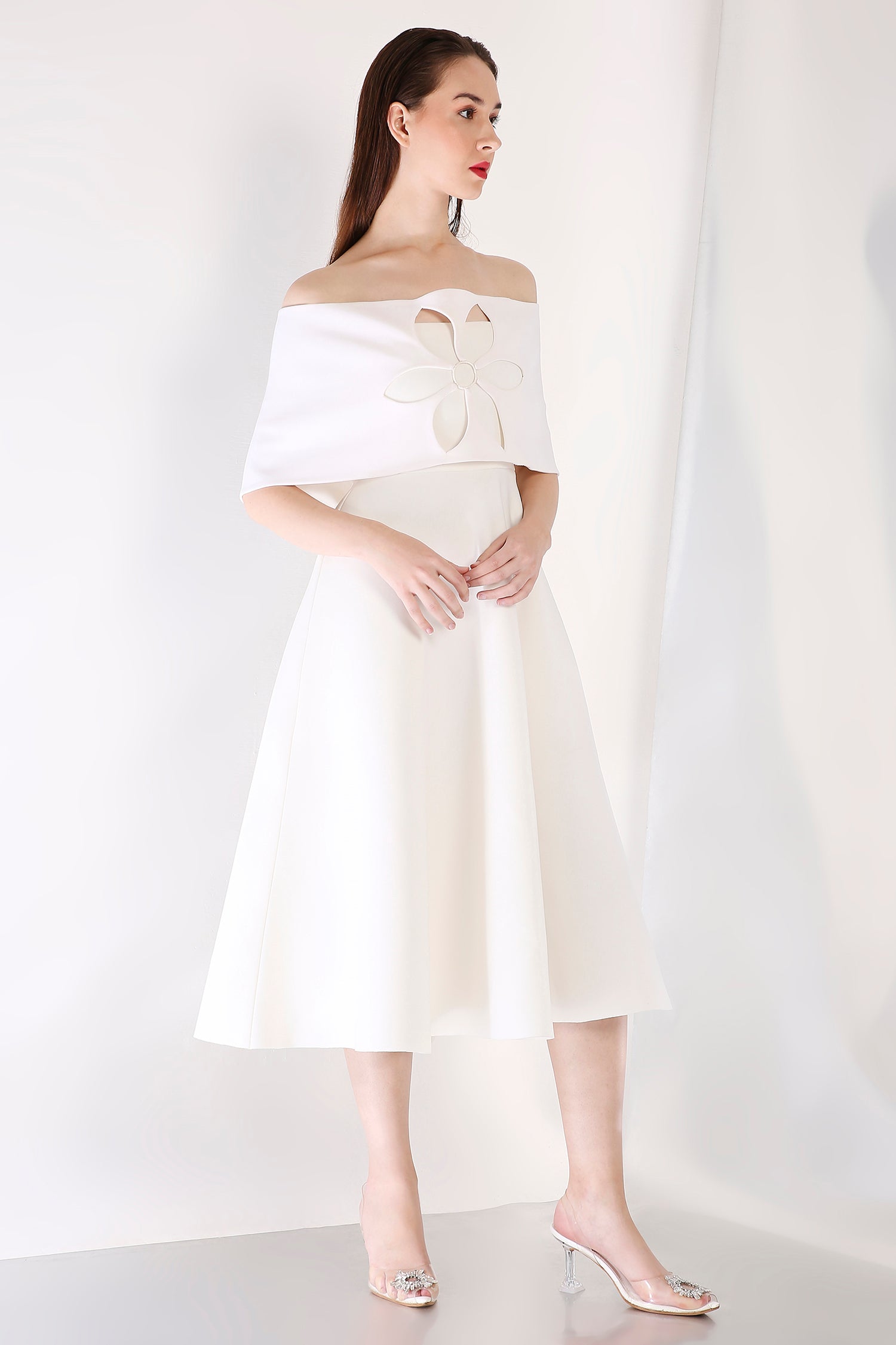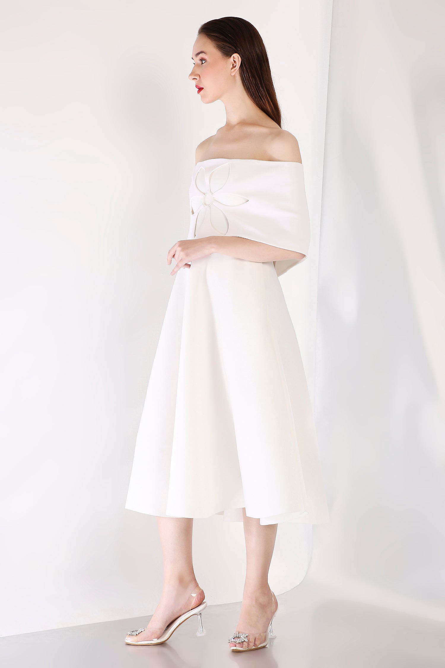 Embrace a new level of elegance with this strapless midi dress featuring a classic fit-and-flare silhouette, paired with a daffodil cutout wrap. The wrap is versatile, offering two styling options—one-shoulder or off-shoulder—and adds a unique, fresh touch to this timeless design.