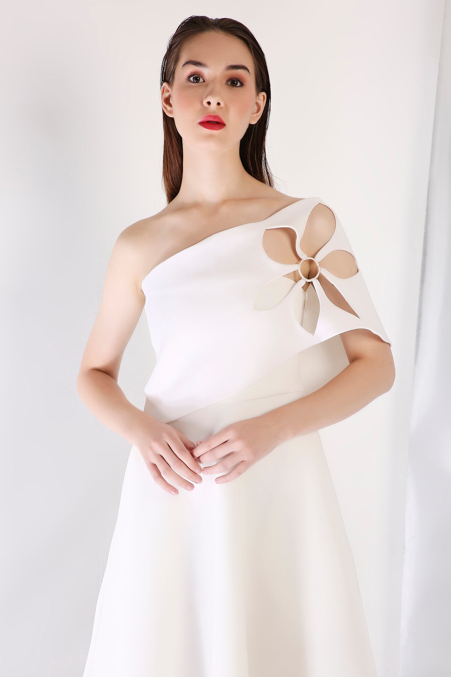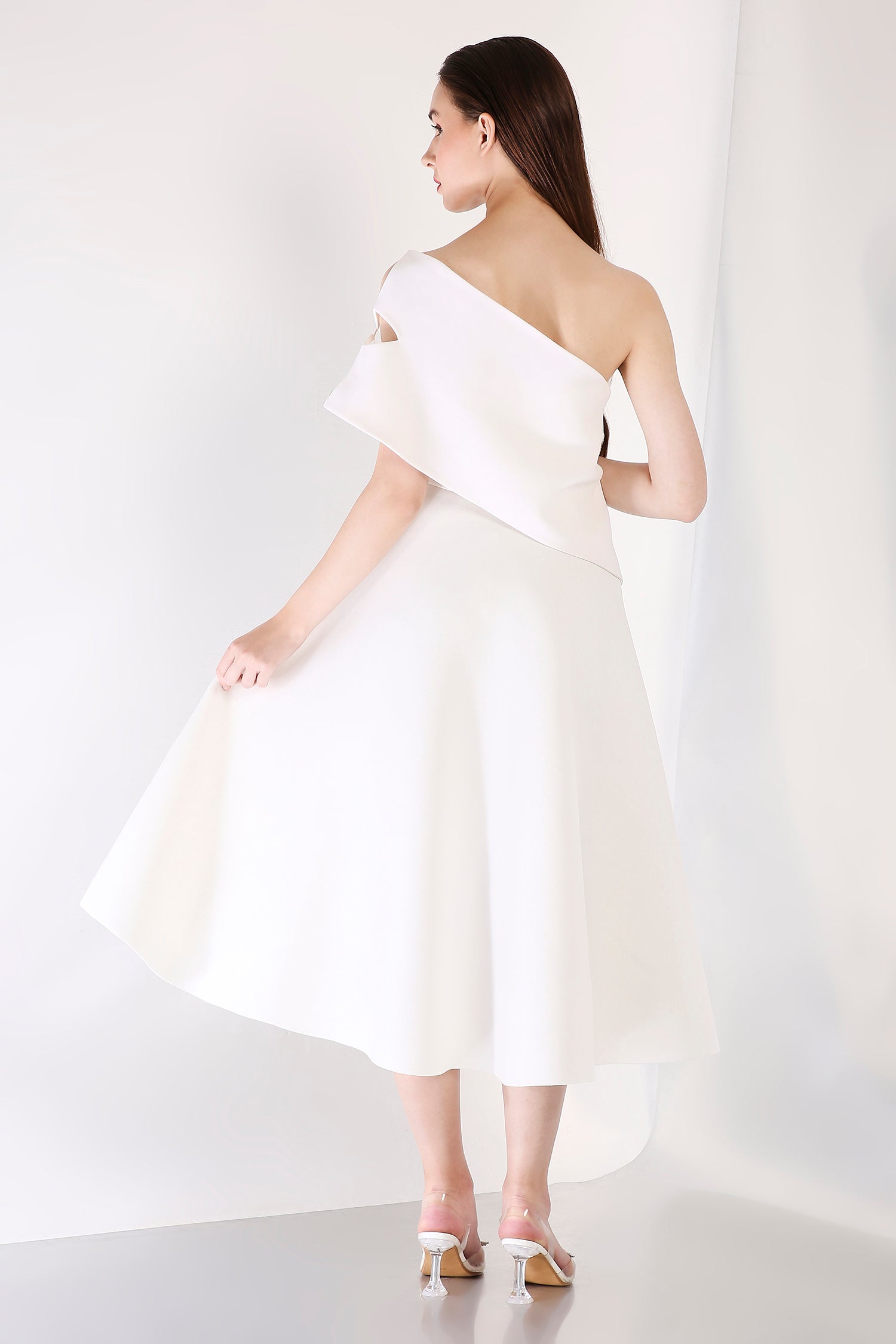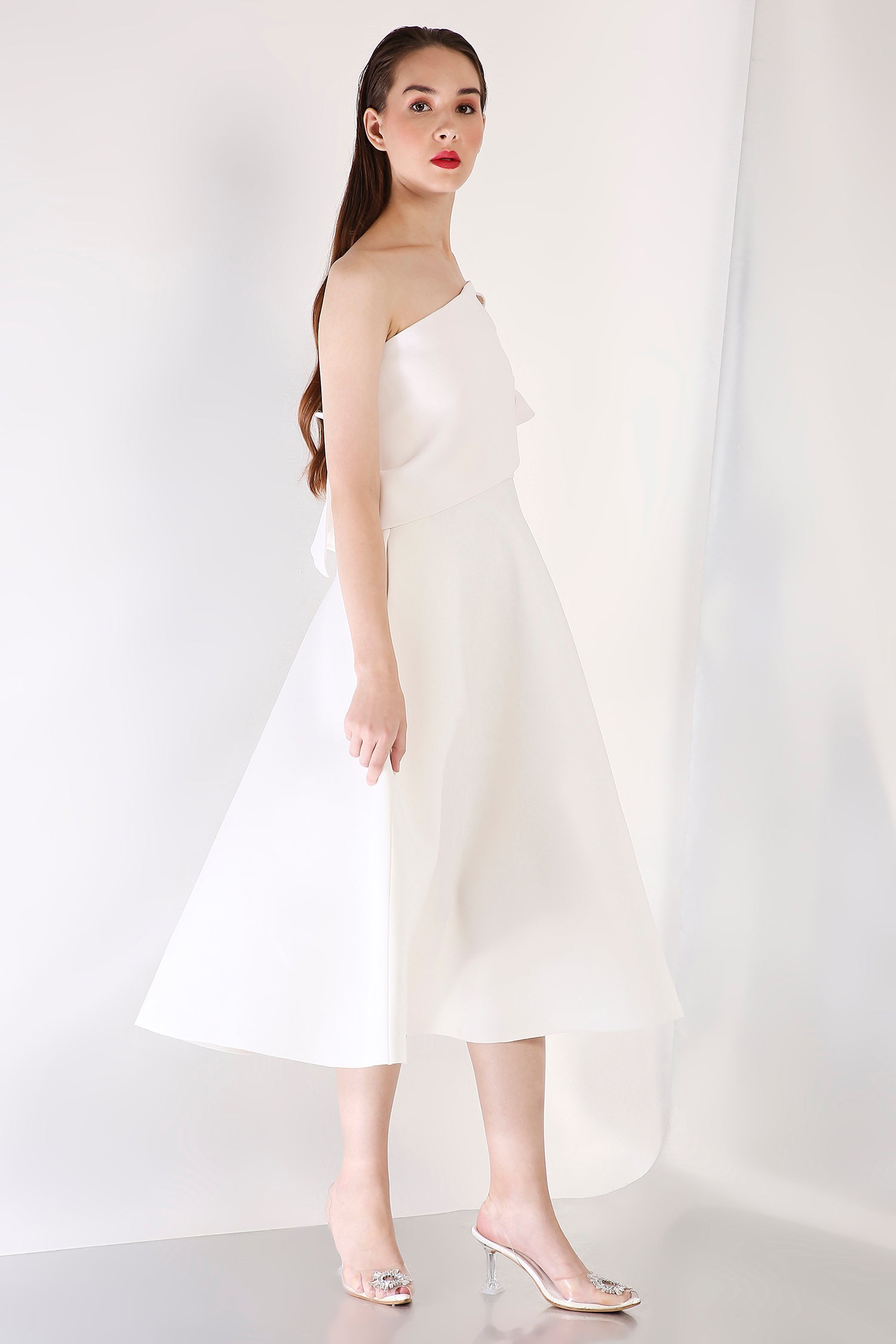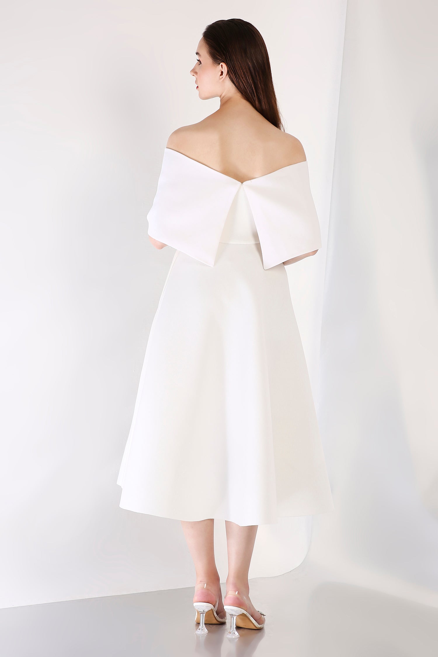 Embrace a new level of elegance with this strapless midi dress featuring a classic fit-and-flare silhouette, paired with a daffodil cutout wrap. The wrap is versatile, offering two styling options—one-shoulder or off-shoulder—and adds a unique, fresh touch to this timeless design.