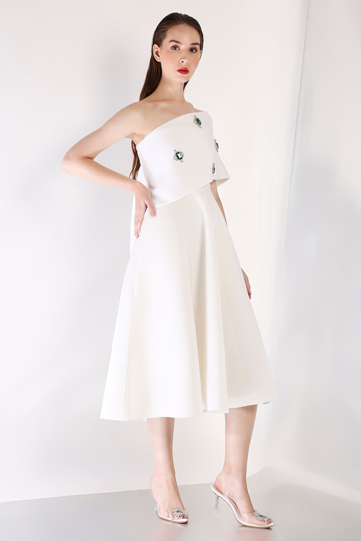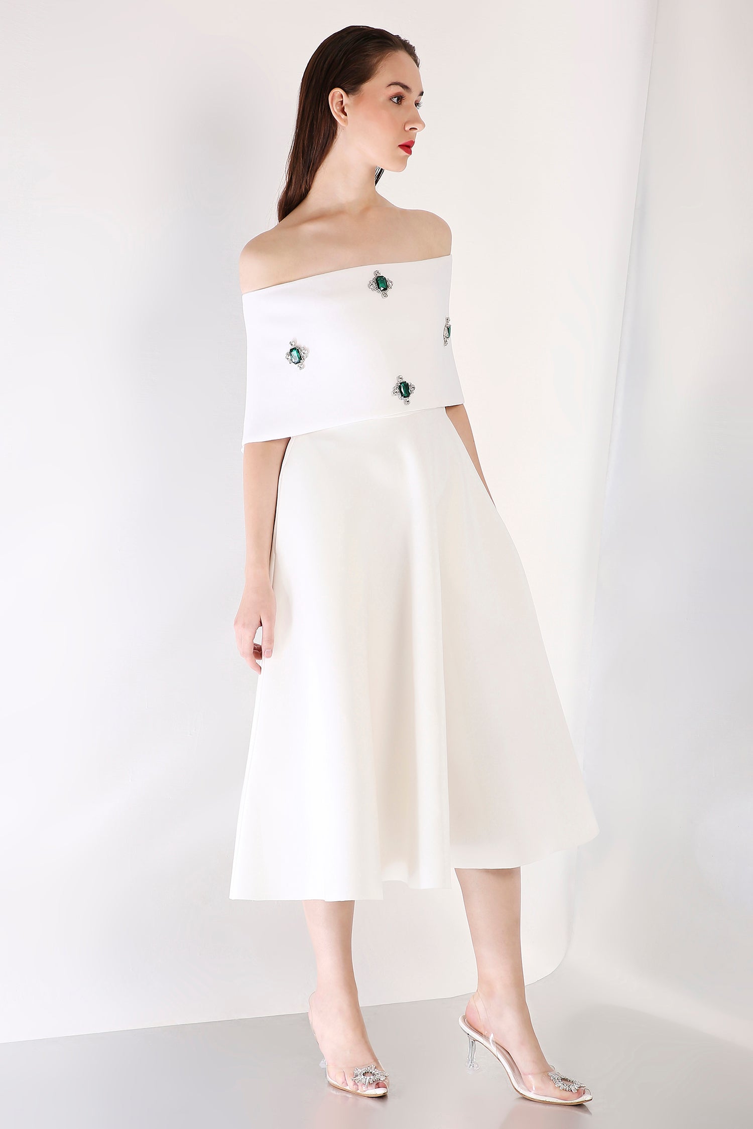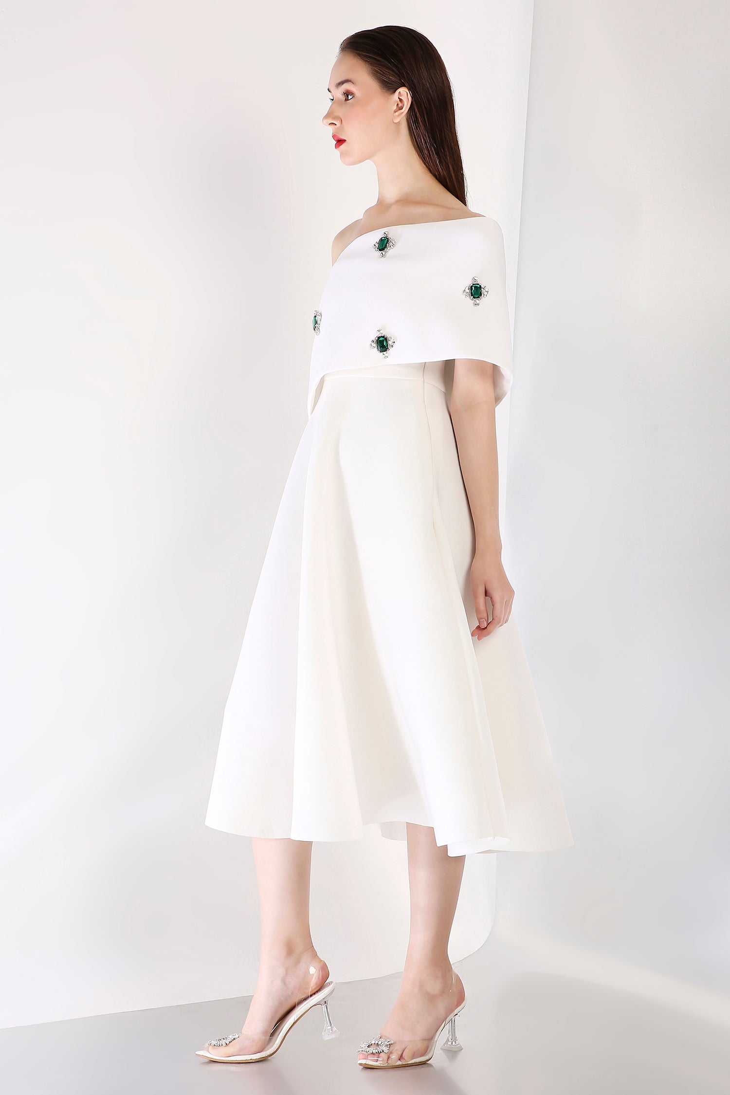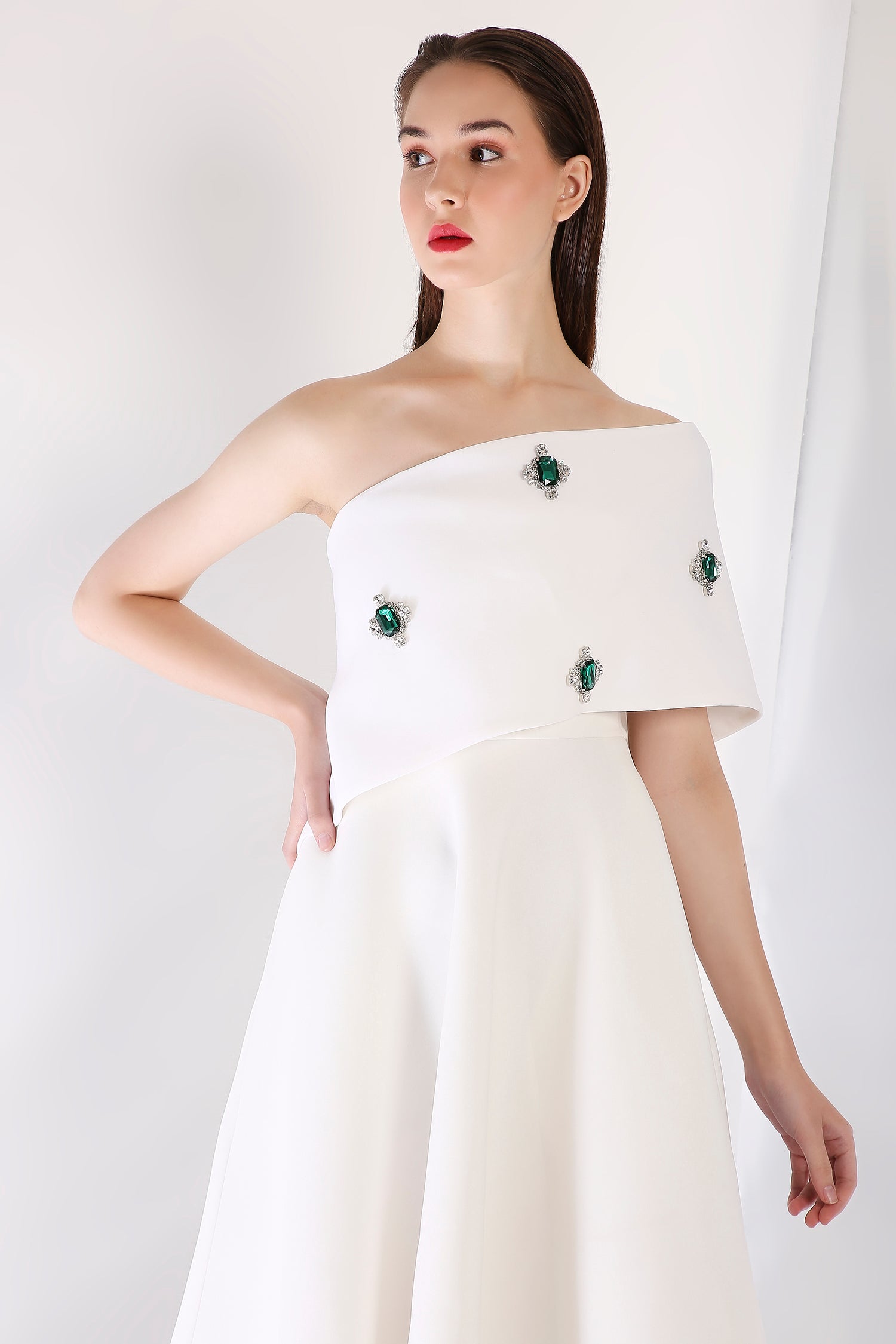 Designed with precision, this strapless midi dress features an elegant fit-and-flare silhouette and is paired with a luxurious emerald studded wrap. The wrap can be styled in two distinct ways—one-shoulder or off-shoulder—infusing your look with a touch of glamour and refined sophistication.
