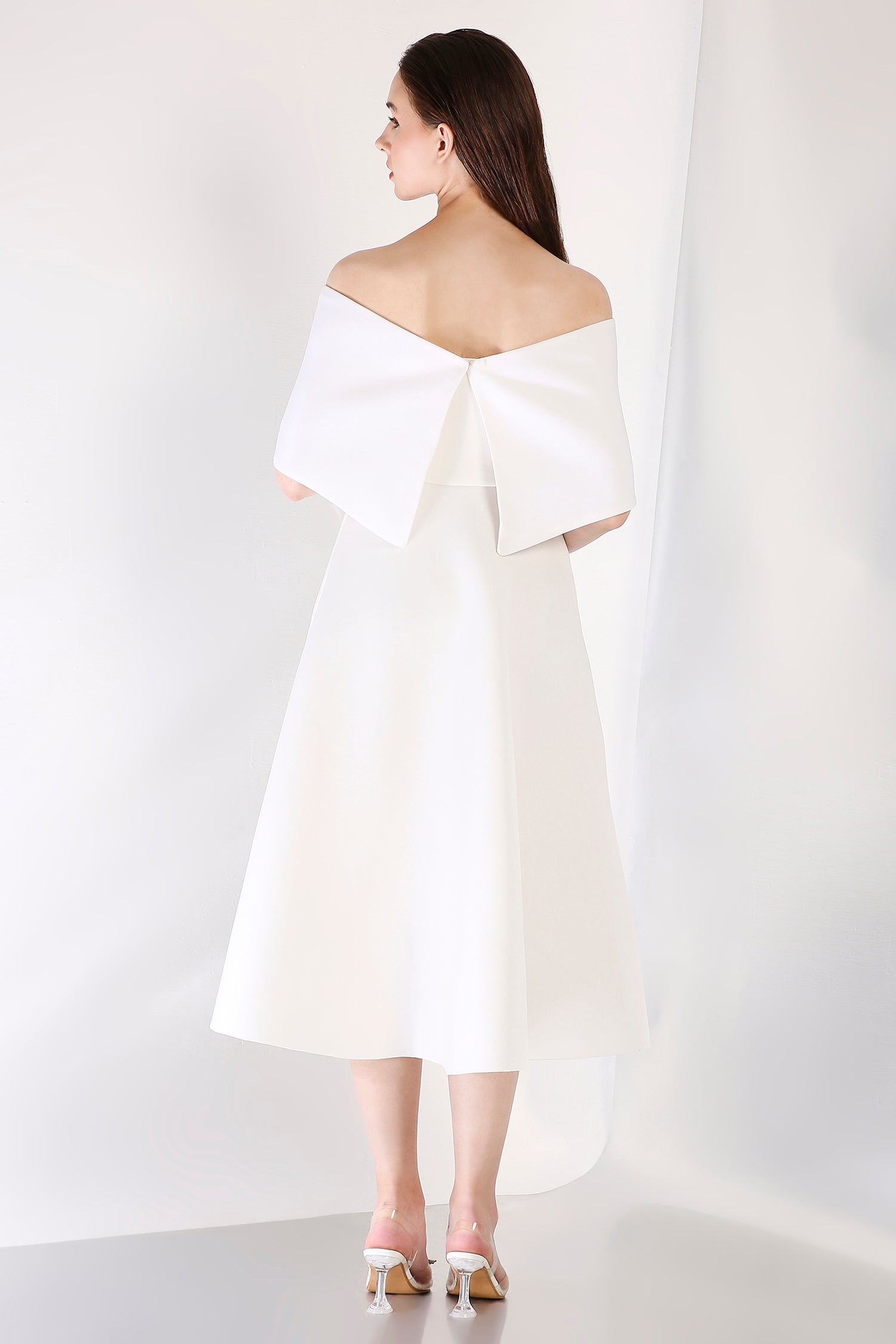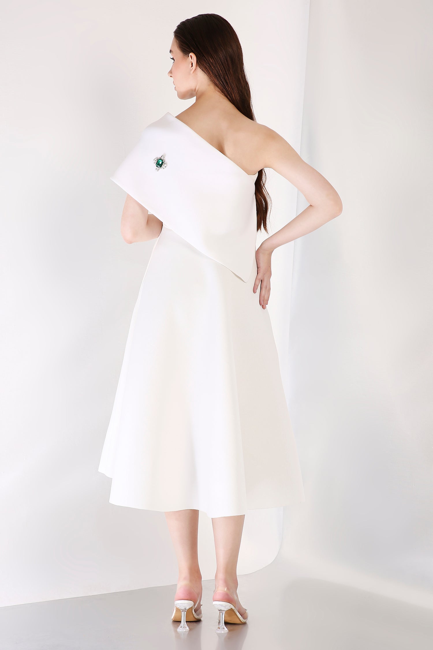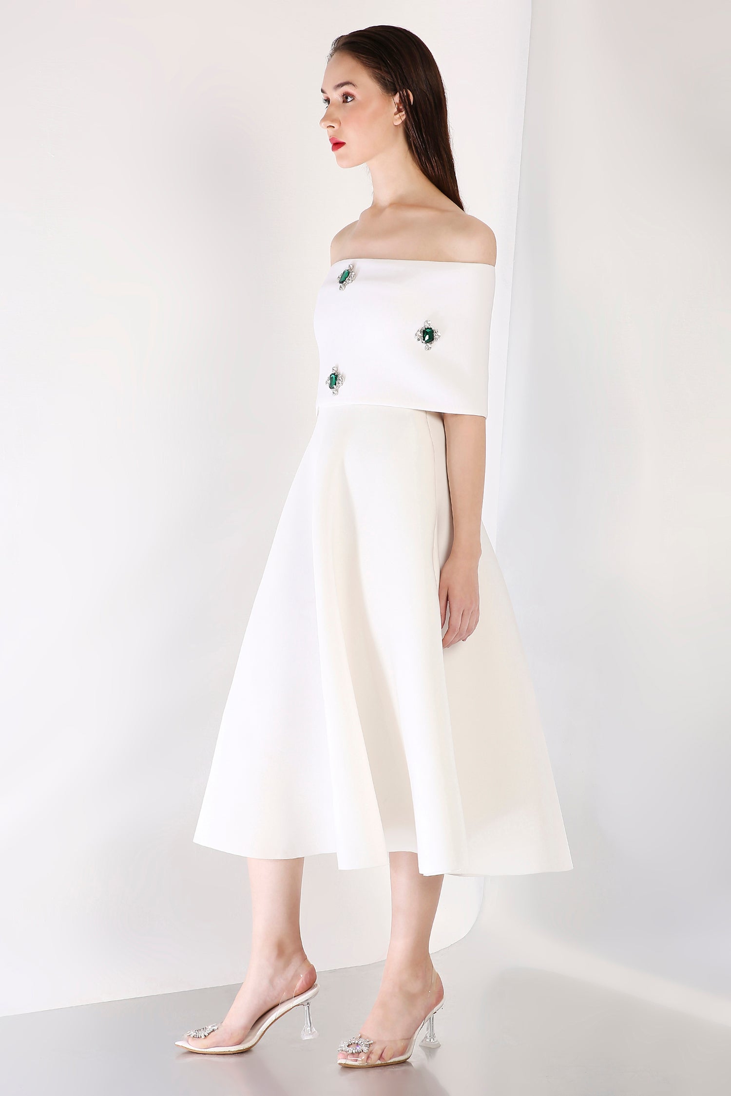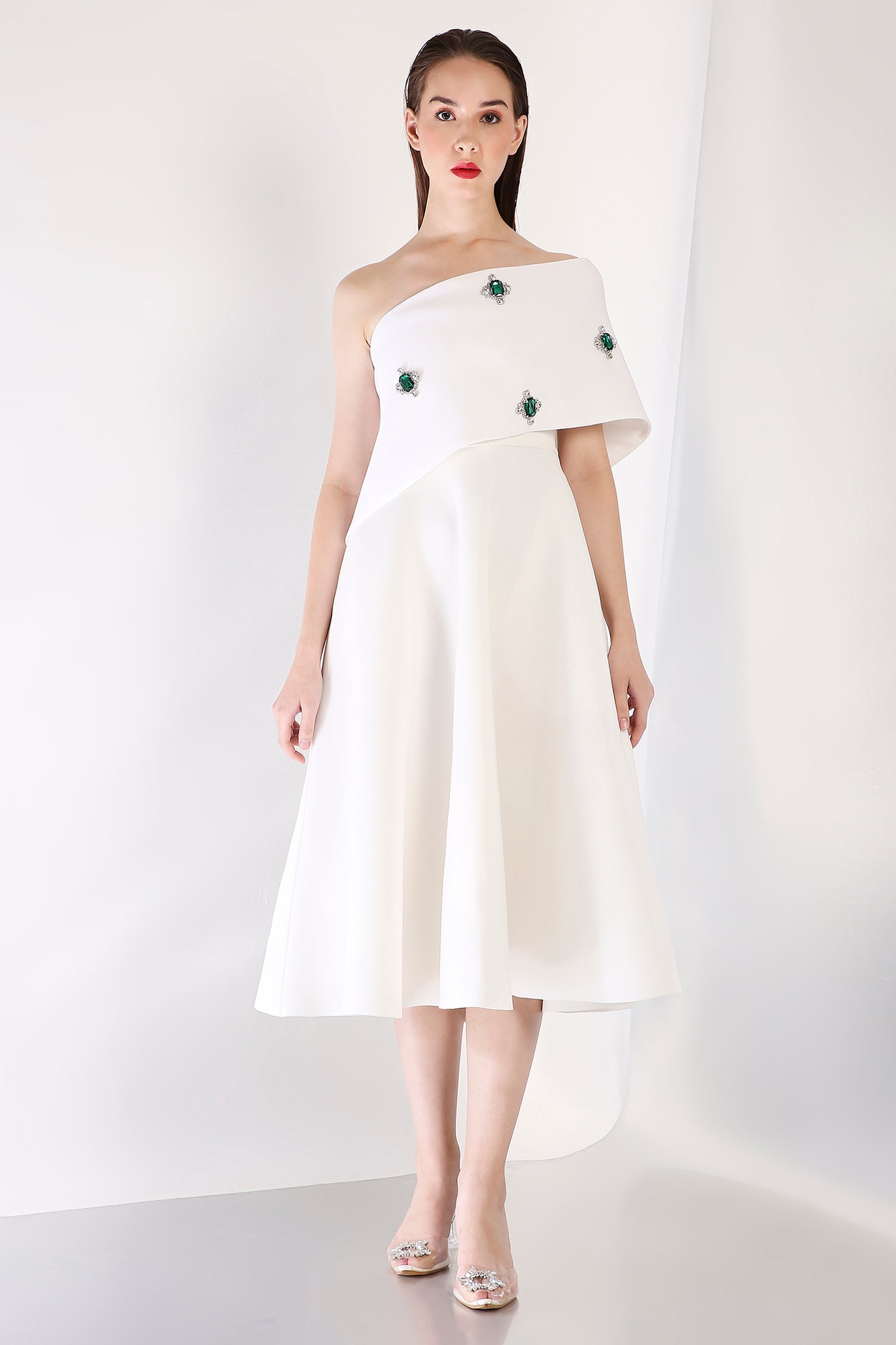 Designed with precision, this strapless midi dress features an elegant fit-and-flare silhouette and is paired with a luxurious emerald studded wrap. The wrap can be styled in two distinct ways—one-shoulder or off-shoulder—infusing your look with a touch of glamour and refined sophistication.
