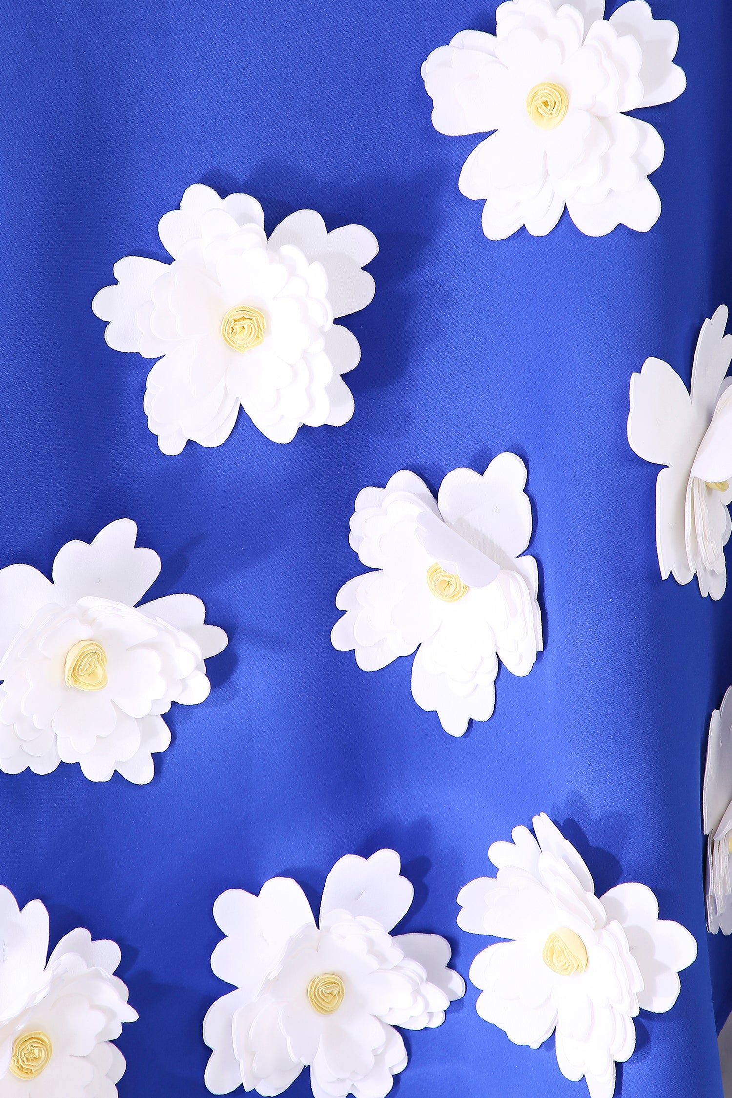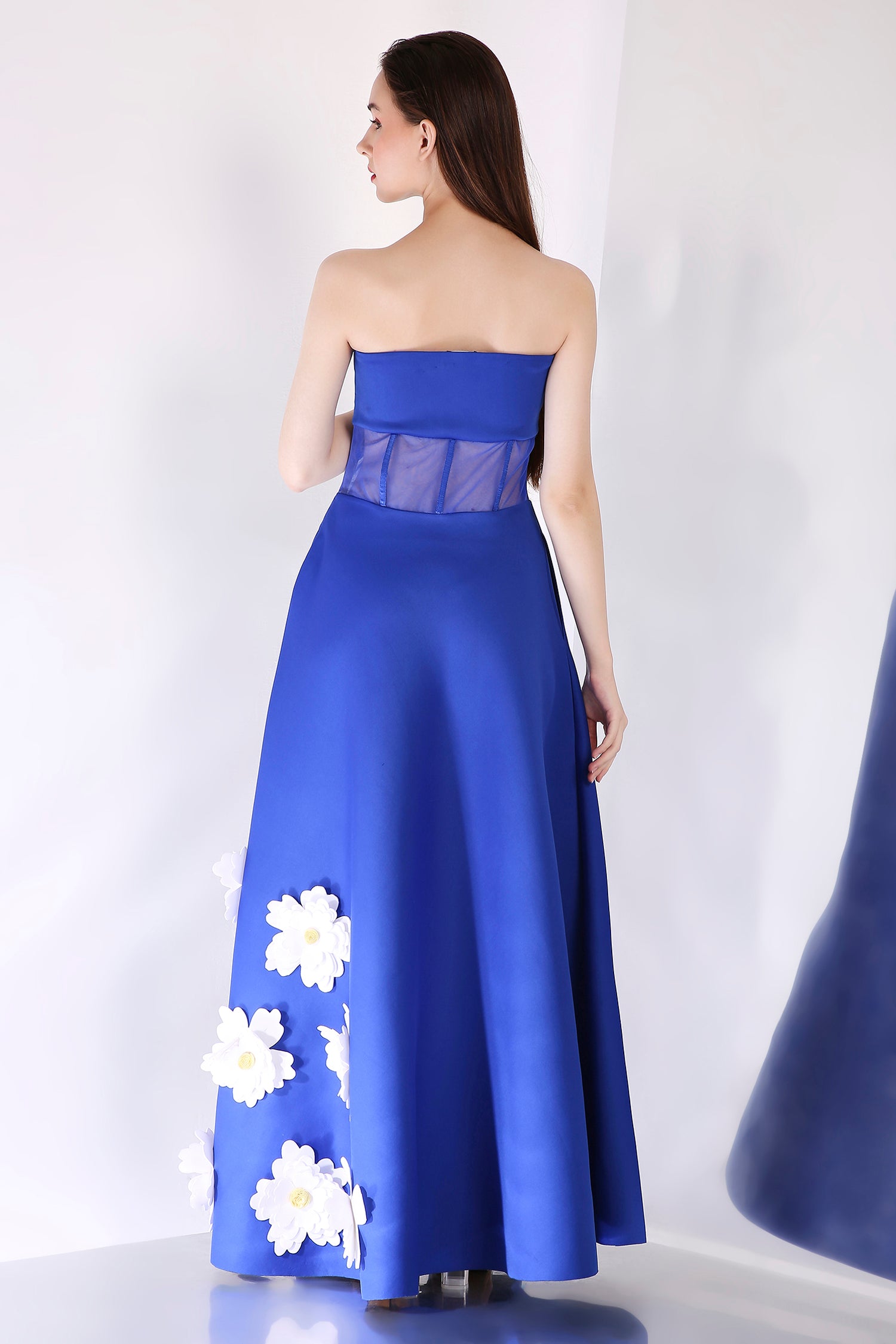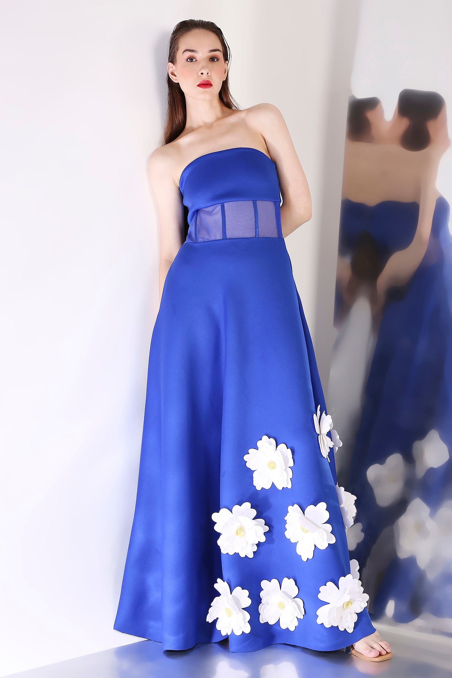 Designed in premium neoprene fabric, this fit-and-flare maxi dress features mesh detailing at the waist and asymmetrical 3D floral accents along the hem.