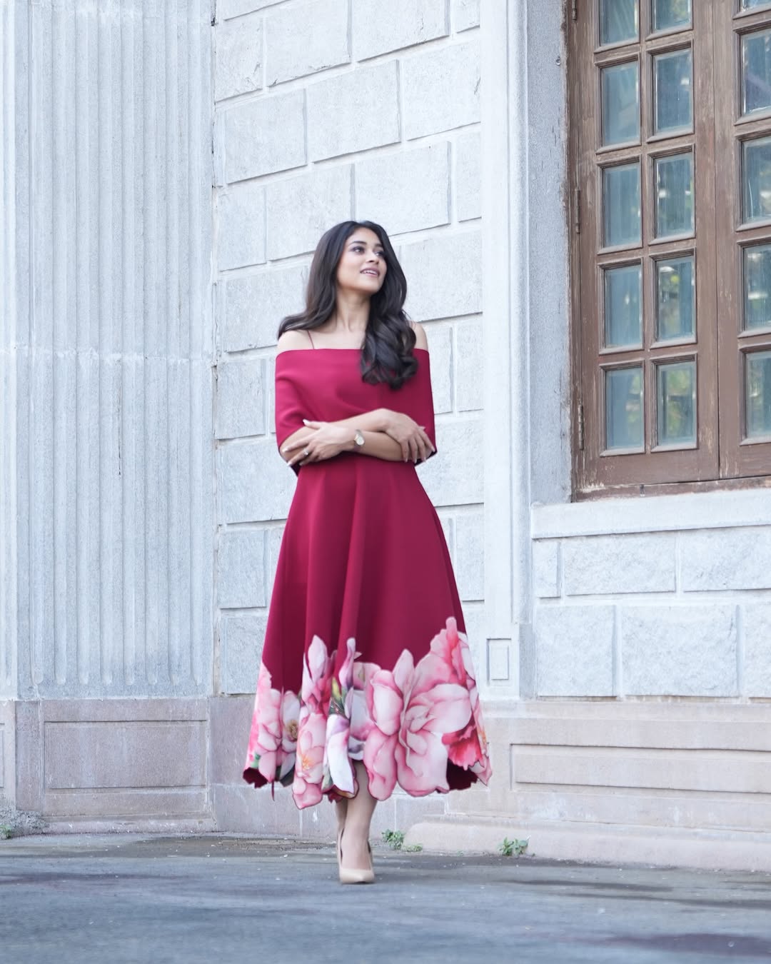 The fit and flare dress cinches the upper body well and then flows out, giving it a beautiful structured fall, without clinging to the lower body.
