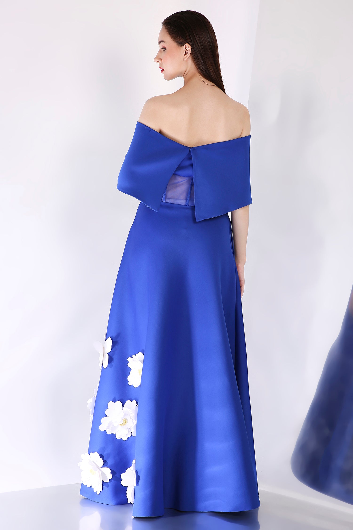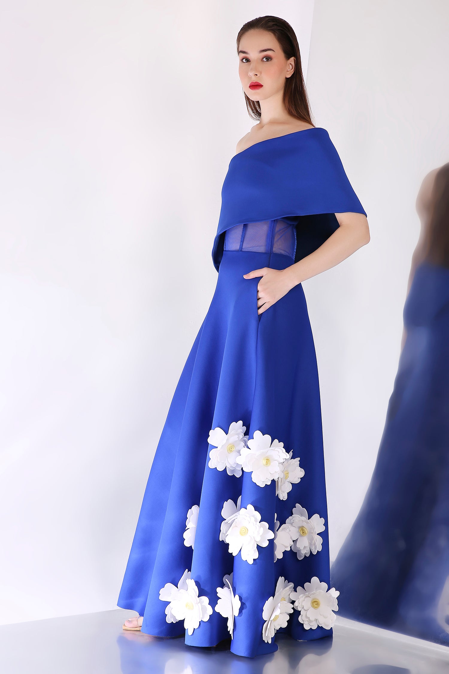 Crafted from premium neoprene fabric, this fit-and-flare maxi dress features mesh detailing at the waist and asymmetrical 3D floral accents along the hem. Paired with a versatile classic wrap, which can be styled both one-shoulder or off-shoulder, this ensemble offers modern structure with timeless elegance—perfect for any formal occasion.