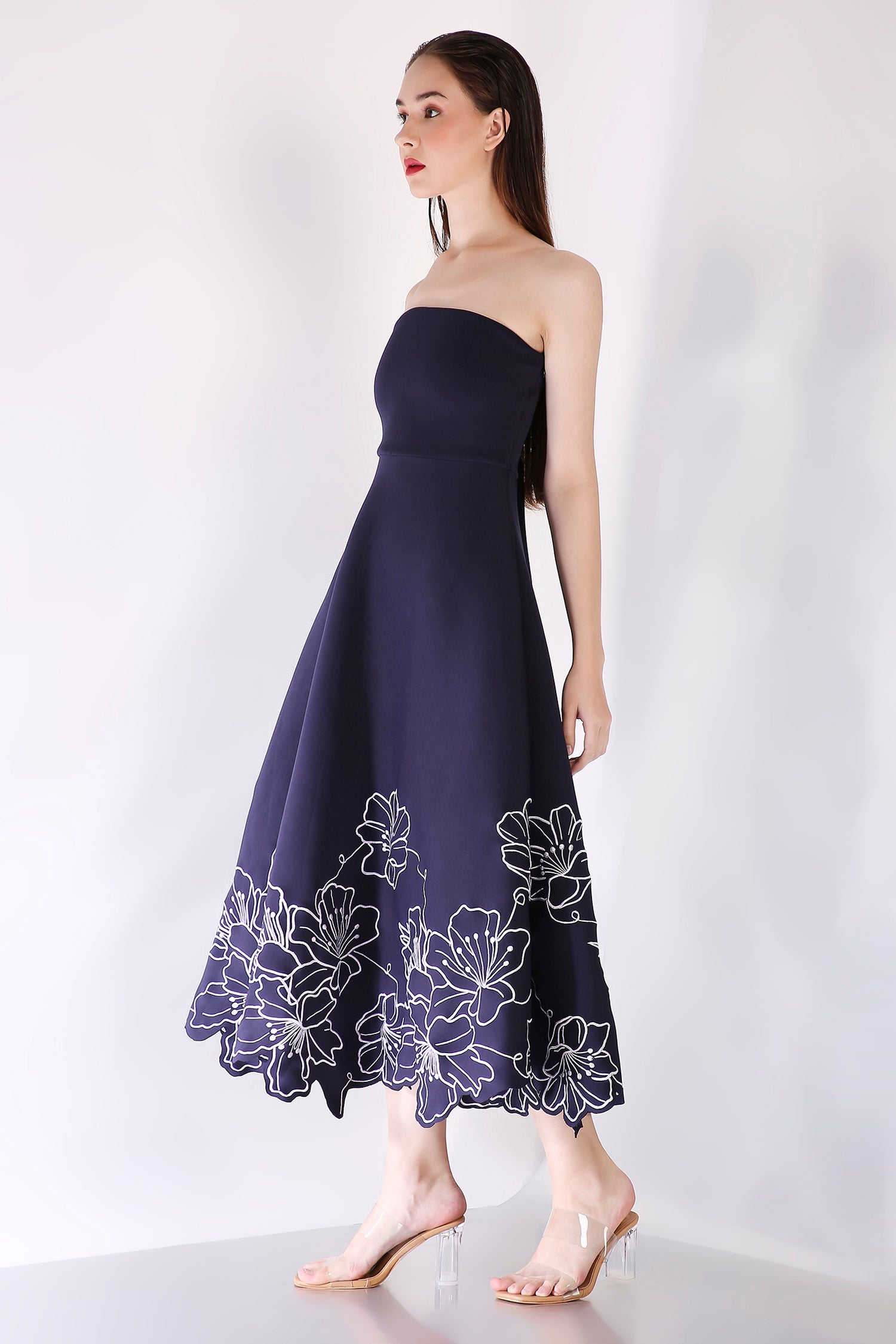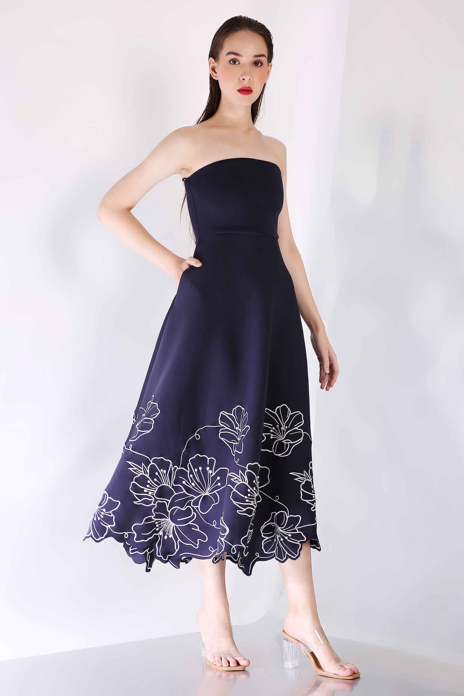 A mid-calf length fit-and-flare dress in premium neoprene, featuring intricate floral rose embroidery along the hem. The delicate, feminine design adds a refined touch to the silhouette, making it a perfect choice for formal occasions. This dress seamlessly combines modern style with classic elegance, creating a timeless statement piece.
