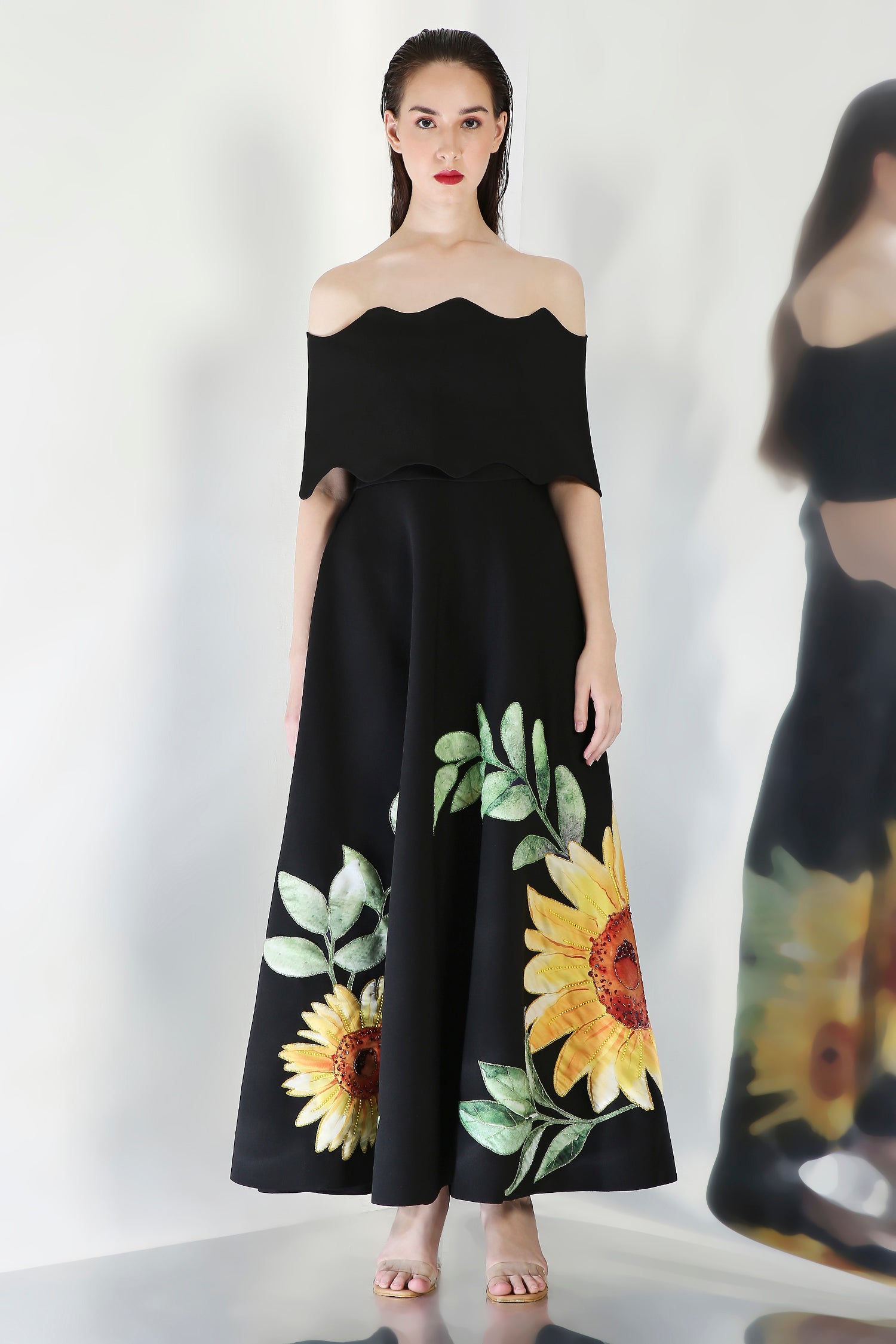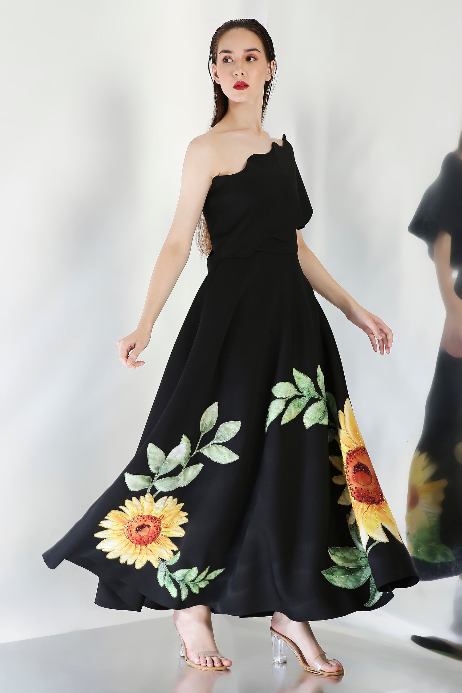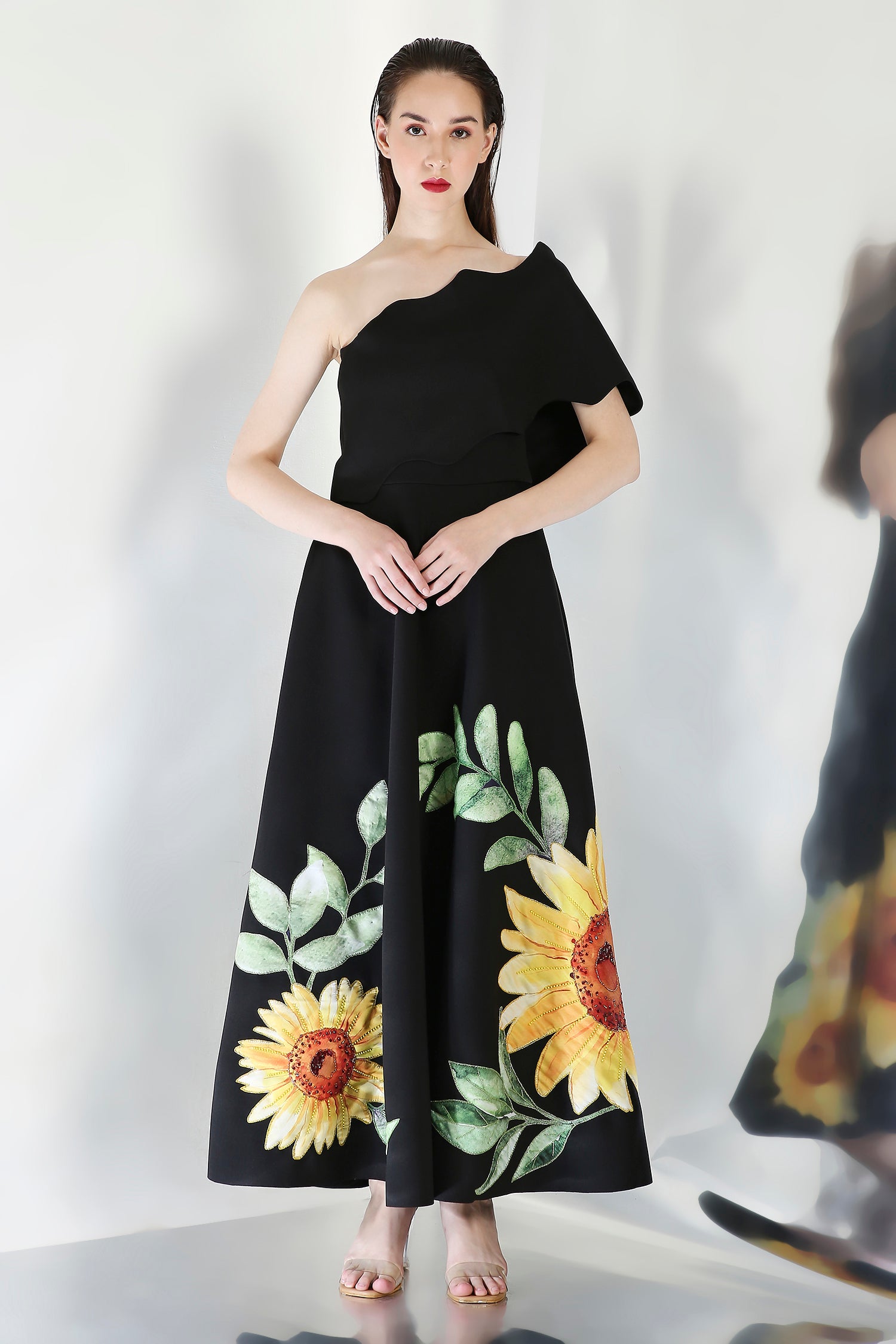The Olive dress embodies elegance with its intricately hand embroidered floral design, emphasised with beads and sequins. The watercolor motifs paired with appliqué work and hand work elevate the look of this dress.
