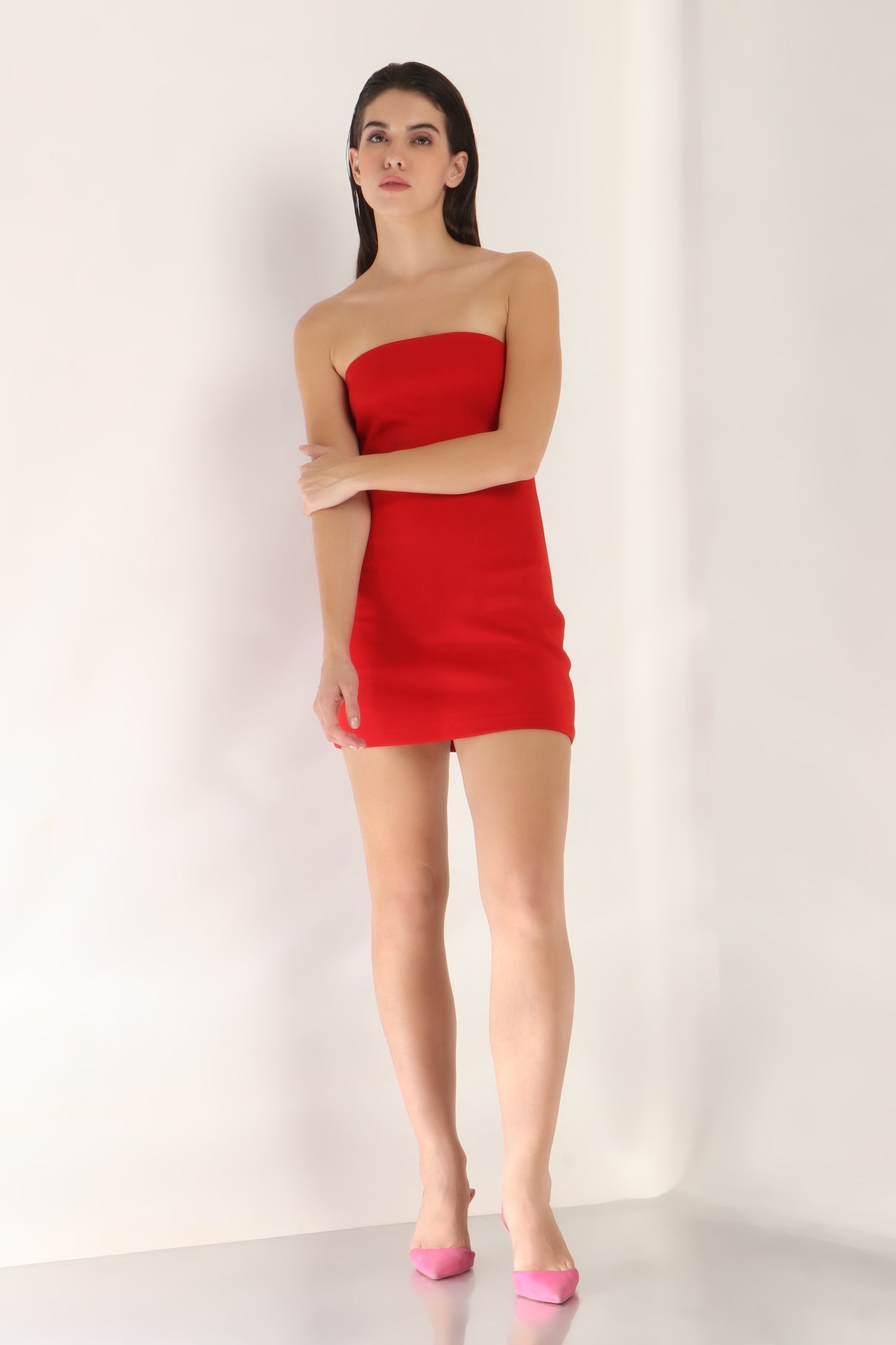 Turn heads, steal hearts; this sculptural red mini dress is a walking bloom.