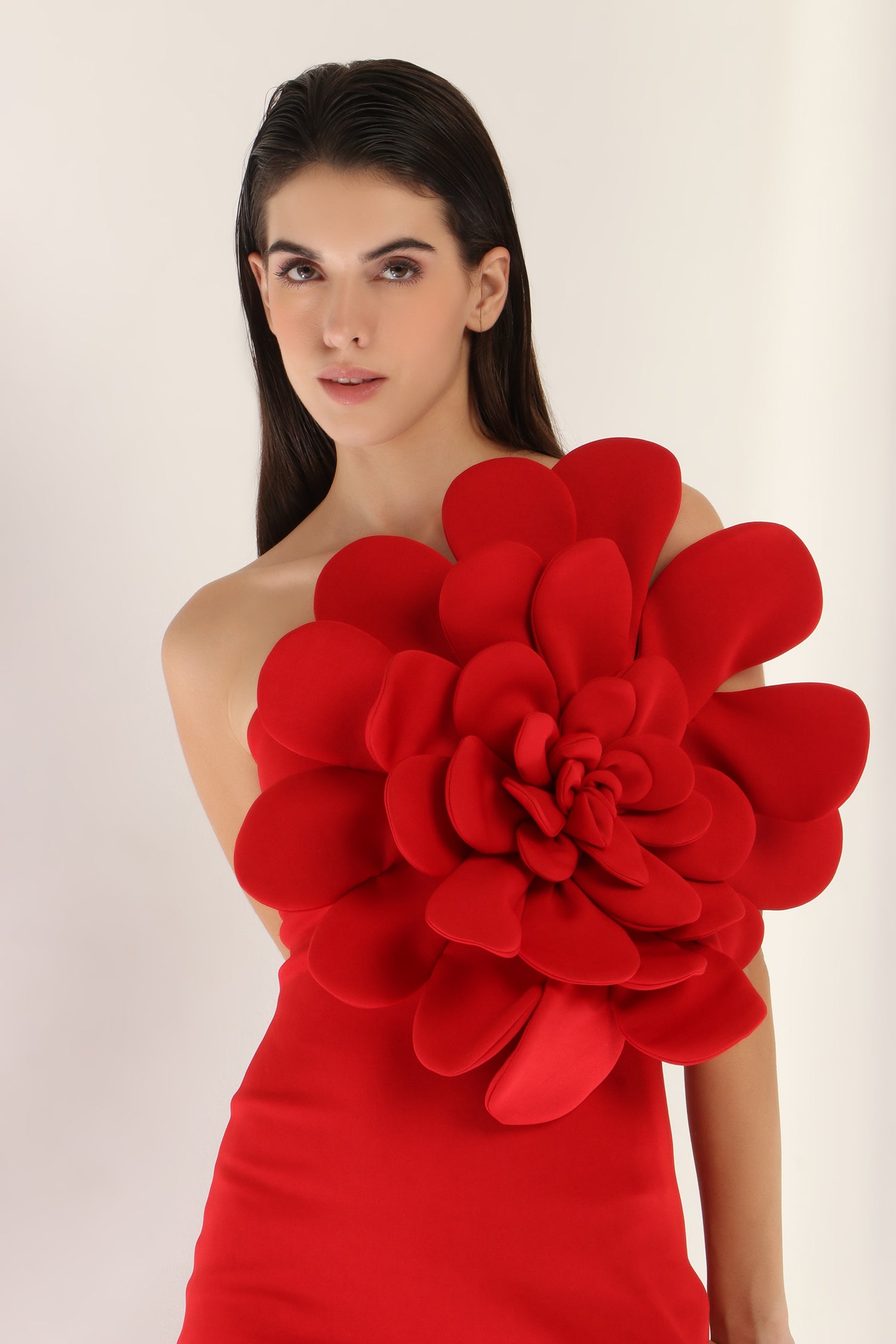 The bold silhouette hugs the body, while the oversized petals add structure and soft drama. A true couture moment, designed for unforgettable entrances.