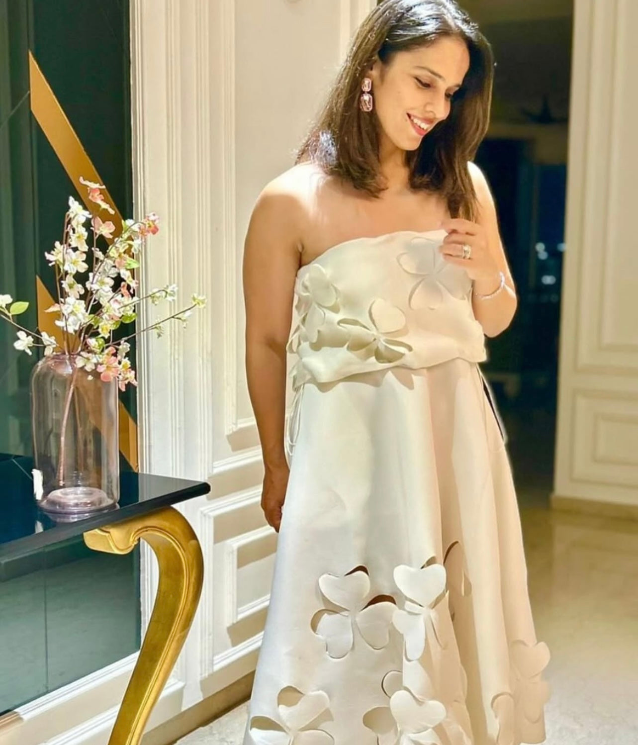 Featuring Saina Nehwal in Lyre, a strapless dress with a straight neckline, pockets and a structured flare. The cutouts on the hem add to the intricacies of the dress.