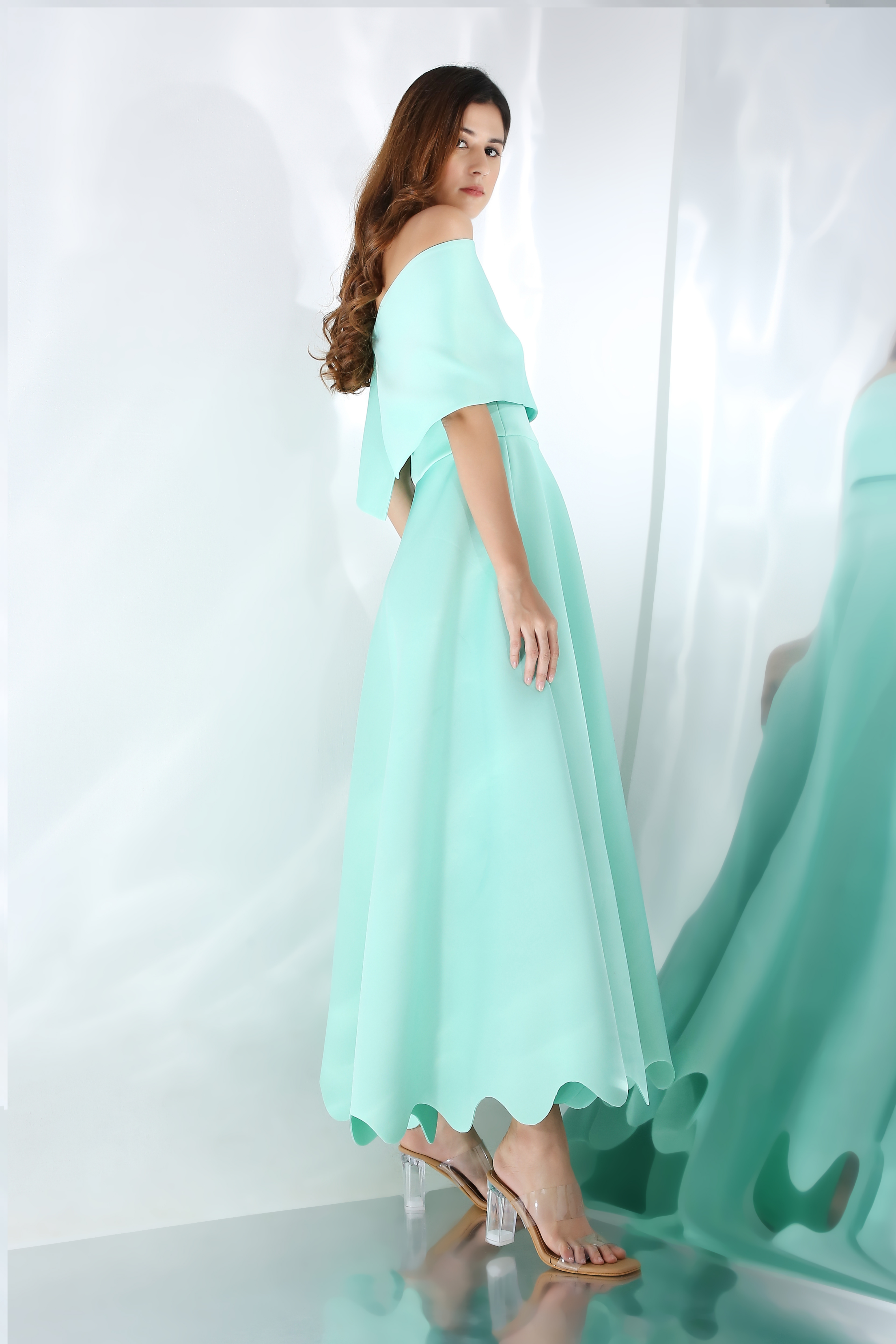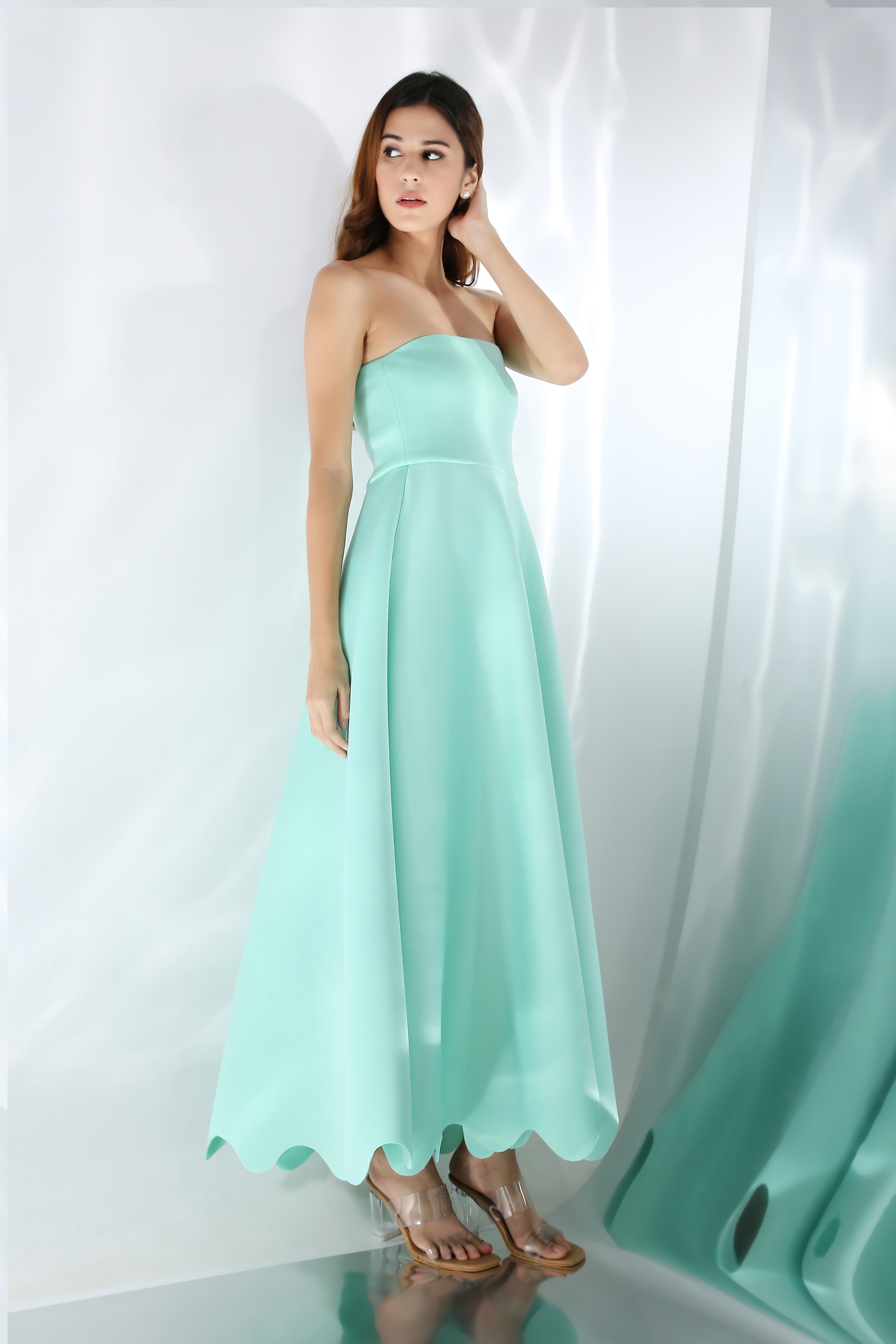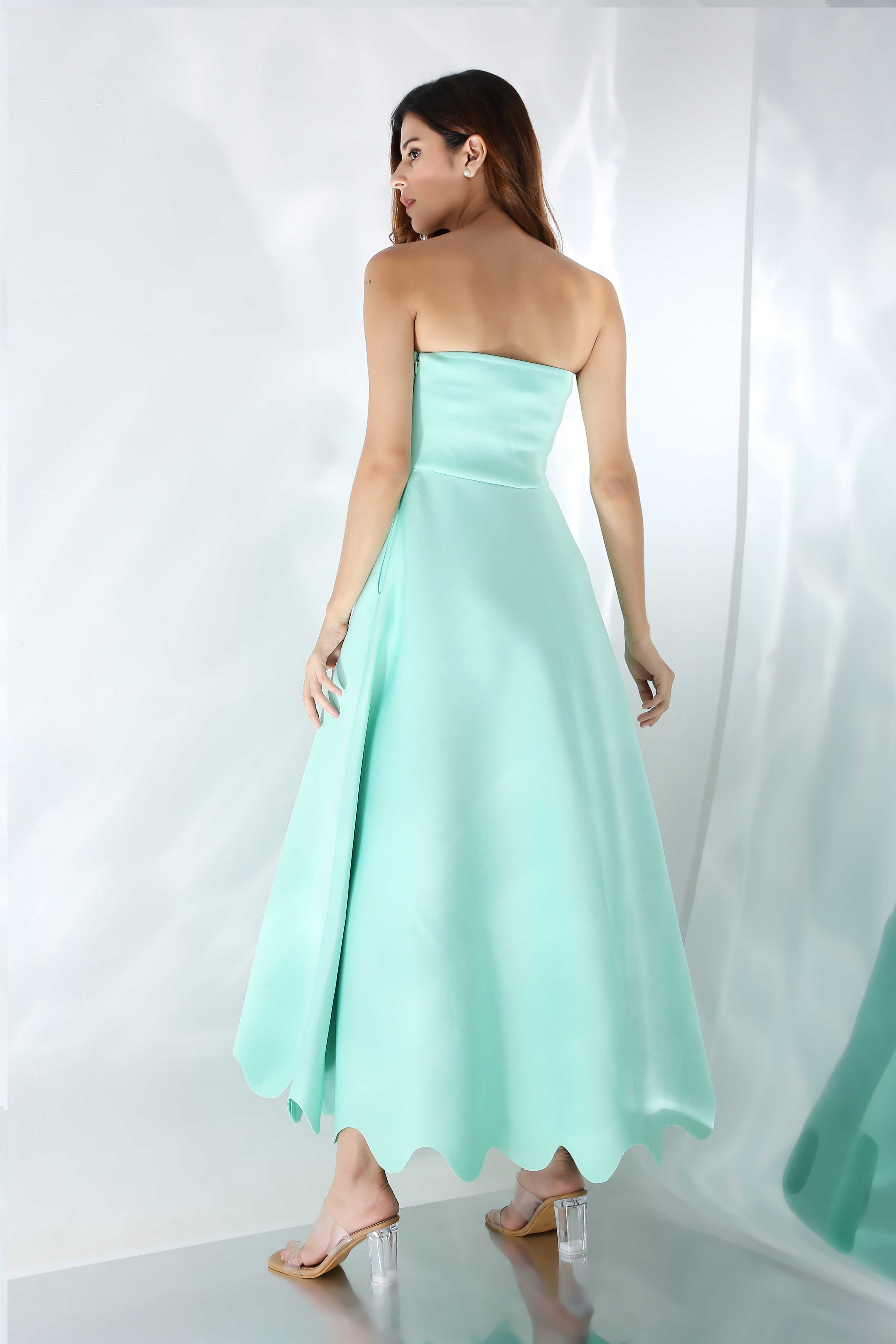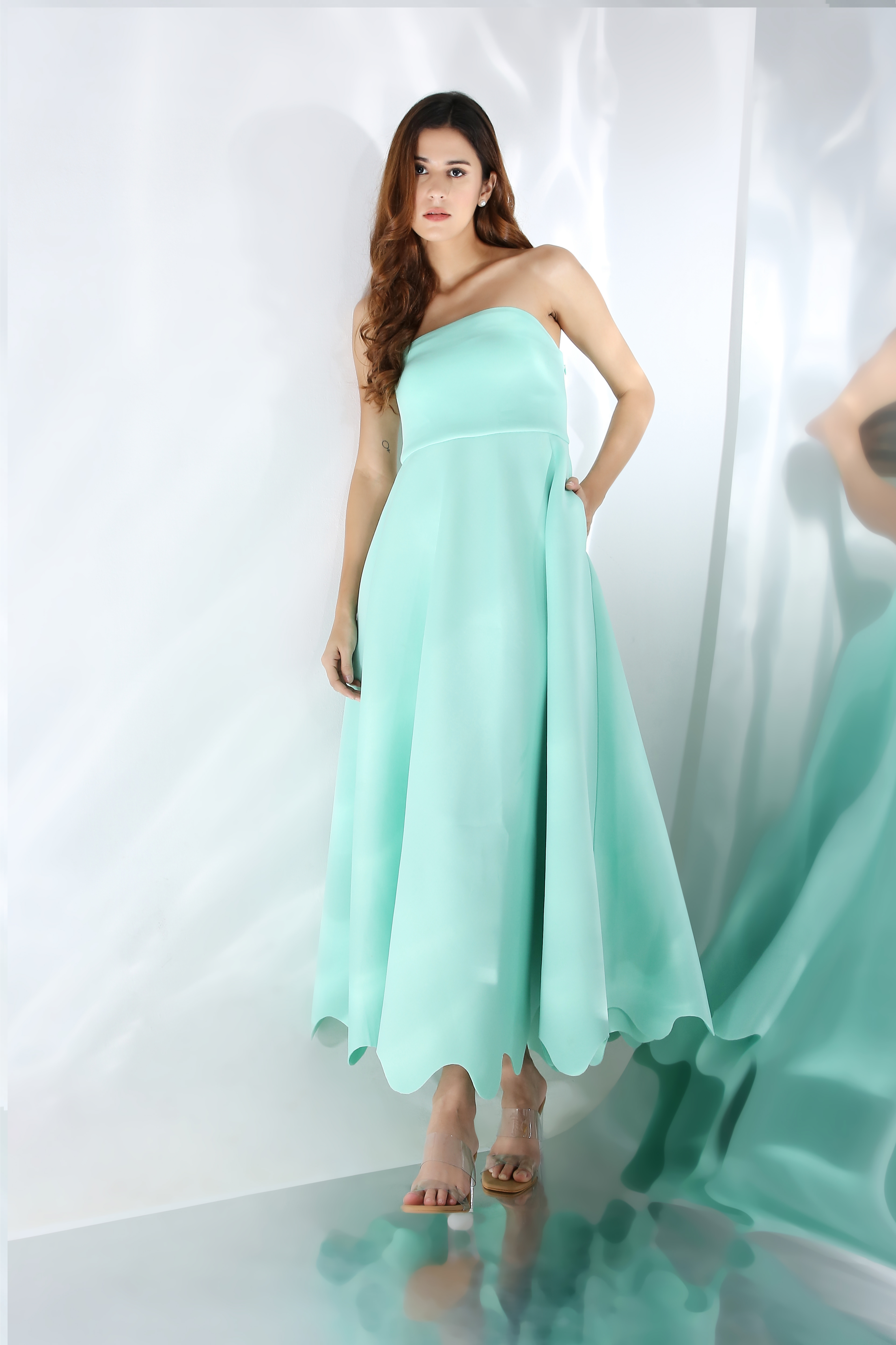 Featuring a fit and flare dress with scallops on the base. Wear it in two ways,