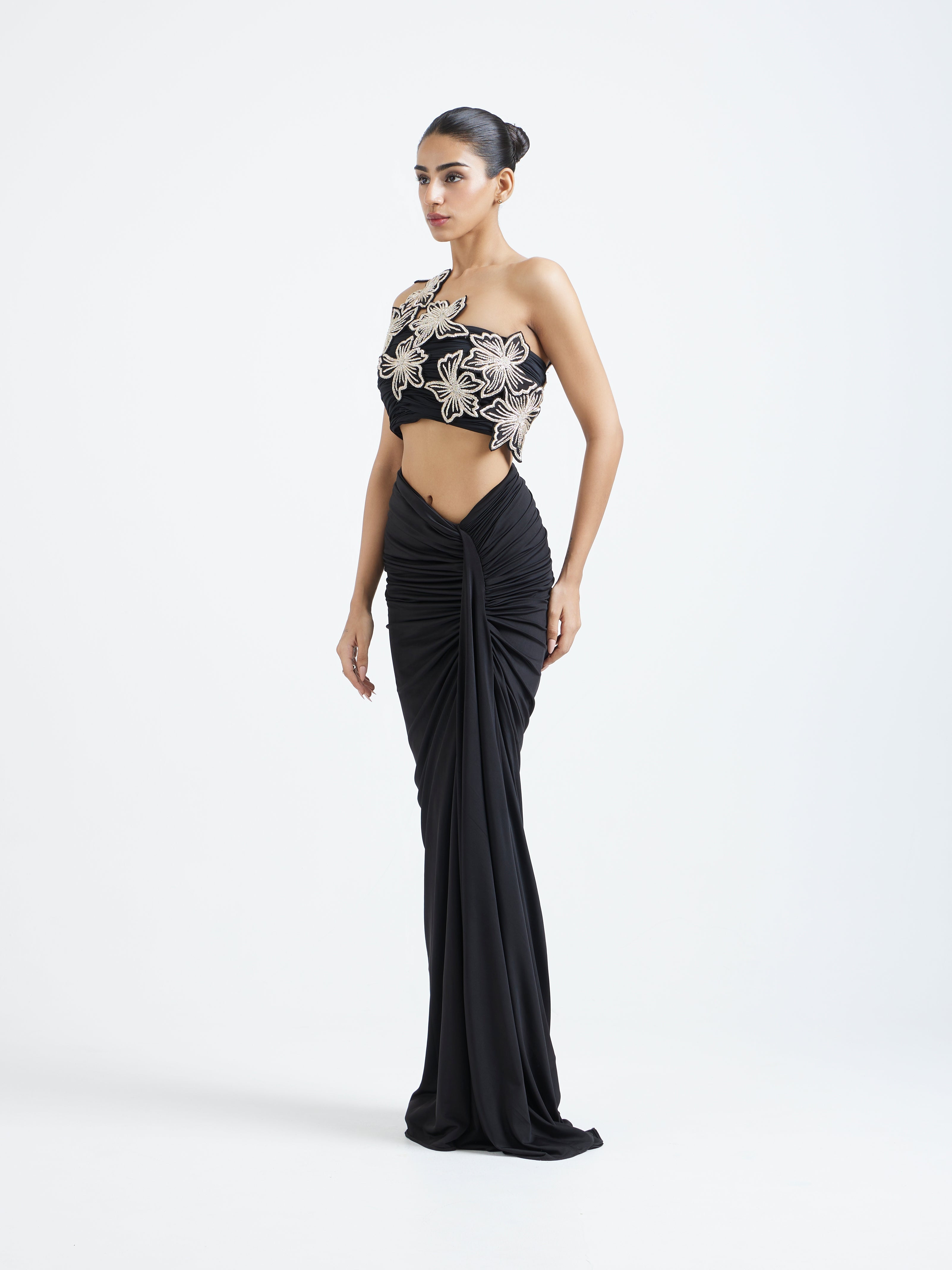 A striking balance of drapes and fluidity, this draped set is paired with a beautifully handcrafted zardozi floral overlay.