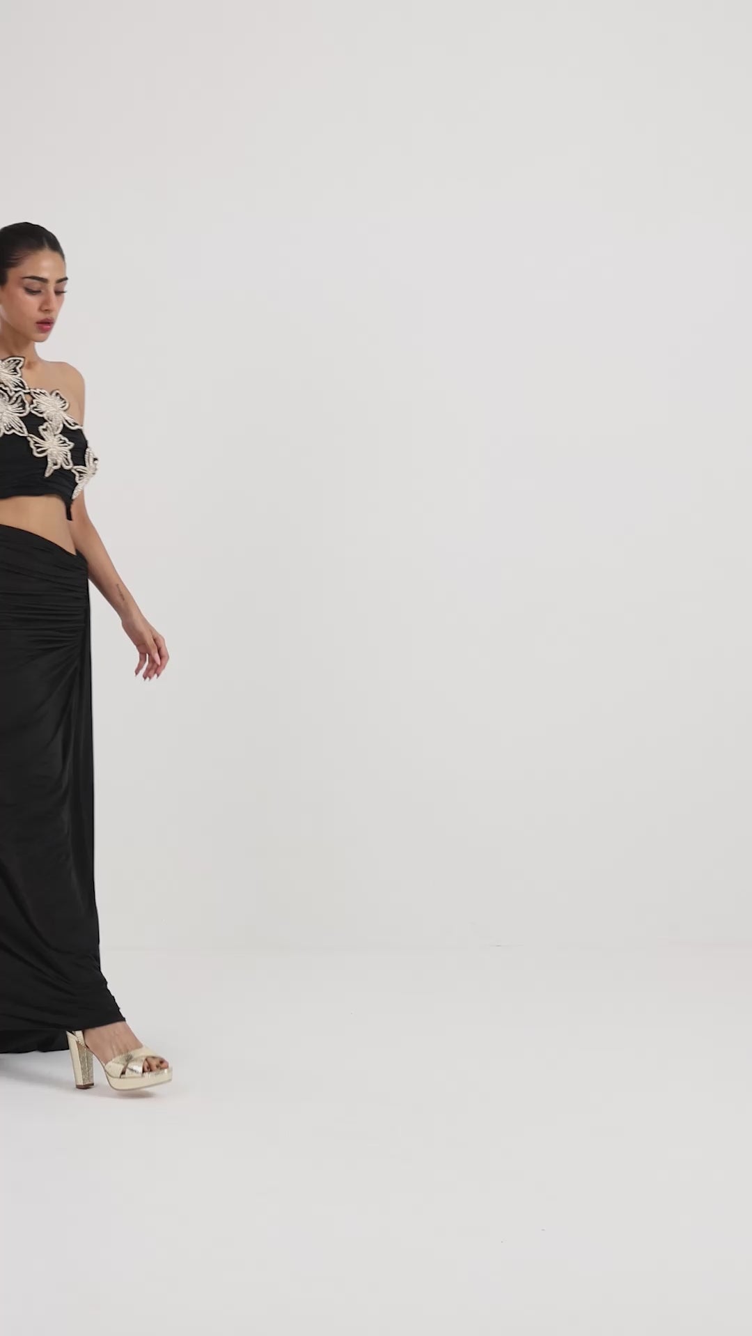 Feminine, modern, and intricately detailed, this ensemble is designed to move like liquid while holding the quiet power of couture craftsmanship.