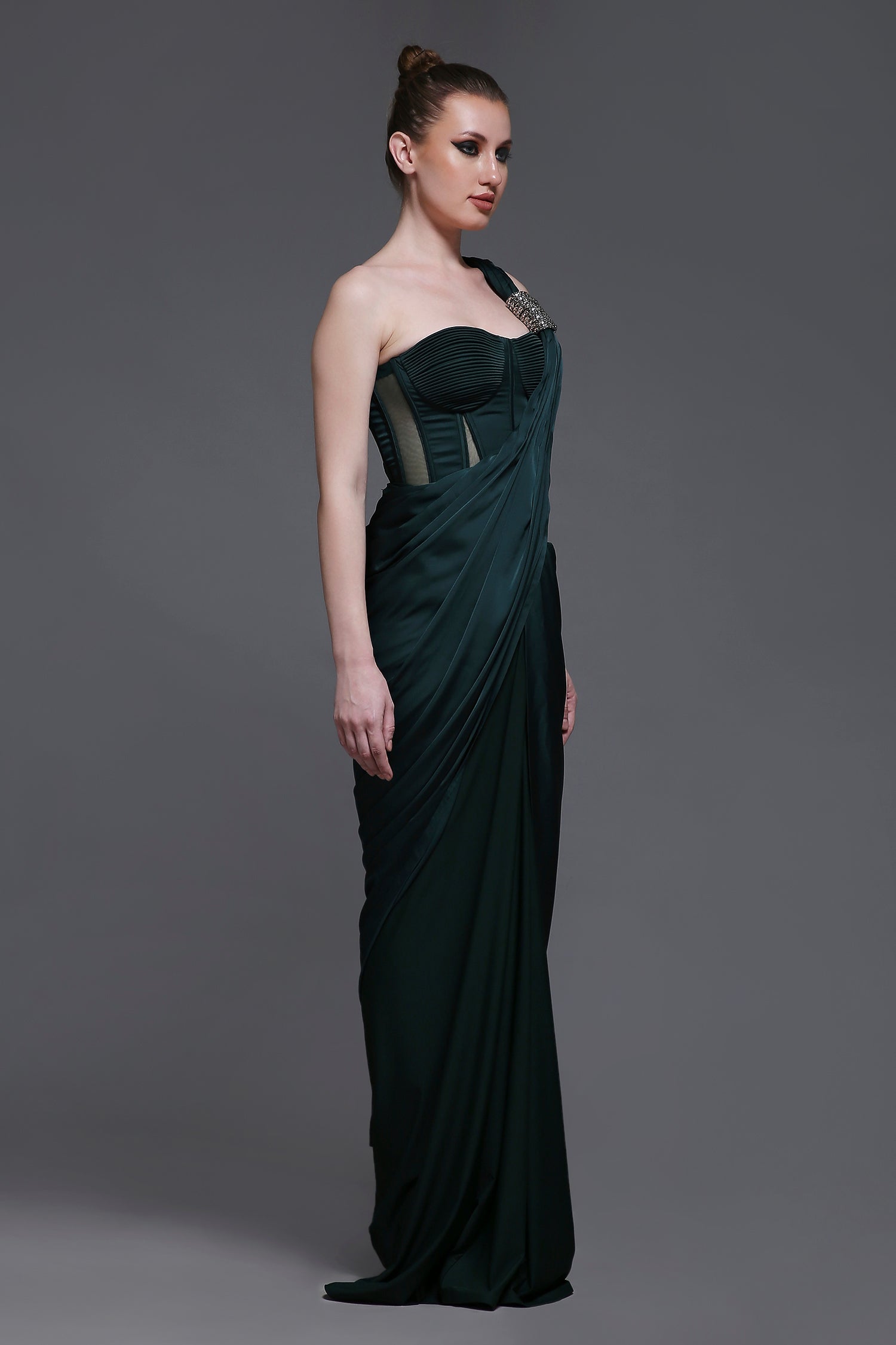 Our Georgia Set combines elegance and structure, featuring a corset with detailed cups, mesh panels, and a tie-up back for a customizable fit. The matching fitted draped skirt is enhanced with subtle ruching for a flattering silhouette. The set is further elevated by a detachable drape with intricate embroidered detailing, adding a touch of luxury and sophistication. Perfect for making a statement at any special occasion.