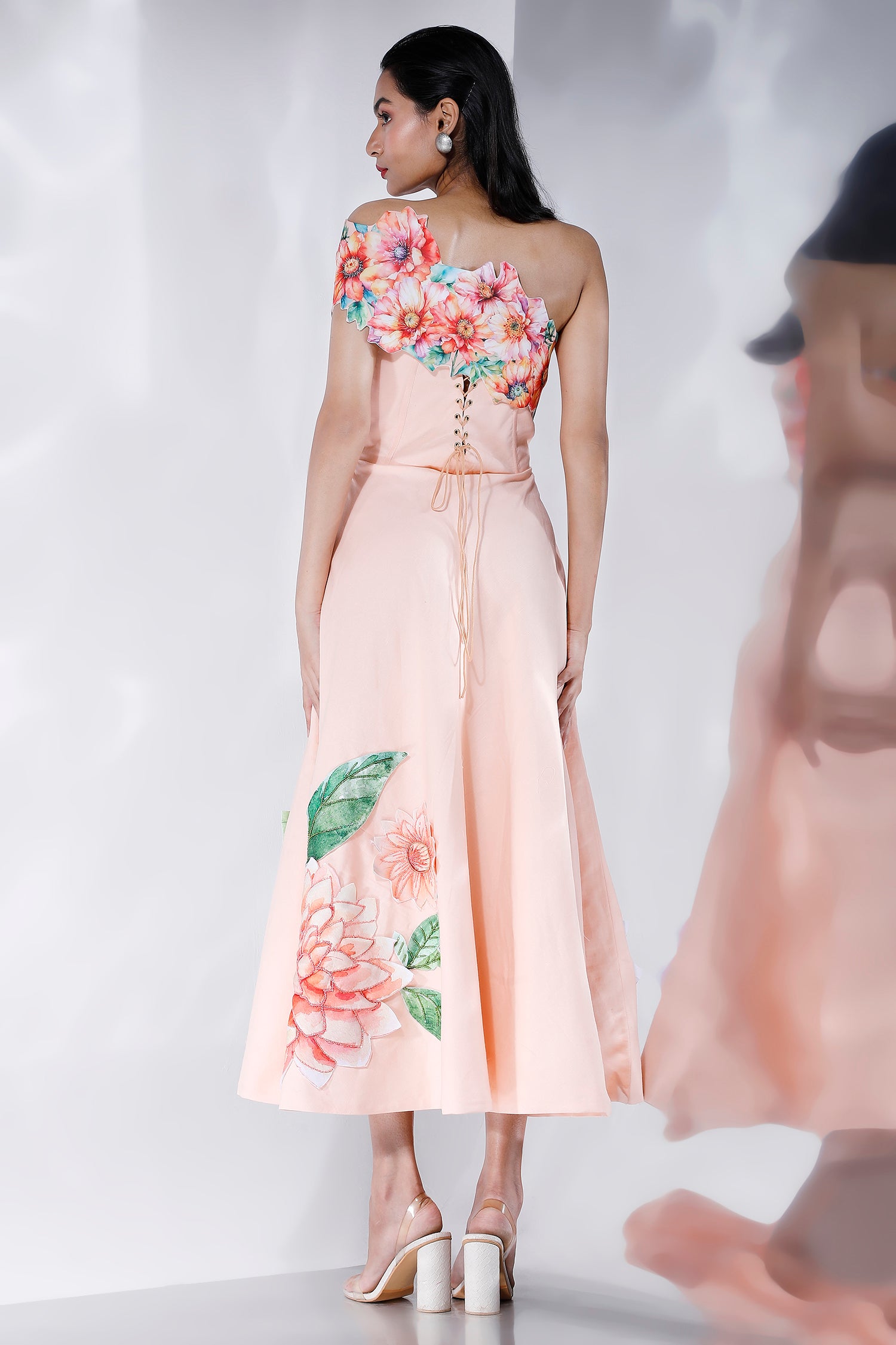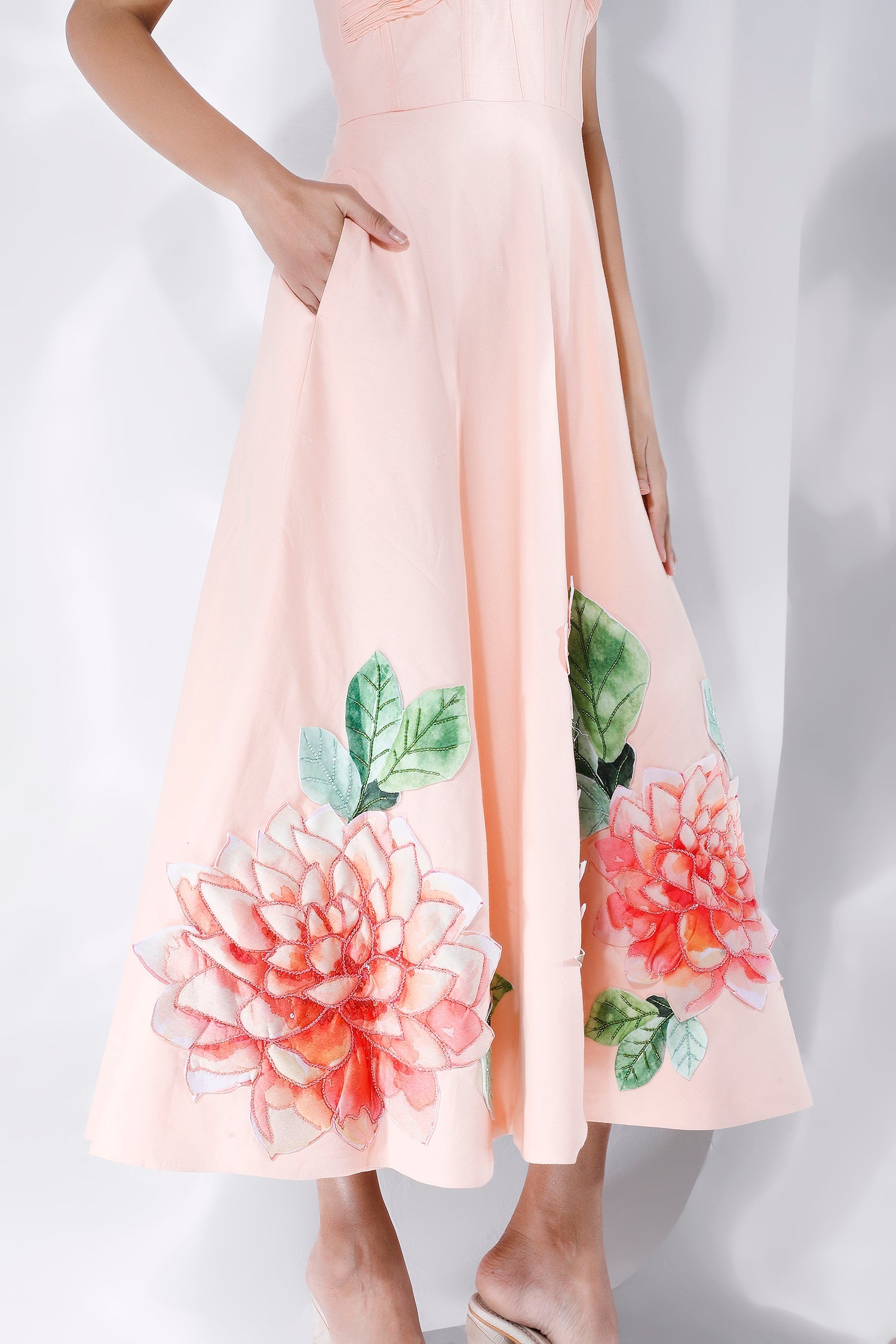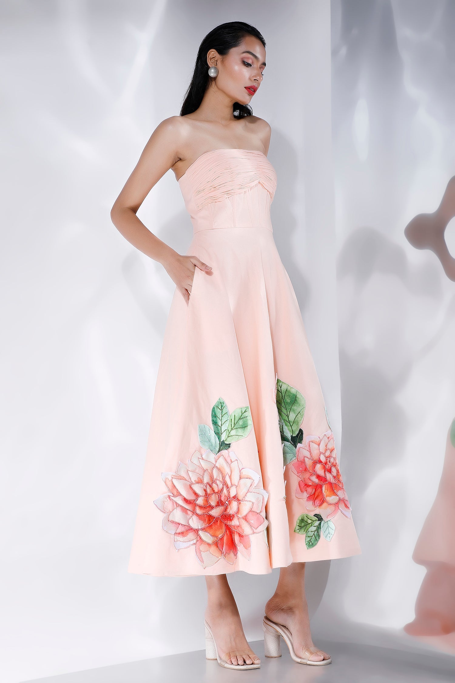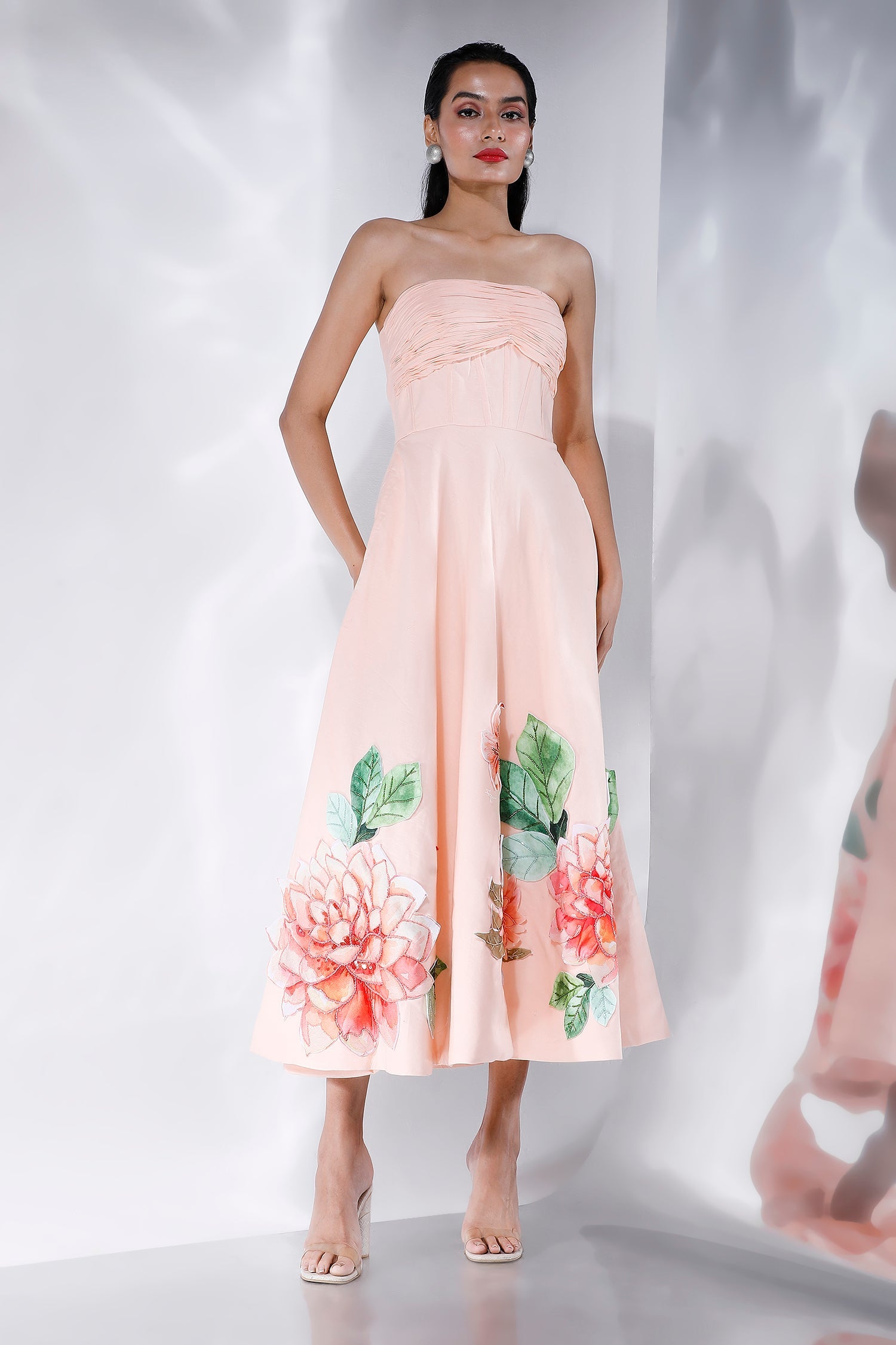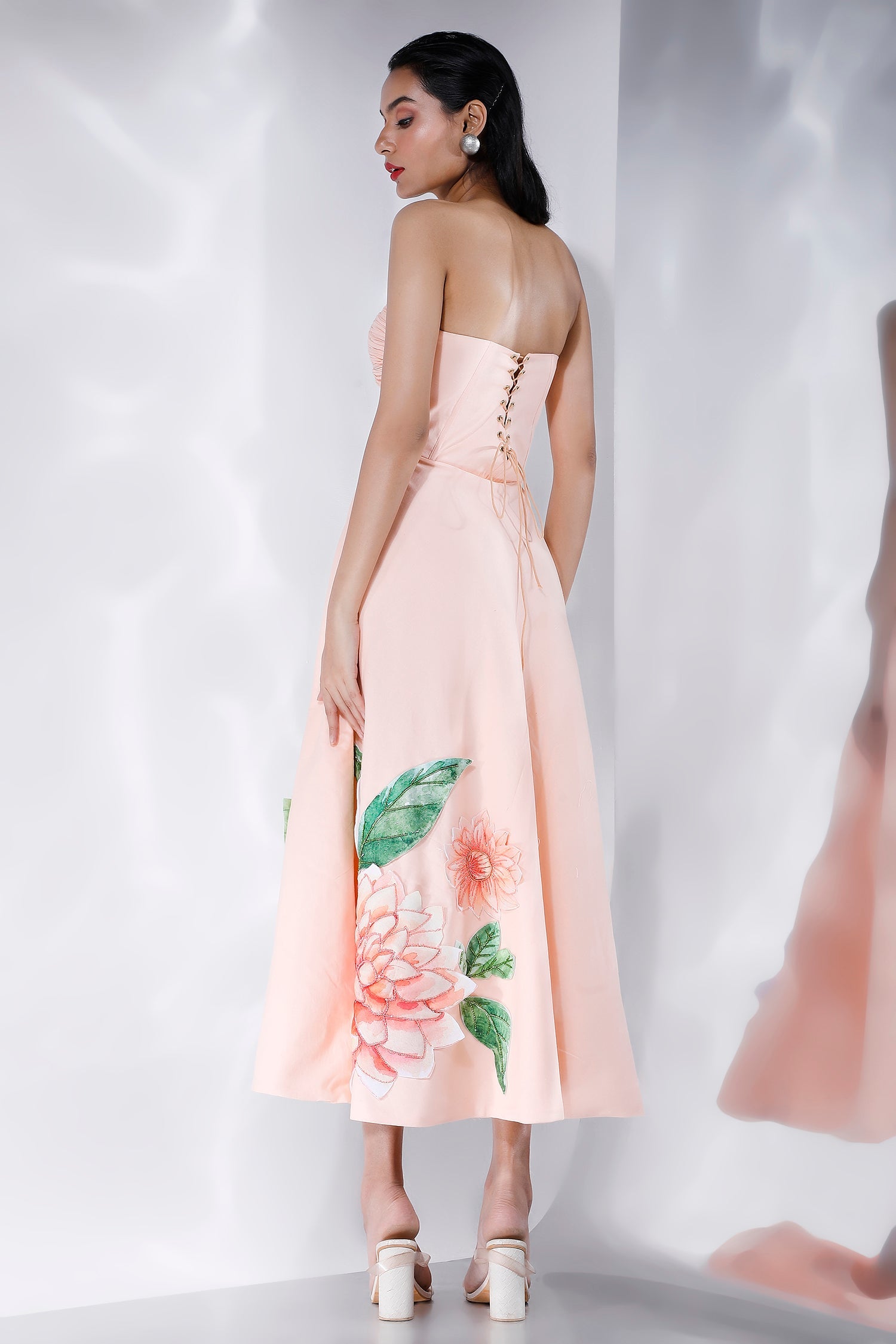 Featuring a ruched, corseted fit and flare midi dress with floral motifs hand embroidered with sequins and beads,