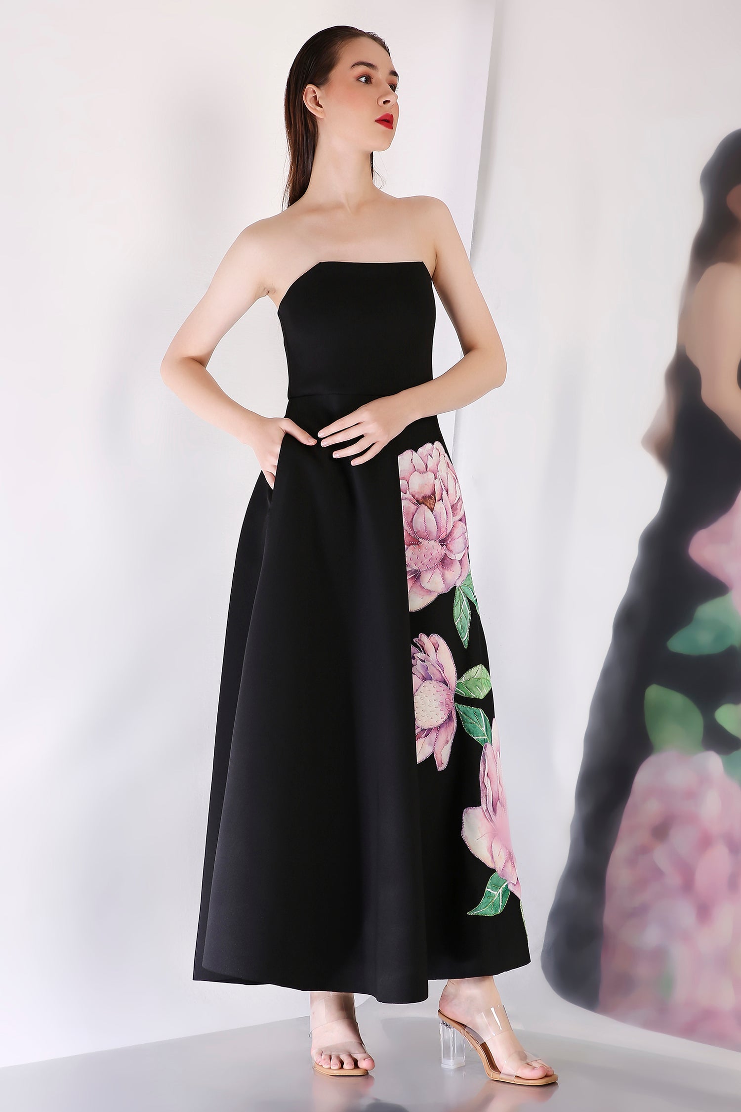 Discover the Nyra dress—a mid-calf silhouette adorned with a stunning lavender floral placement print. This elegant design effortlessly combines sophistication and charm, making it an ideal choice for any special occasion.
