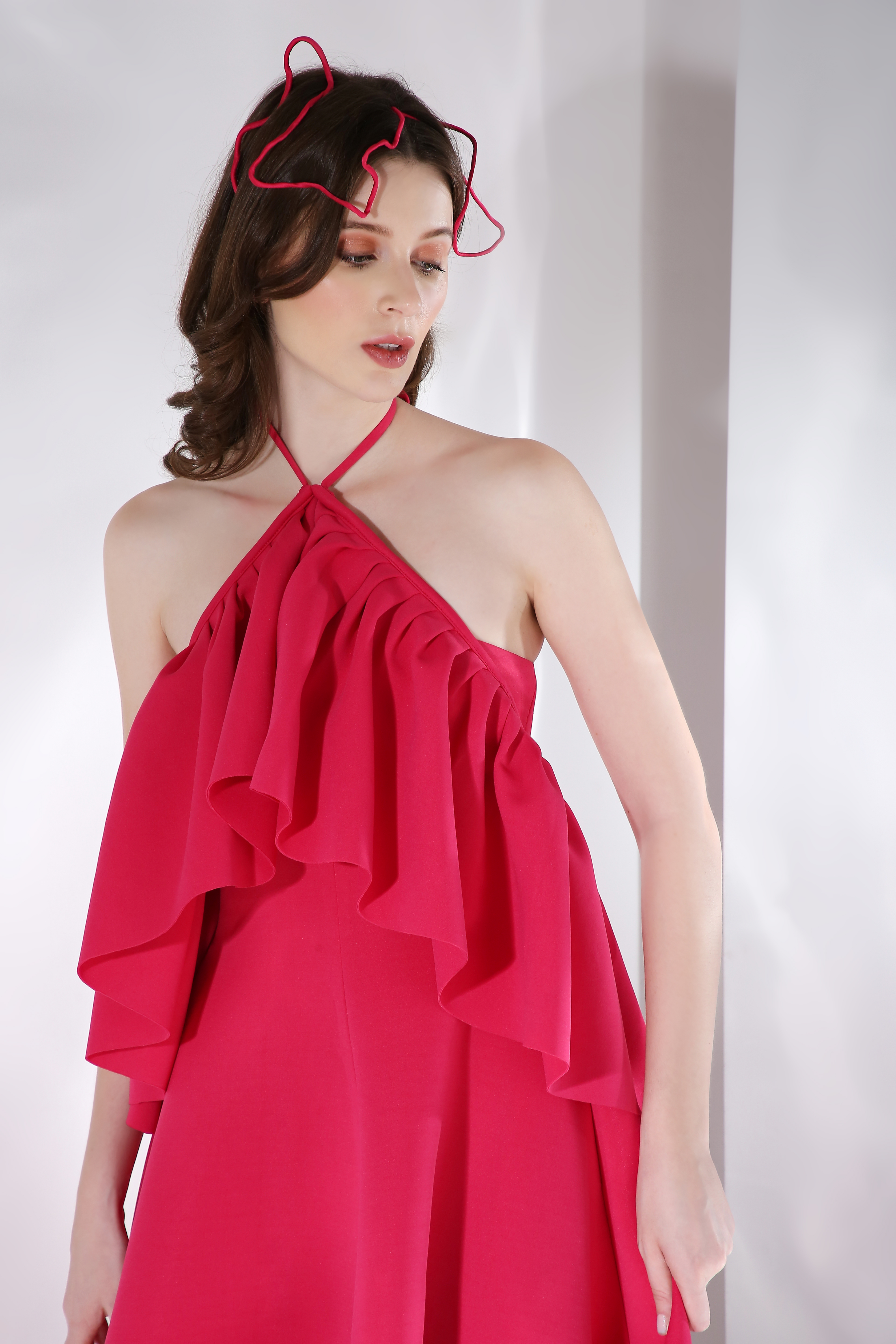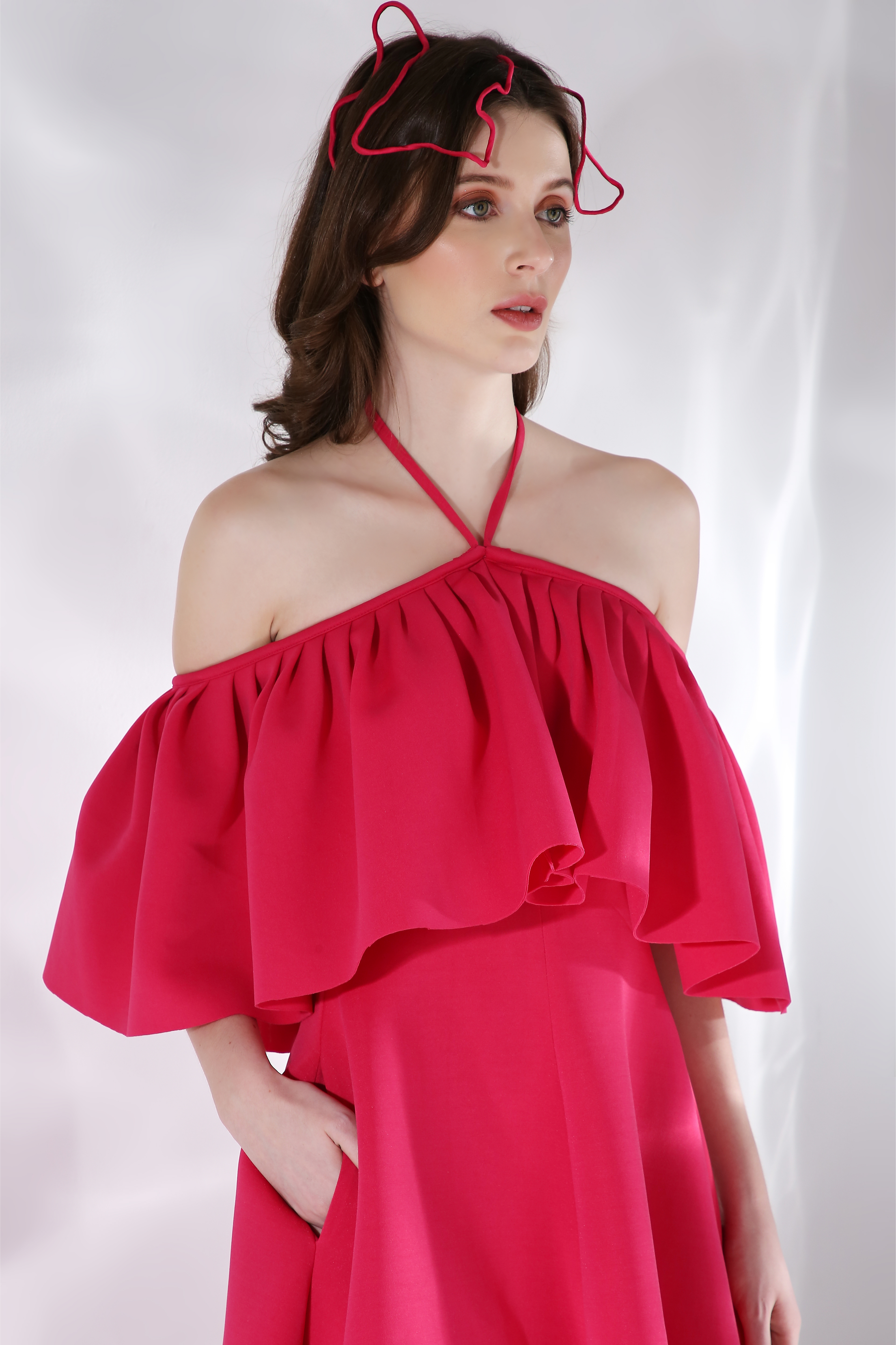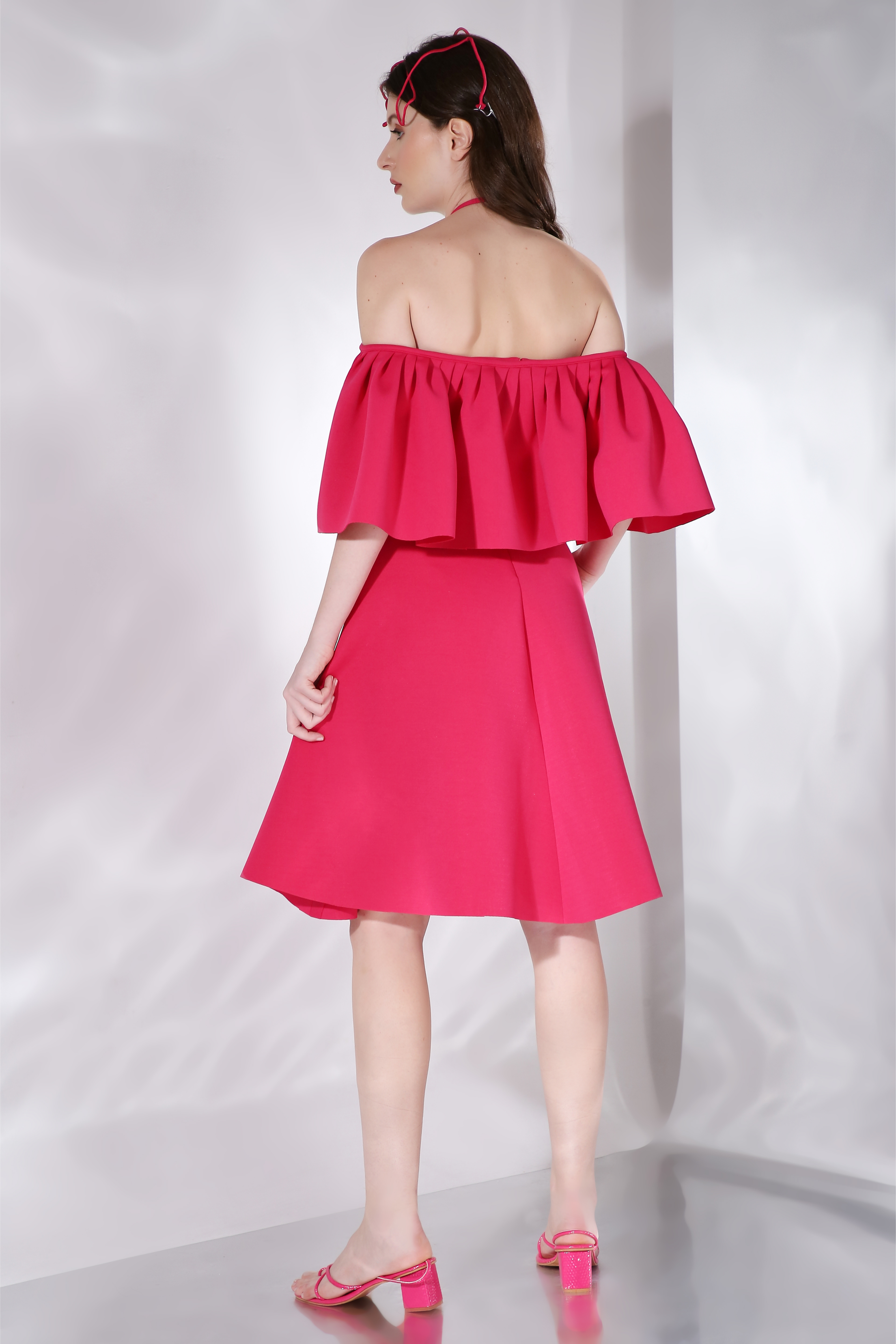 Featuring a flared knee length, strapless dress paired with a ruffled detachable accent which can be styled in different ways.