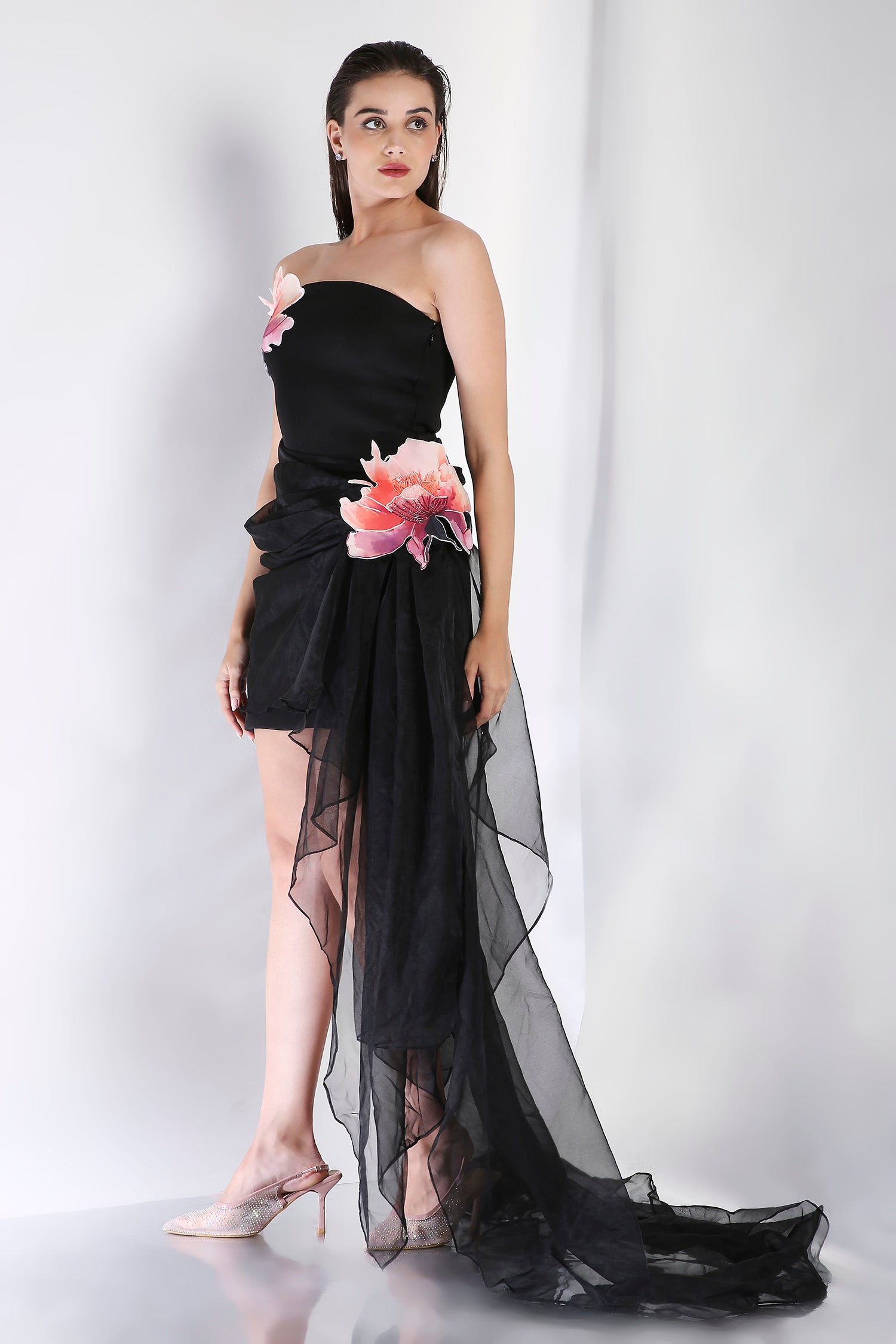 Reimagined elegance in motion — the Maeve Dress is elevated with a detachable trail that flows with every step. This sculpted neoprene silhouette features hand-patched and hand-embroidered floral motifs placed along the bodice and hip for a graceful yet striking composition.