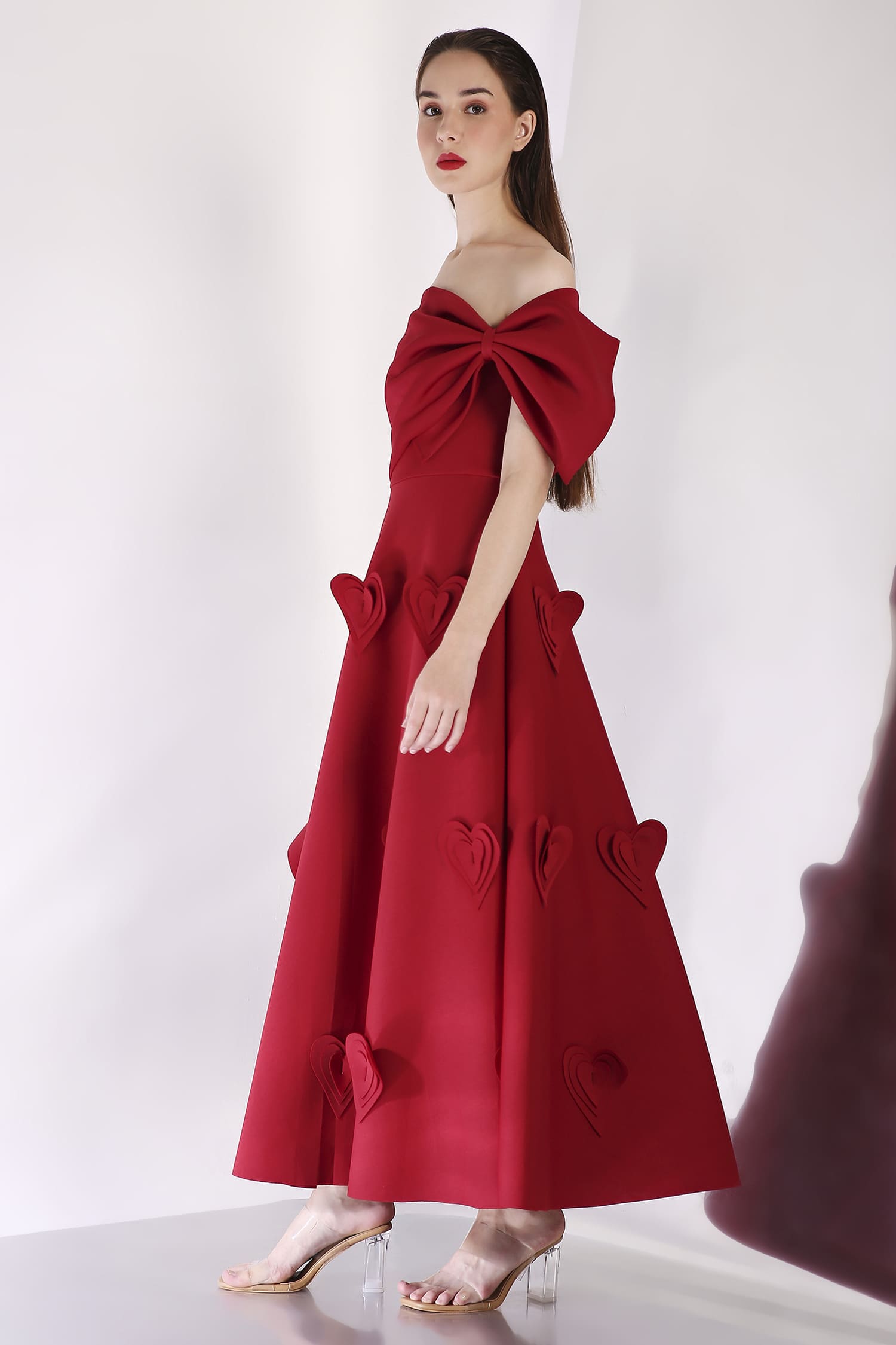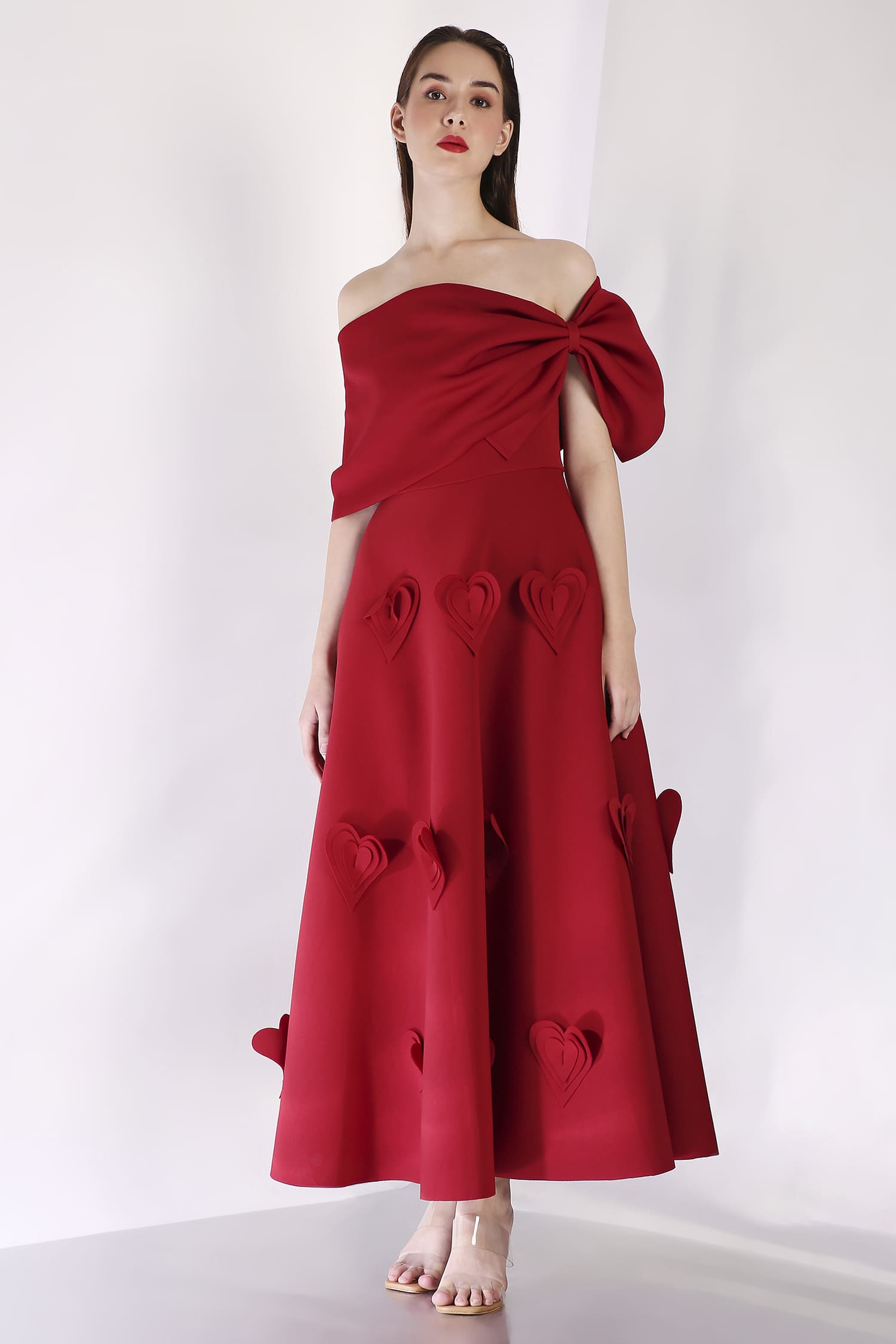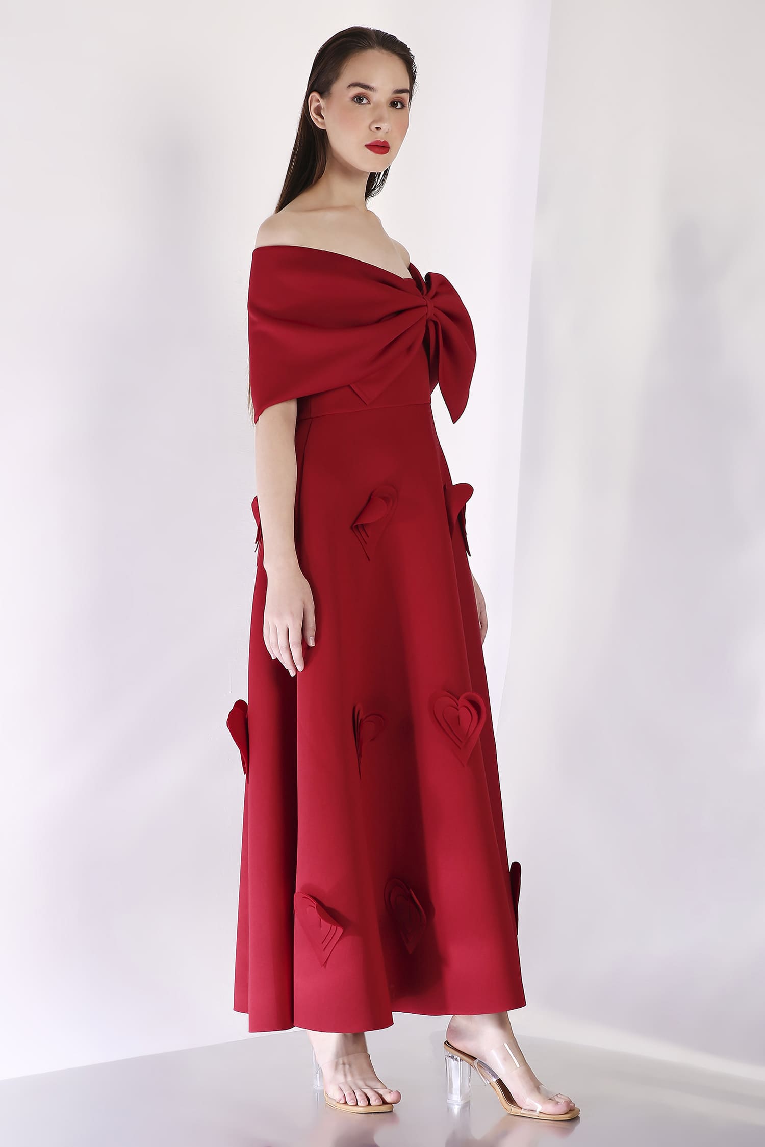 A mid-calf dress featuring heart-shaped 3D appliqués for a textured, romantic look, with a versatile bow wrap that can be styled one-shoulder or off-shoulder, and placed at the center, side, or back for a customizable touch.