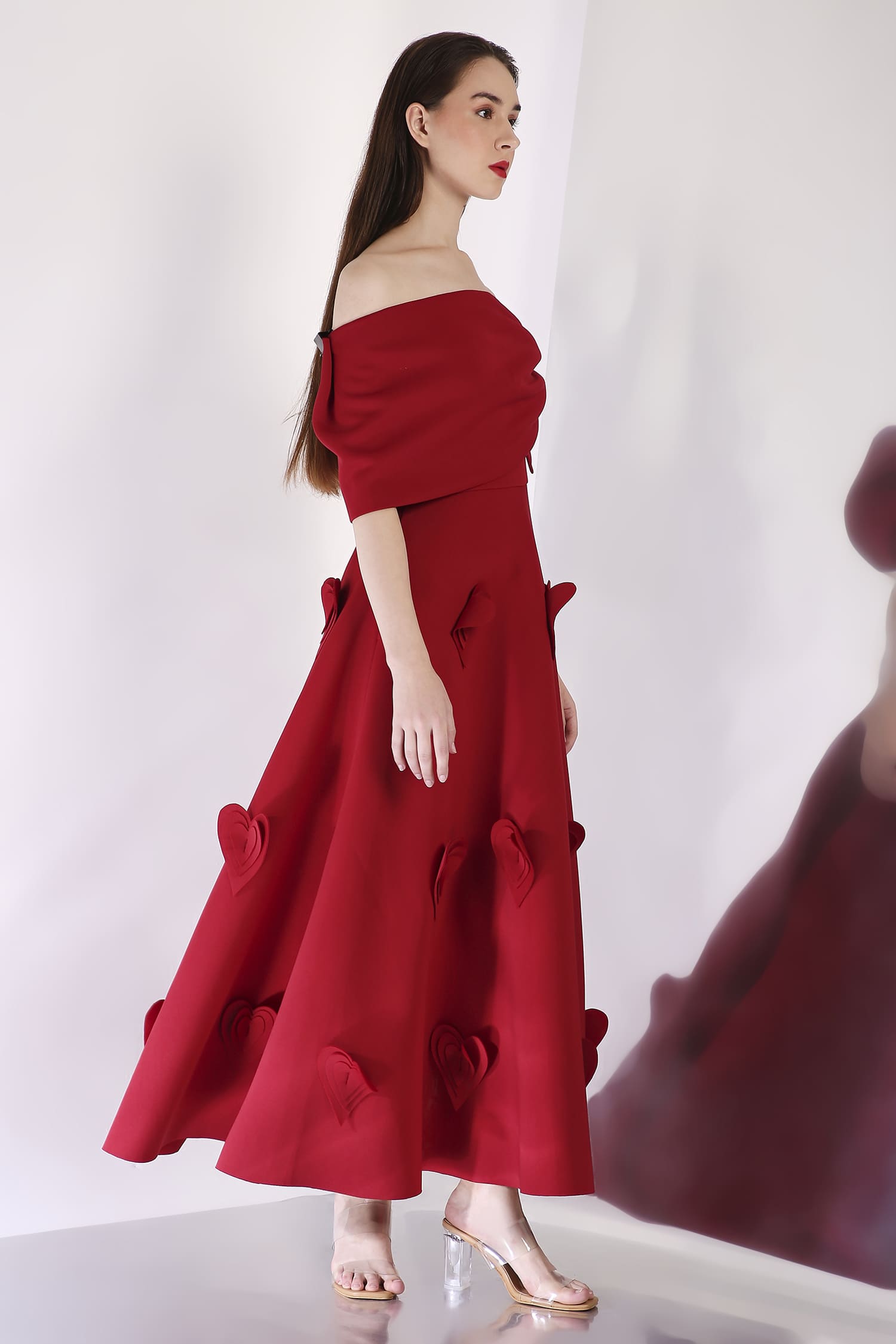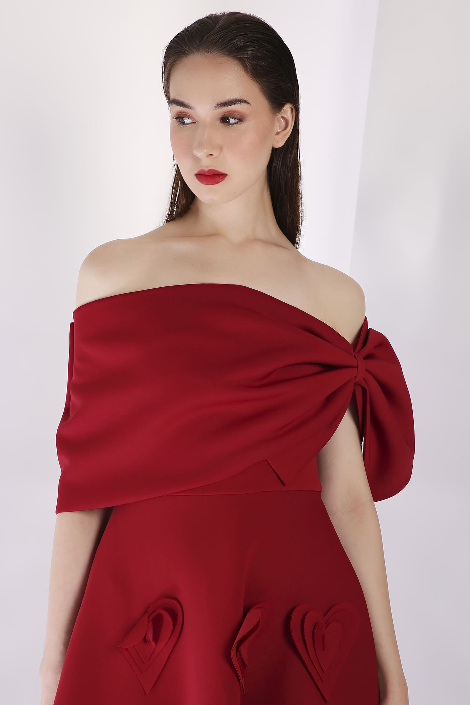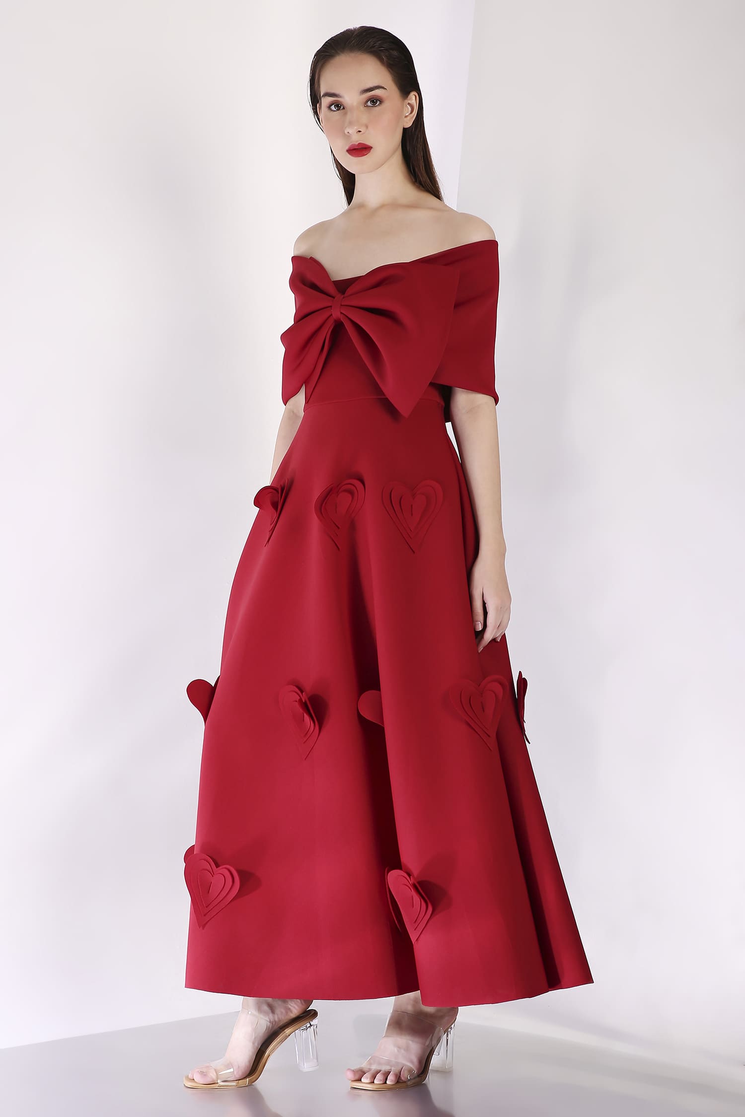 A mid-calf dress featuring heart-shaped 3D appliqués for a textured, romantic look, with a versatile bow wrap that can be styled one-shoulder or off-shoulder, and placed at the center, side, or back for a customizable touch.
