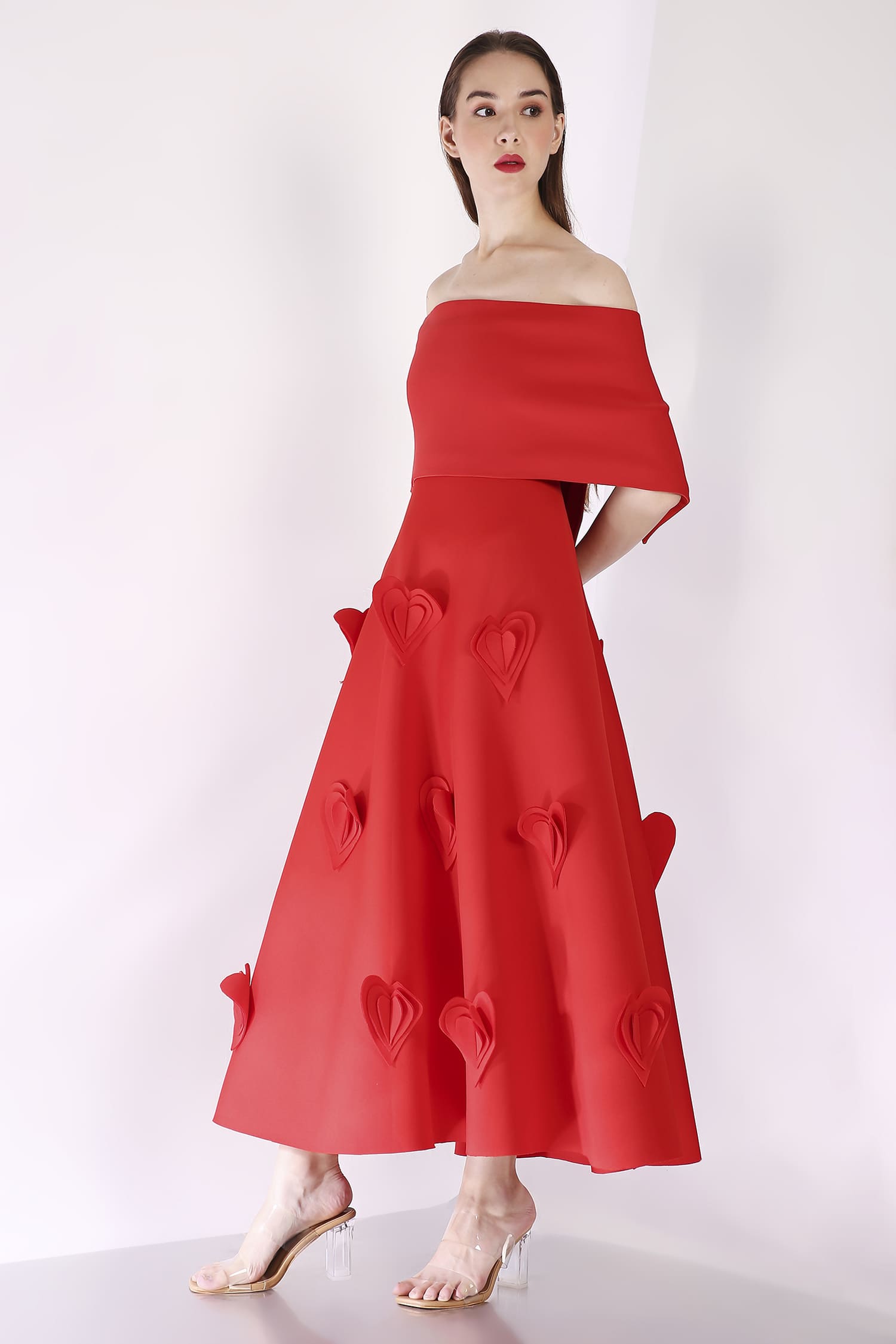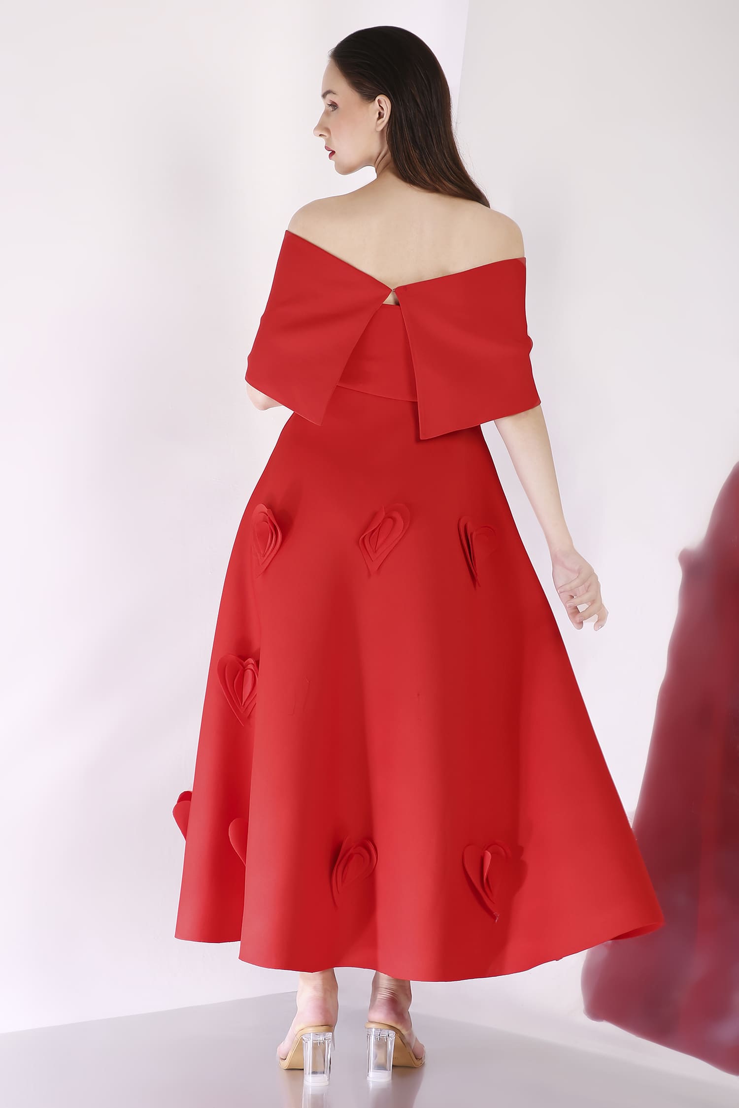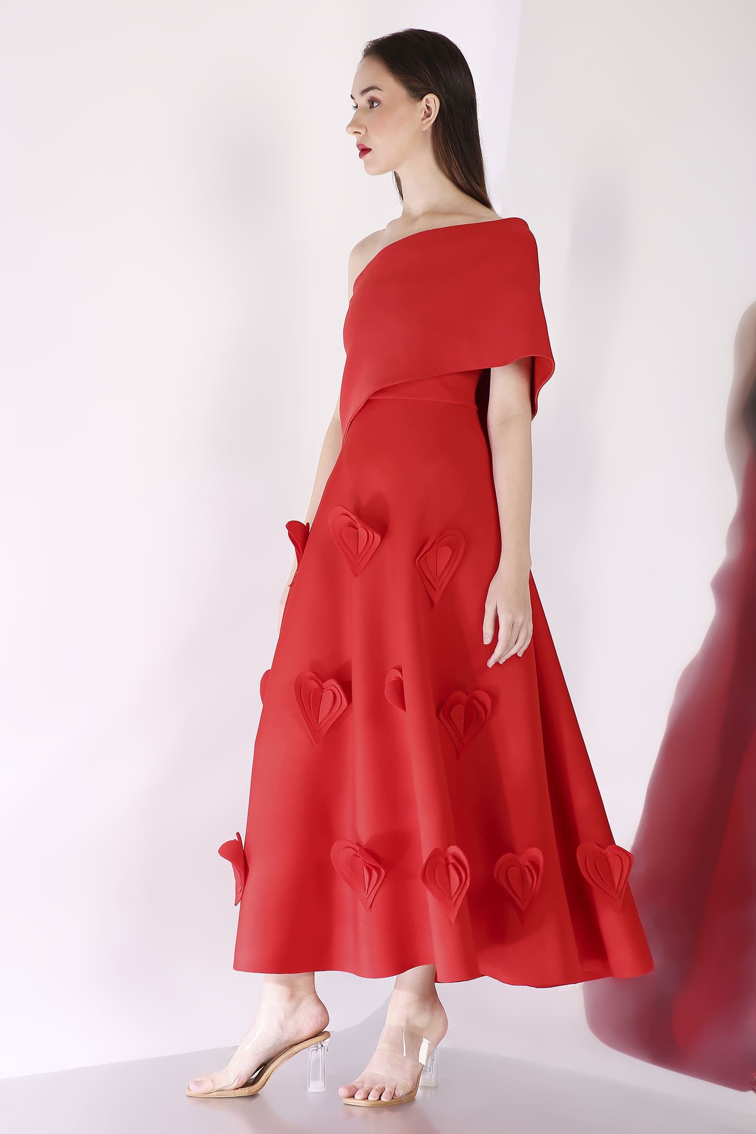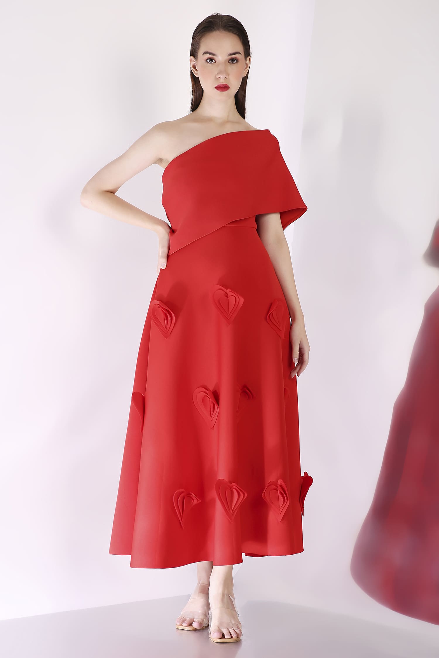 A mid-calf dress featuring heart-shaped 3D appliqués for a textured, romantic look, finished with a classic wrap that can be styled two ways: one-shoulder or off-shoulder, for a versatile, elegant touch.