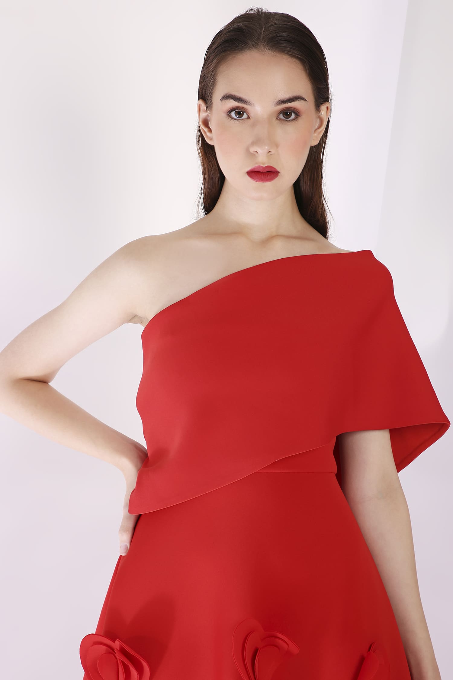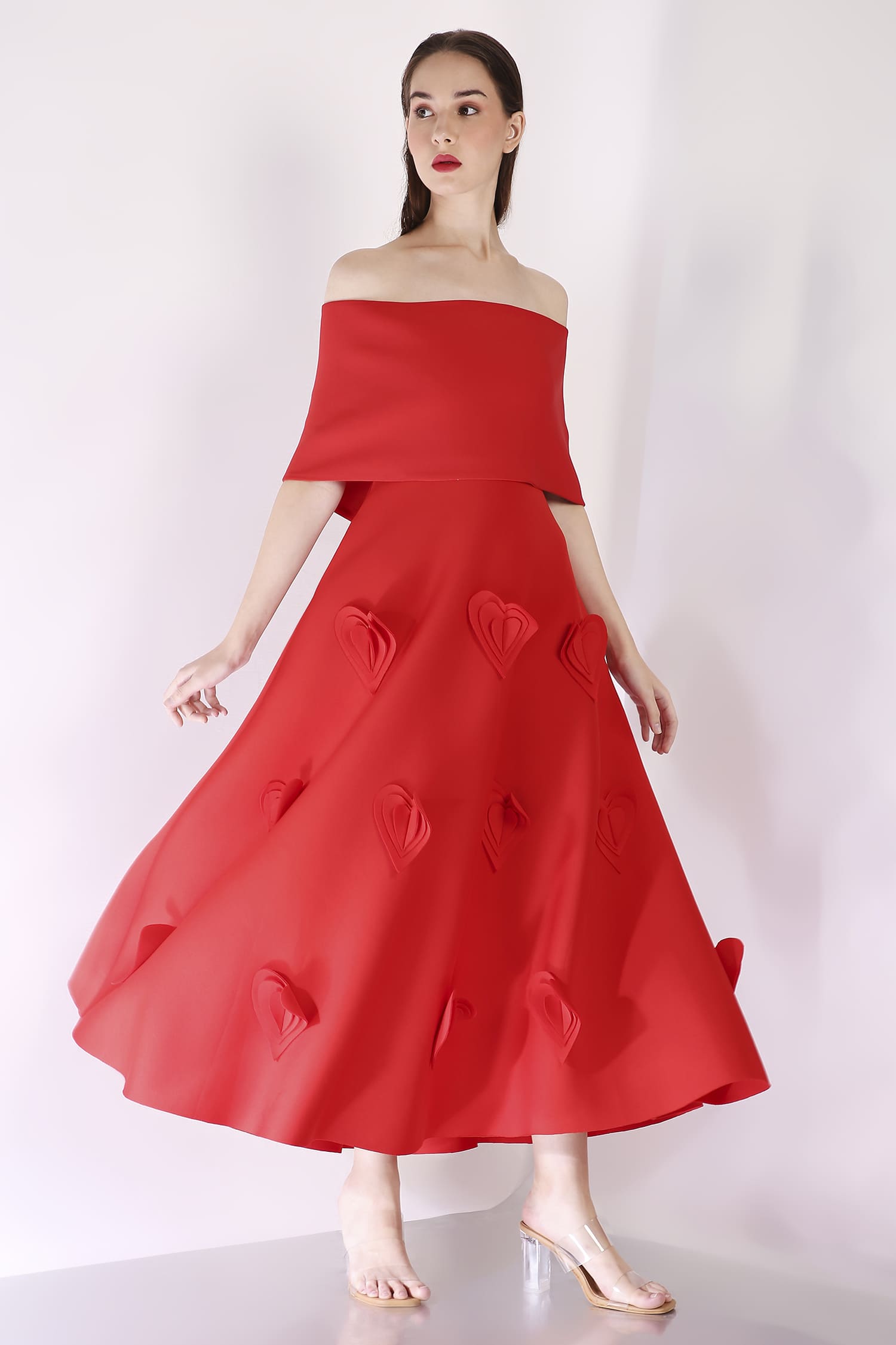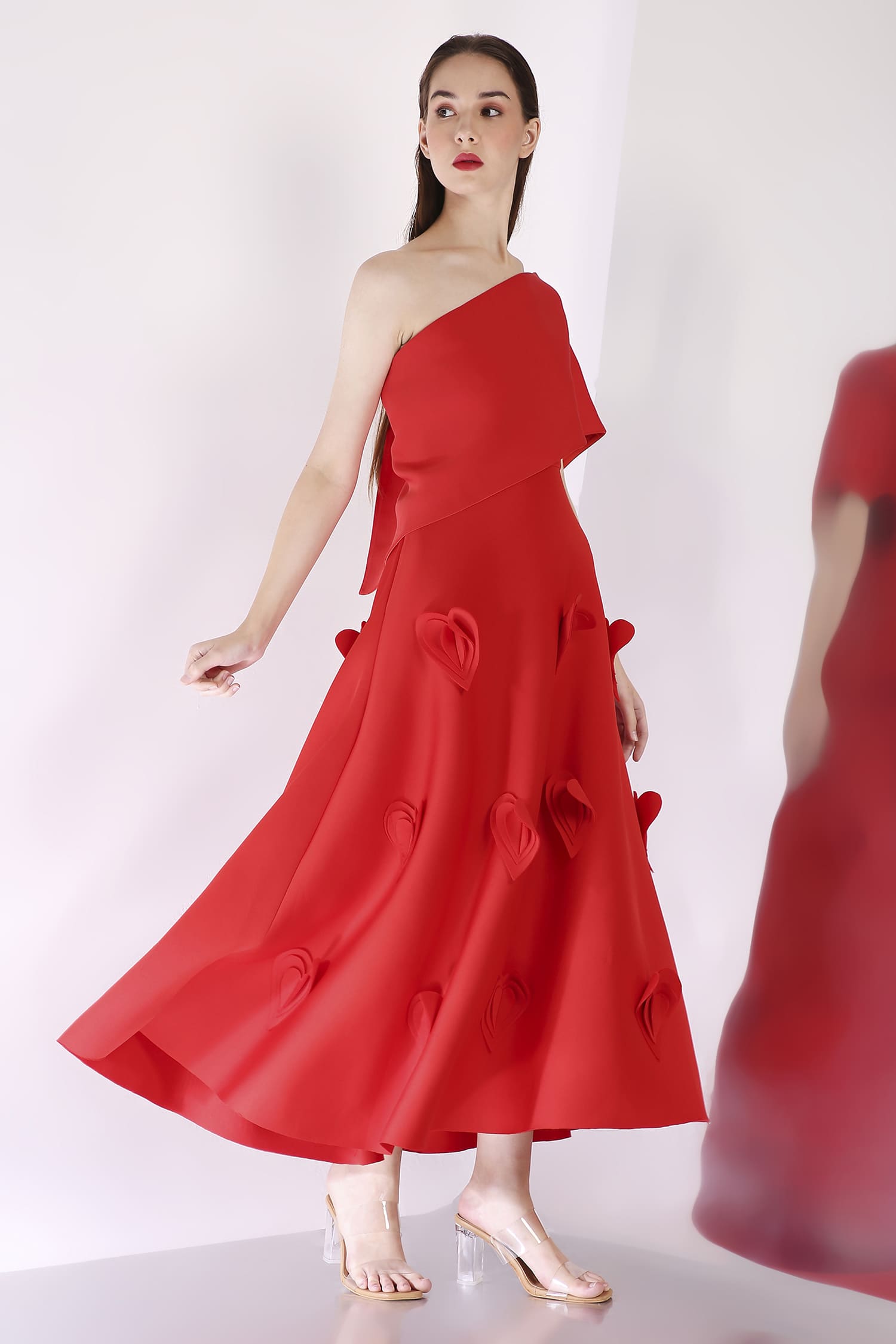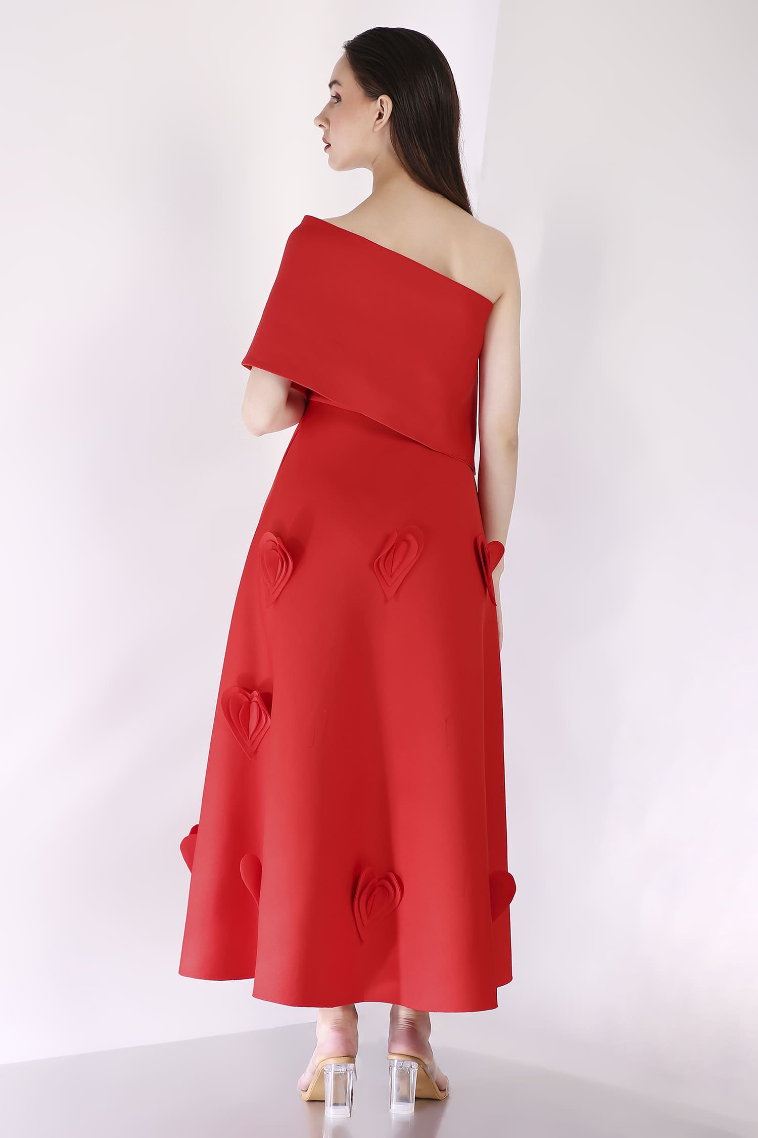 A mid-calf dress featuring heart-shaped 3D appliqués for a textured, romantic look, finished with a classic wrap that can be styled two ways: one-shoulder or off-shoulder, for a versatile, elegant touch.