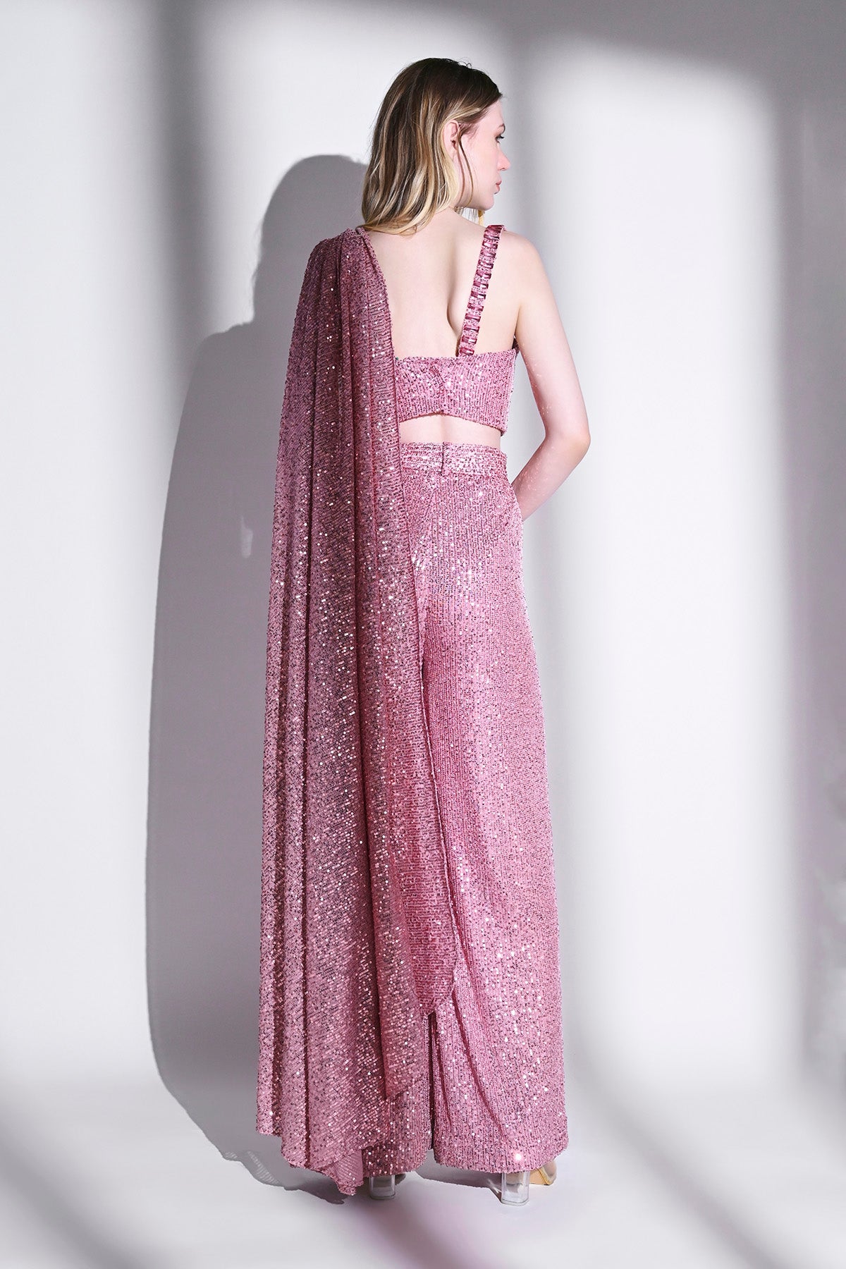 Featuring a bustier and pant set that transitions from a blazer set to a pant saree. This set includes the following pieces:
