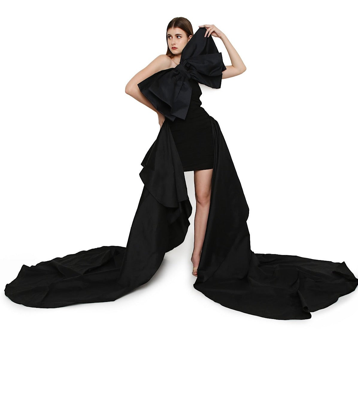 The taffeta trail is detachable and can be affixed over our garments or ypur existing ones. You can wear it on one side or both depending on the kind of exaggeration you’d like.