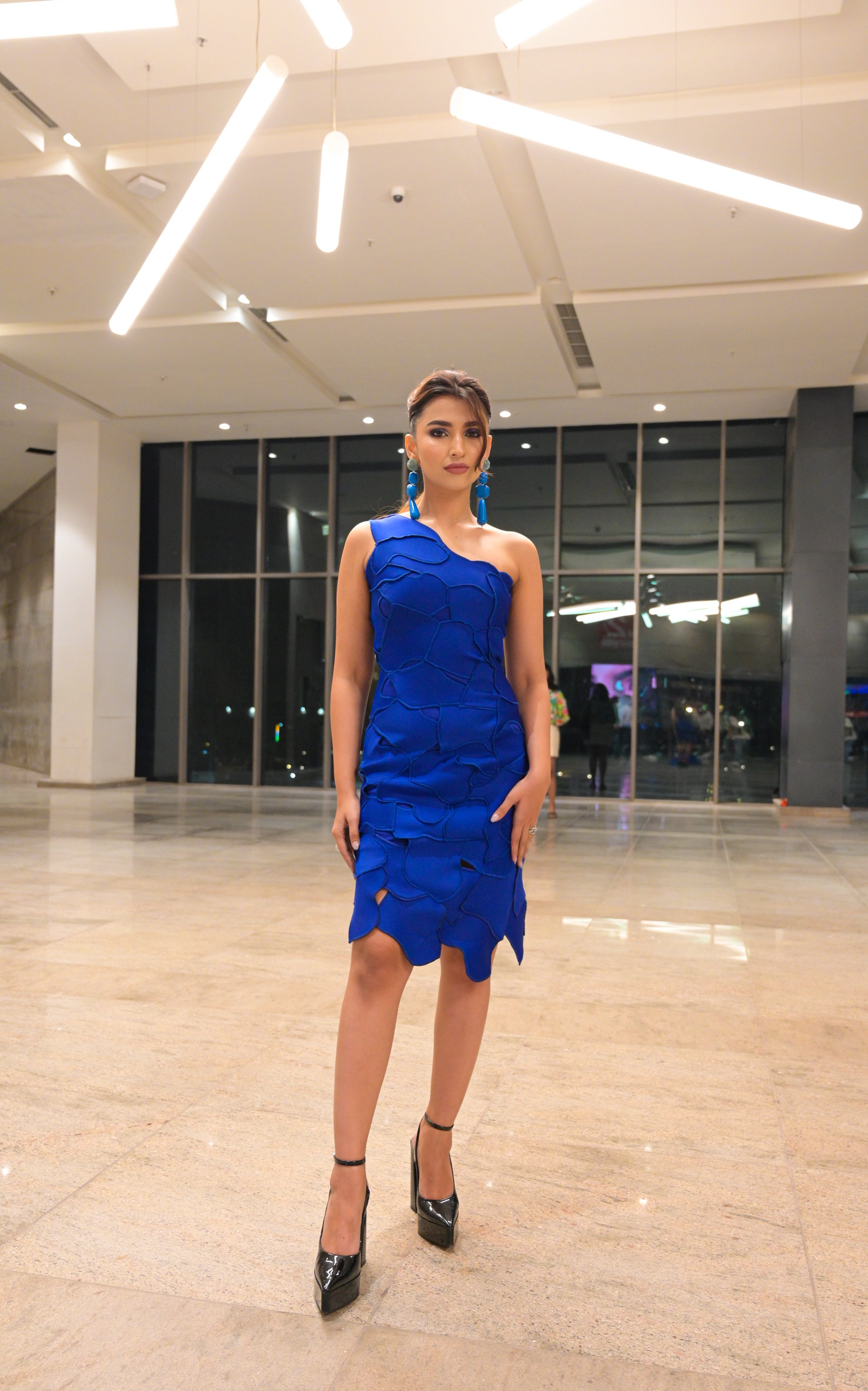 Featuring an appliqué dress with cut outs at the waist. Each appliqué is sewn in together to achieve this look.