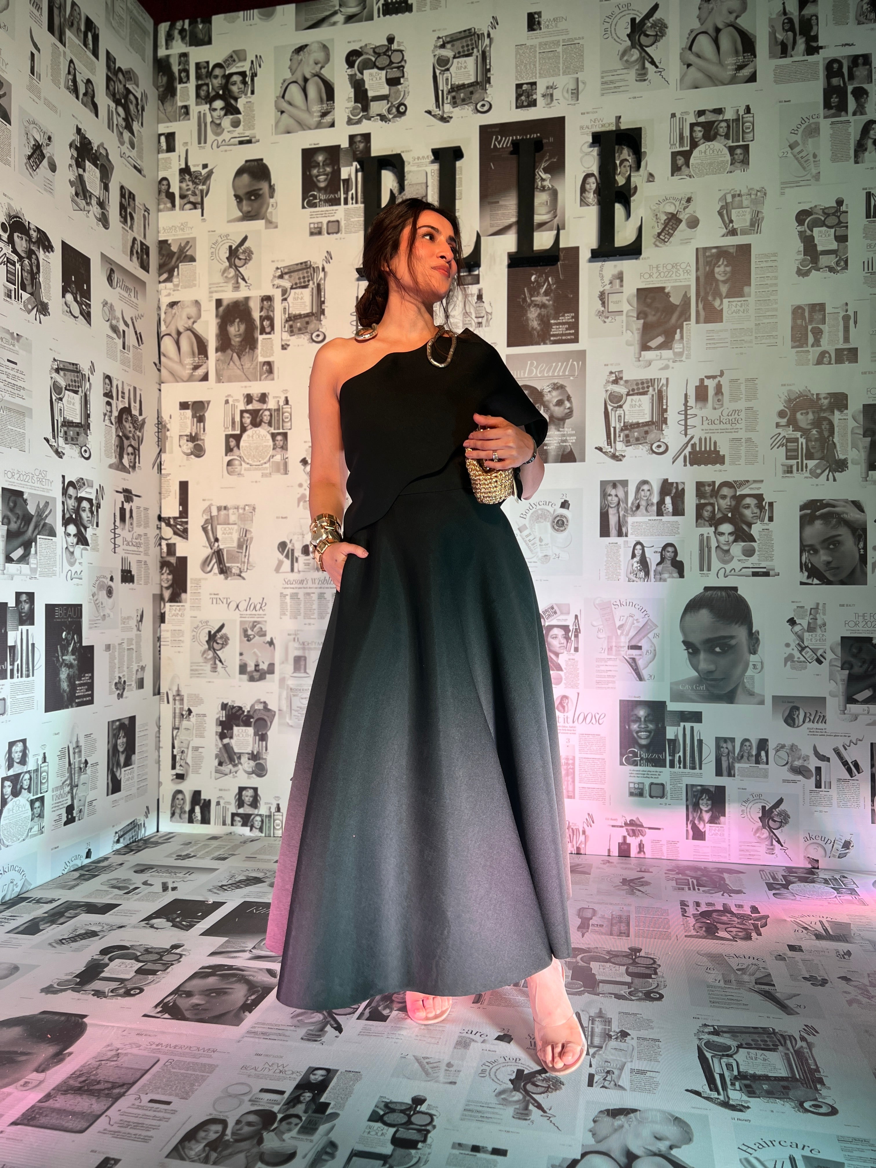 Featuring a strapless dress with our wavy overlay which can be worn off the shoulder or over one shoulder.