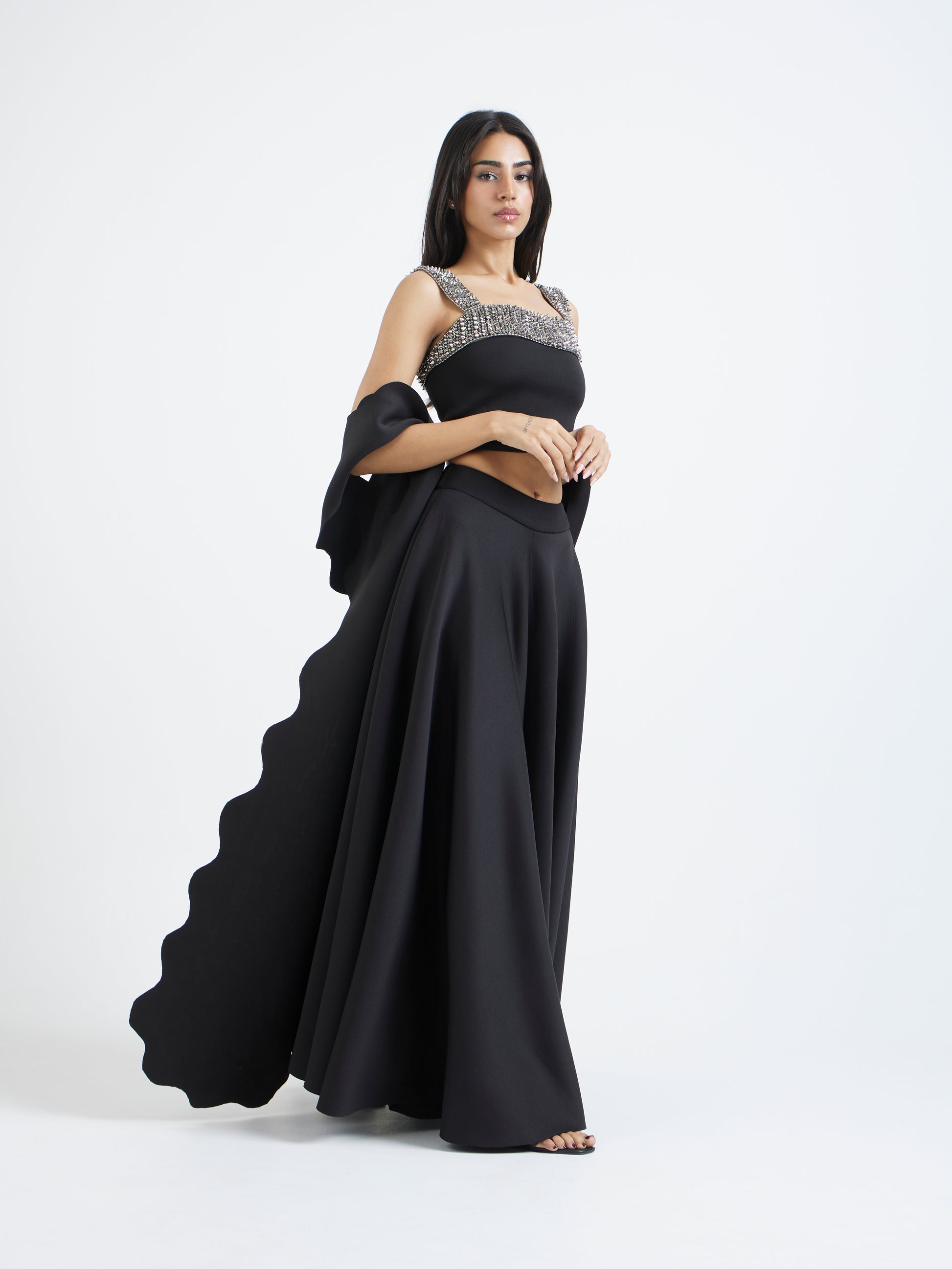 Paired with a voluminous, fluid skirt, the look blends structure with effortless movement. Statement-making yet minimal at its core, this ensemble is designed for the modern muse who loves clean lines, refined embellishment, and standout silhouettes.