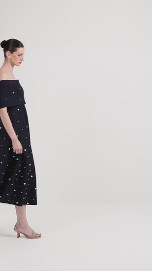 The silhouette falls into a fluid but structured flare, adorned with meticulously placed stones that catch the light in soft, scattered glimmers.