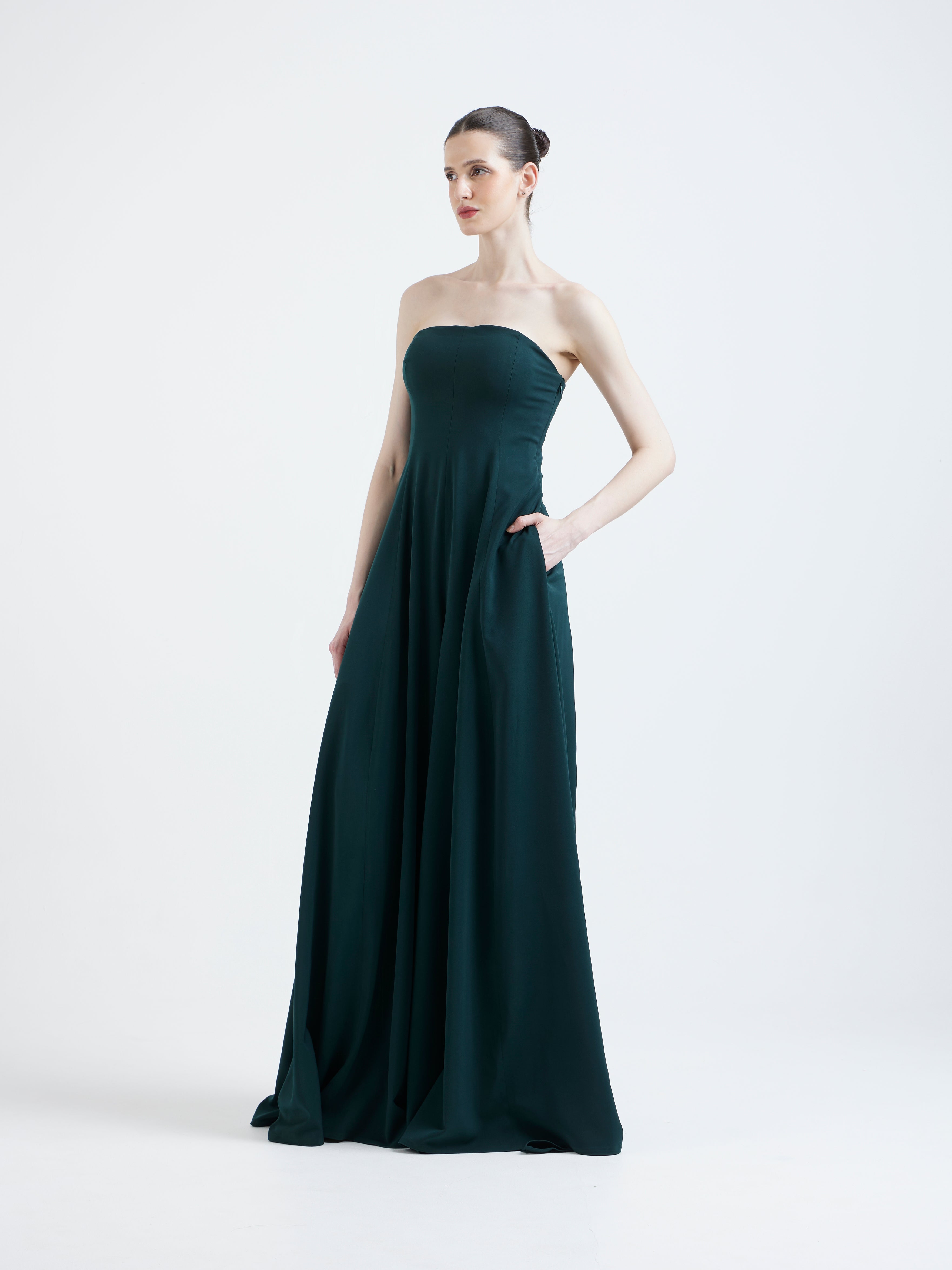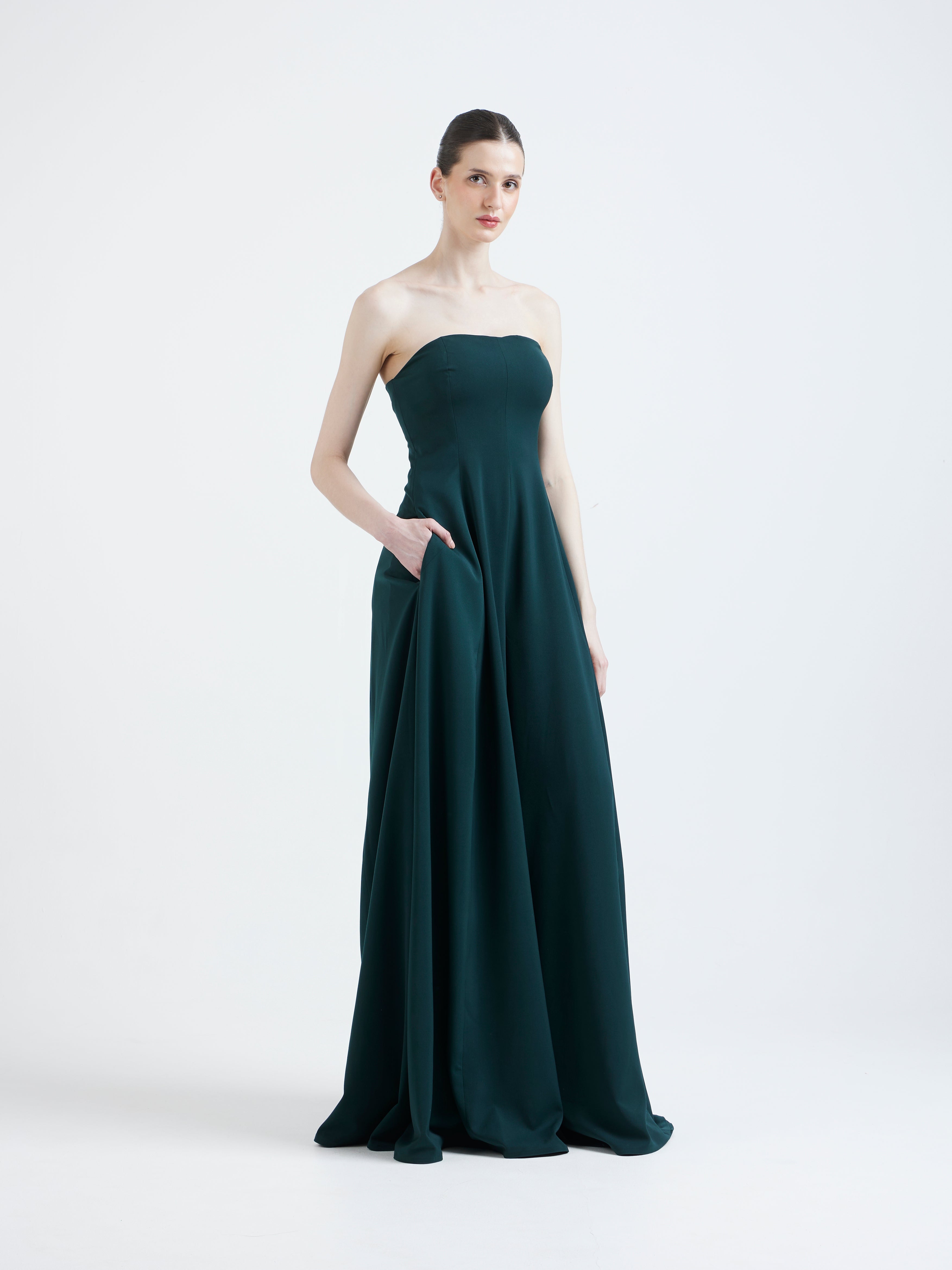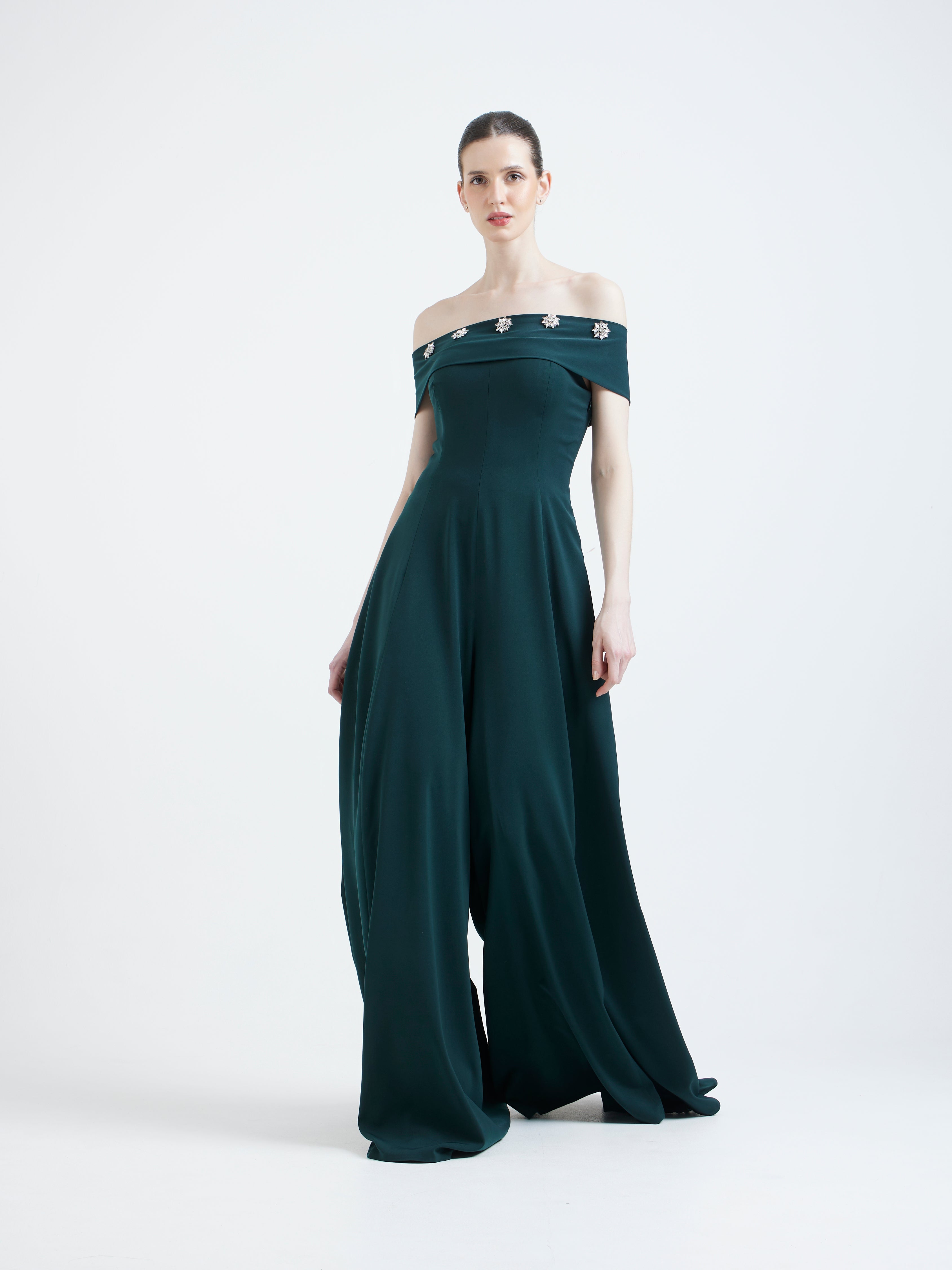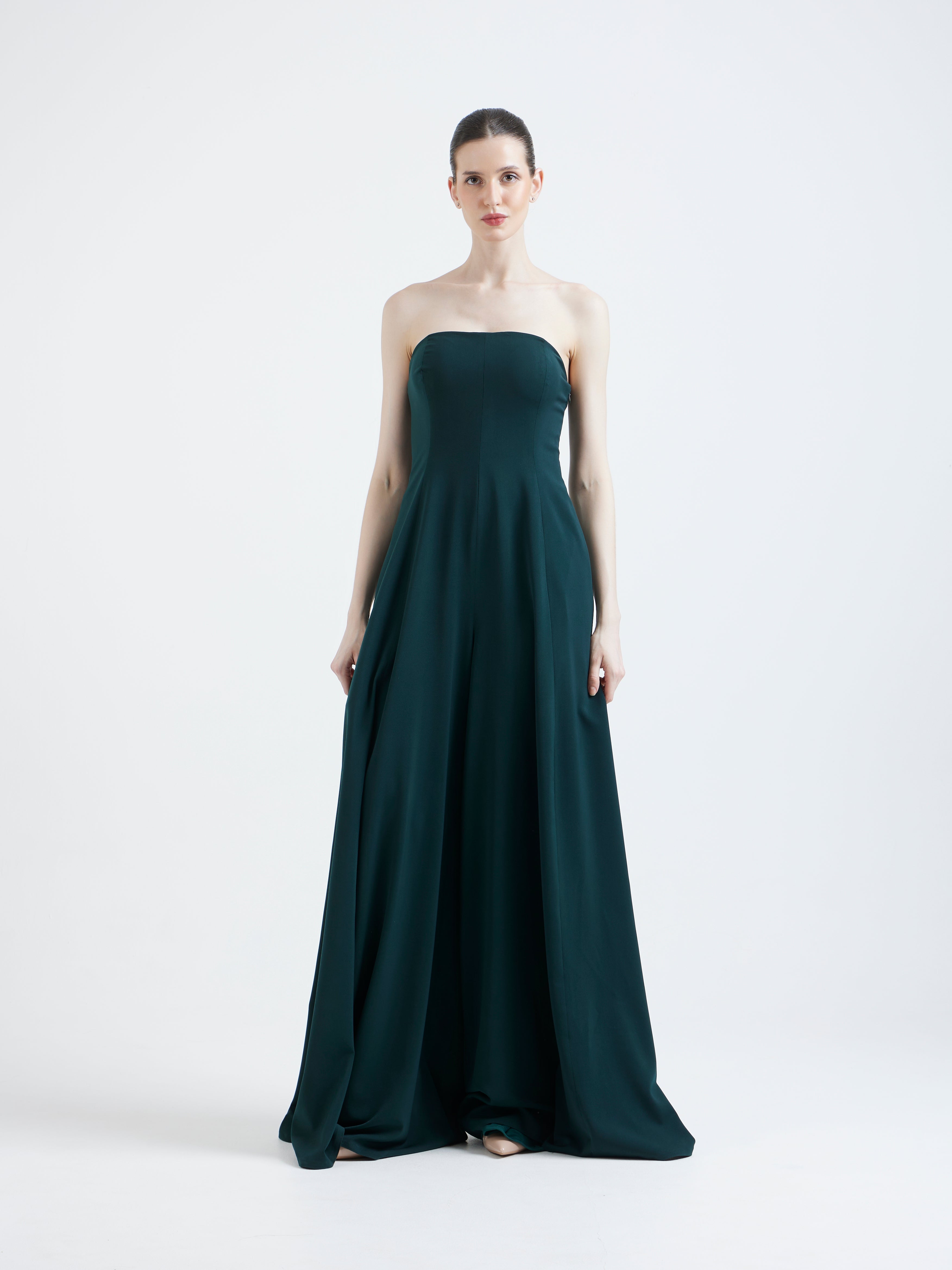 A fluid, strapless jumpsuit paired with a detachable studded wrap that instantly elevates the silhouette. The strapless base flows into wide, gown-like panels, creating effortless movement and a refined, elongated shape.