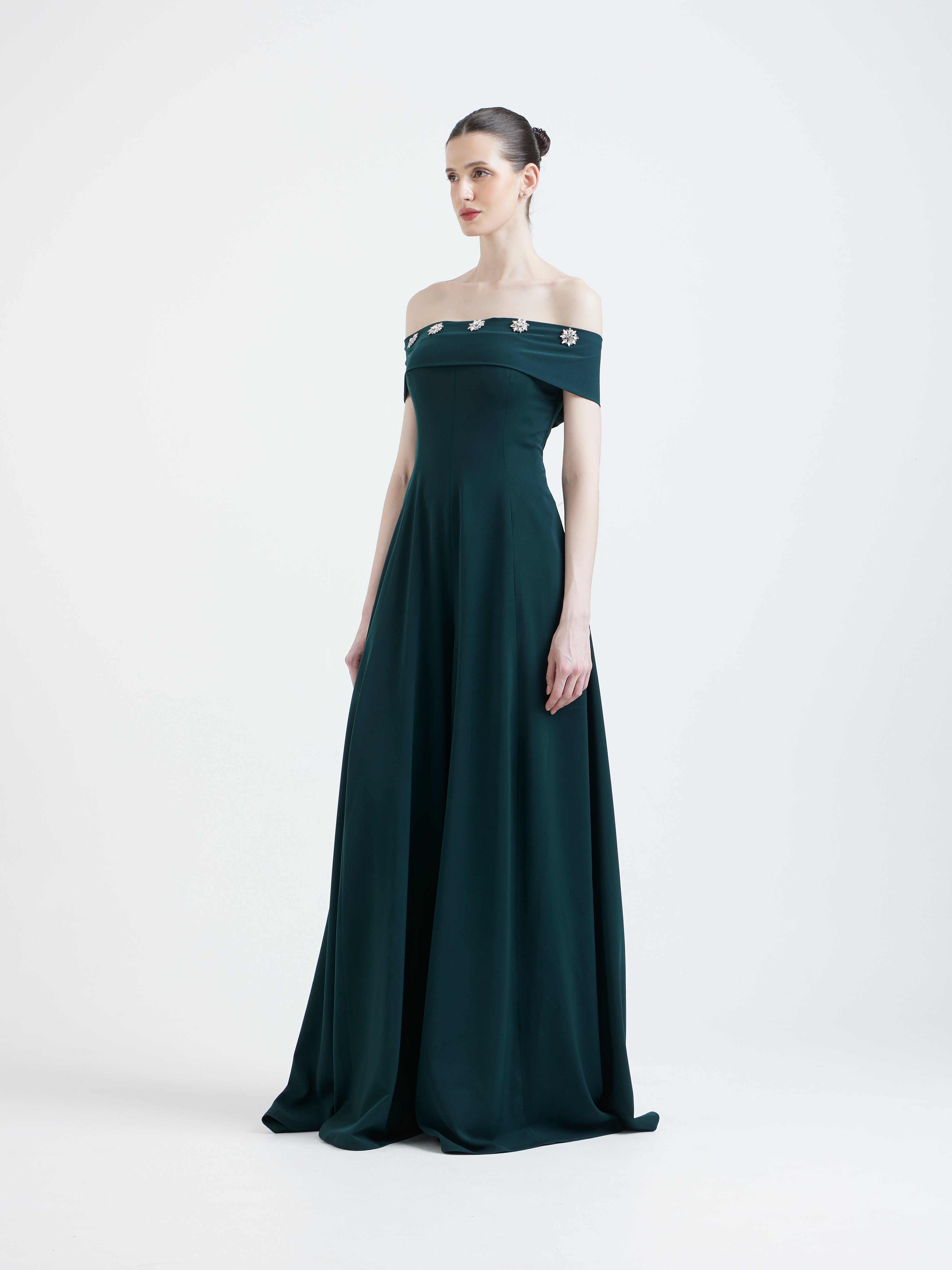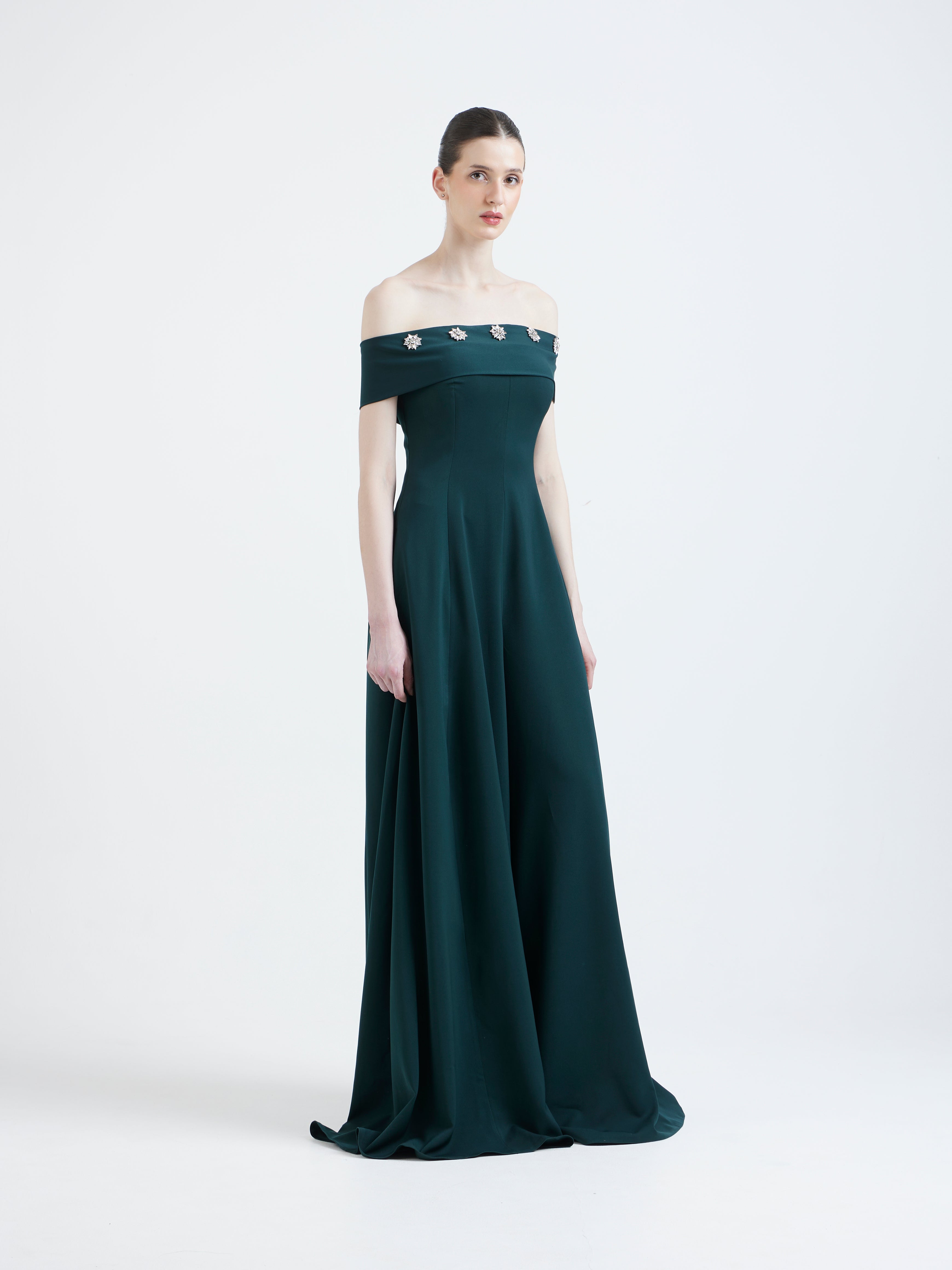 The detachable off-shoulder wrap is embellished with crystal-studded motifs, adding a touch of shine and old-world glamour. Versatile, graceful, and timelessly modern—this set transitions from understated elegance to statement luxury in a single gesture.