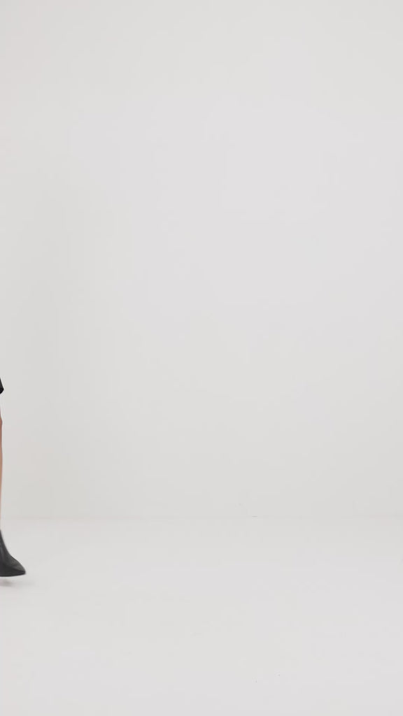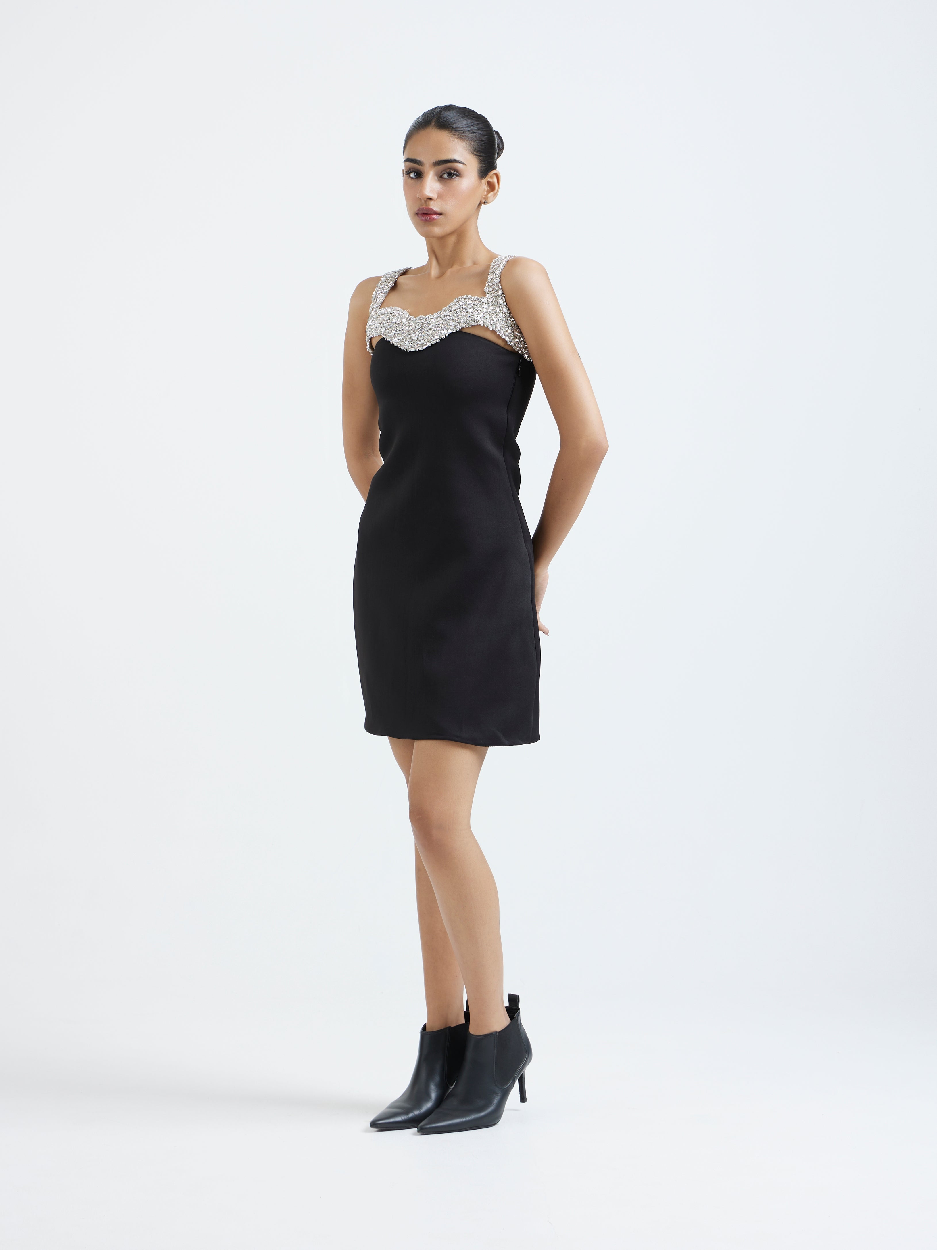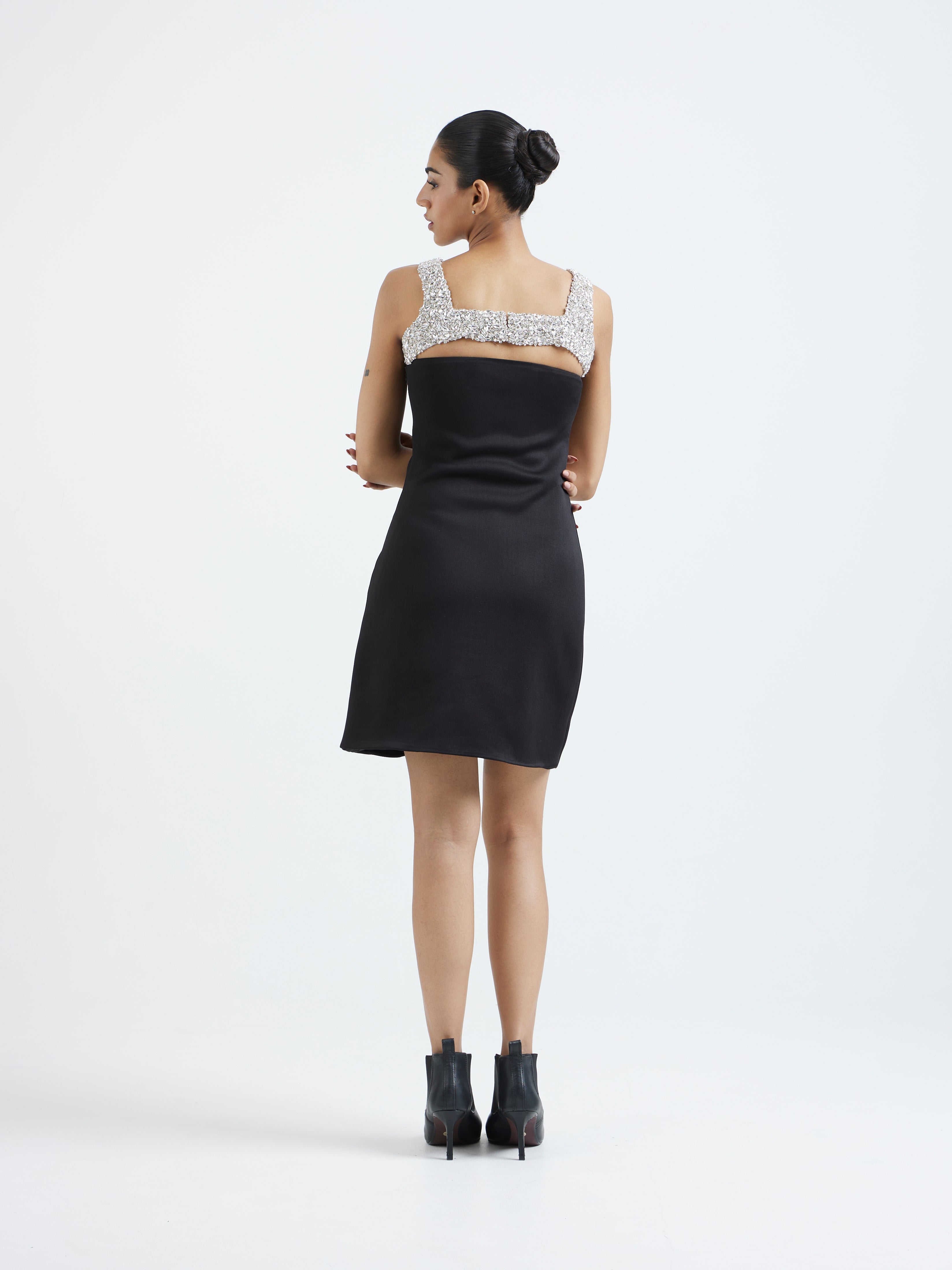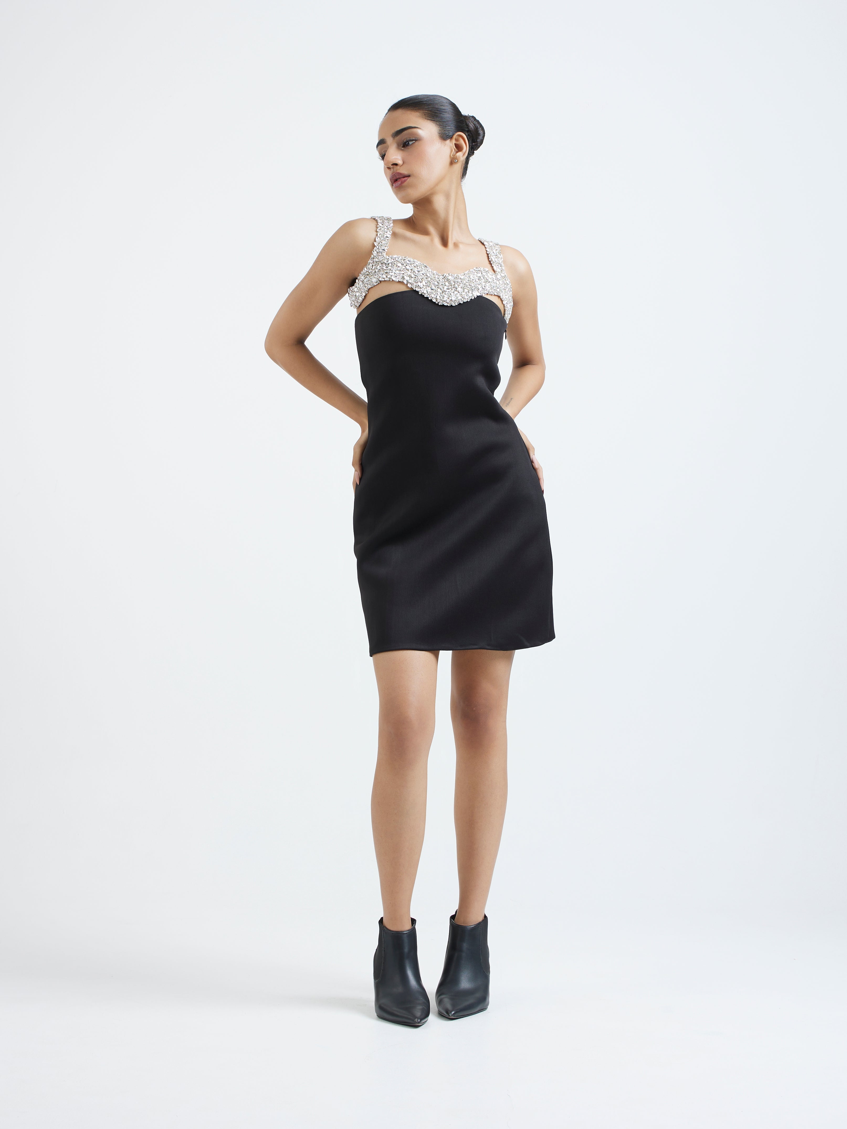 A black neoprene dress elevated with a sculpted embellished overlay that frames the neckline beautifully. The sleek silhouette keeps the look modern and minimal, while the shimmering hand-worked detailing adds just the right amount of glamour.