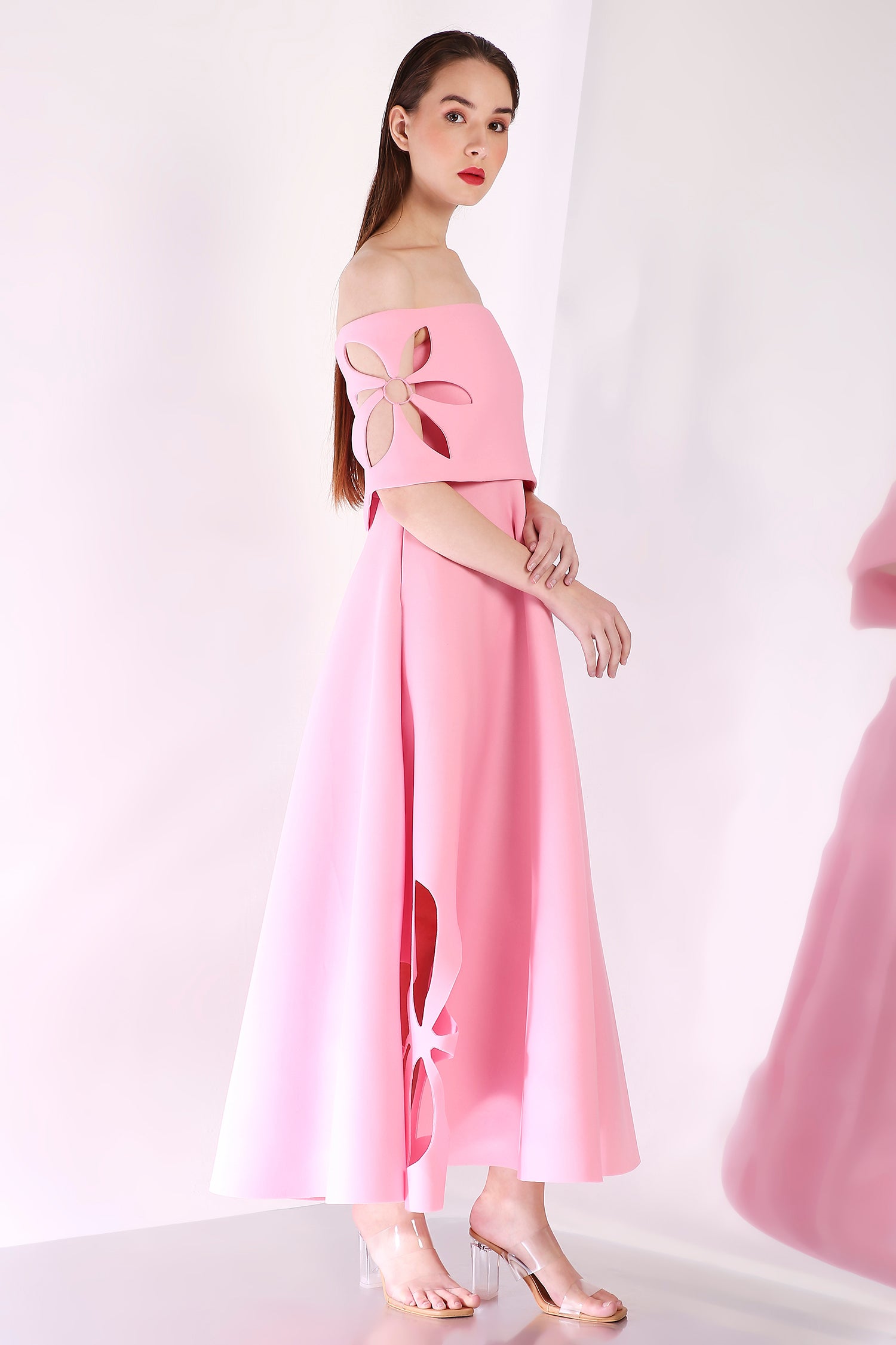 A strapless fit-and-flare dress in premium neoprene with a cutout floral motif on the hem, complemented by a cutout wrap that can be styled one-shoulder or off-shoulder. This ensemble offers chic versatility and refined elegance.