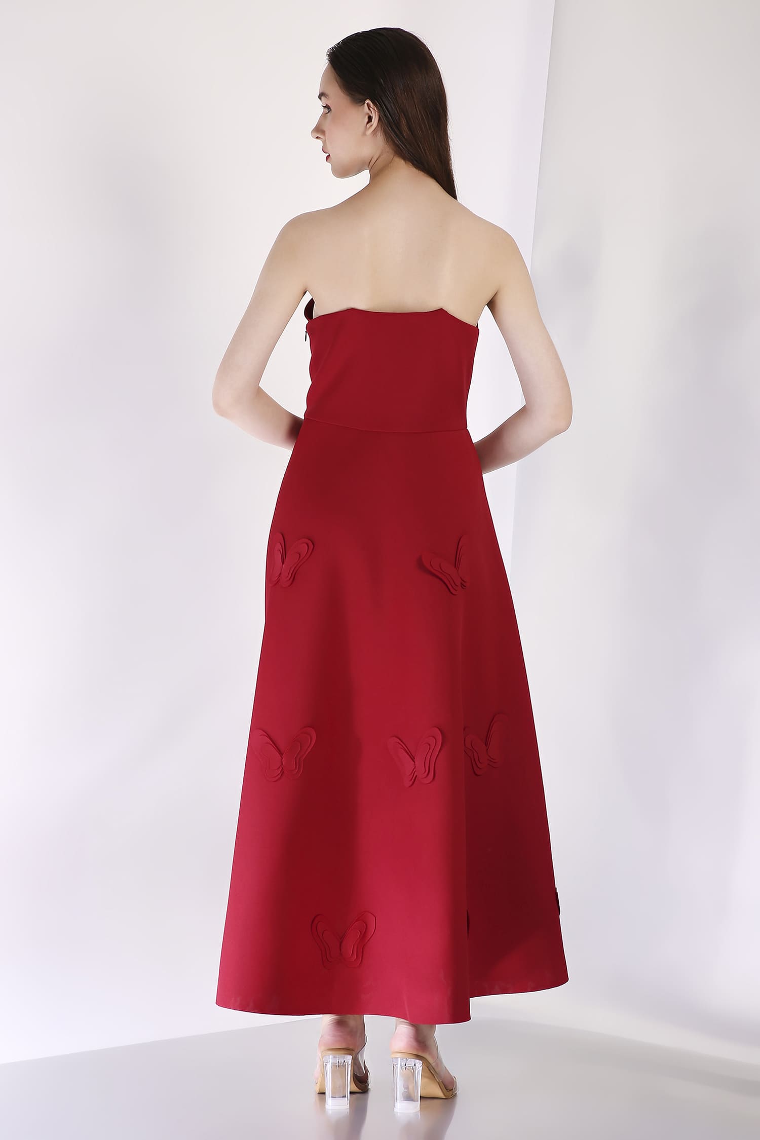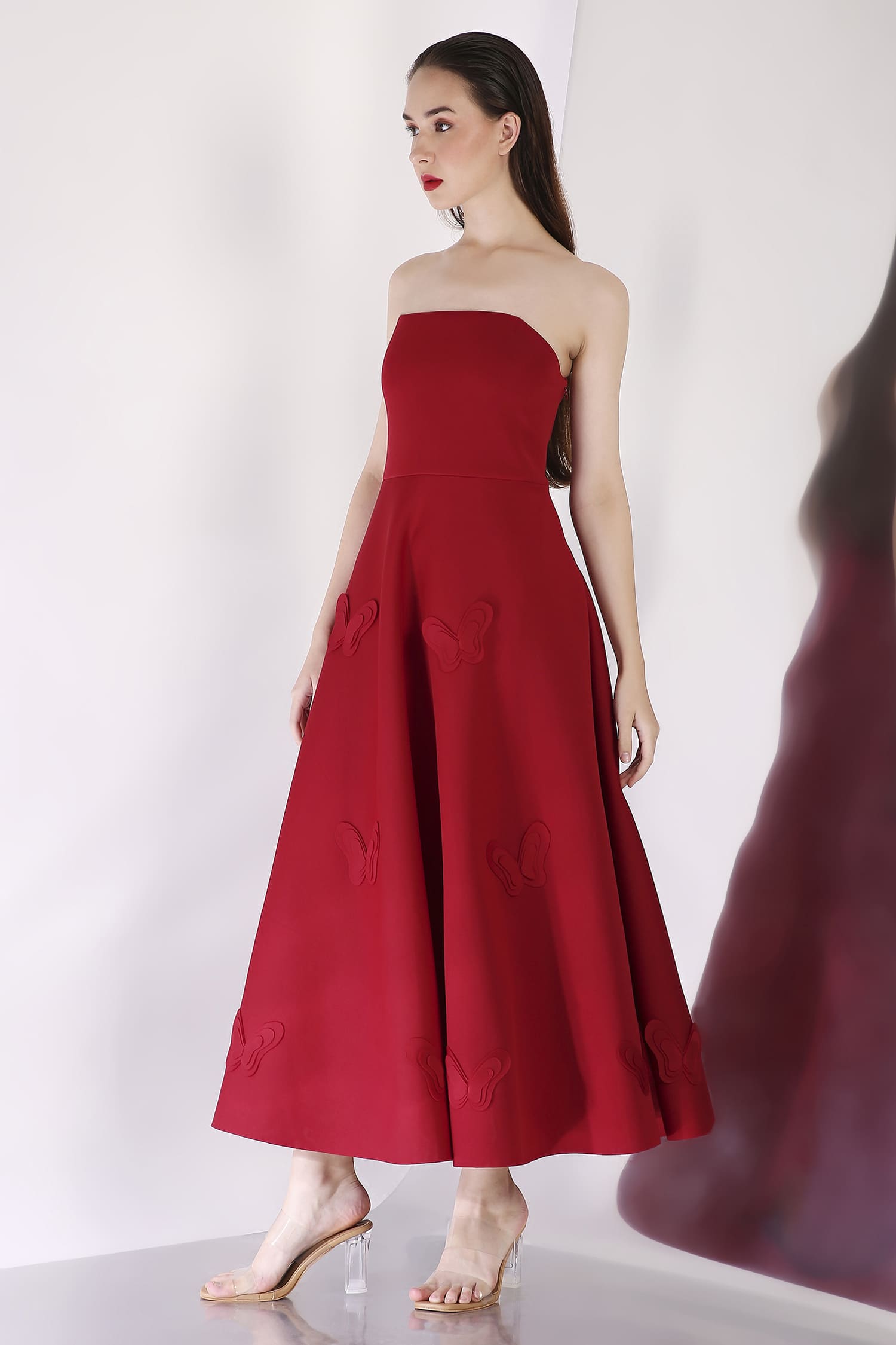 A strapless fit-and-flare mid-calf dress featuring butterfly appliqués for a textured, romantic look.