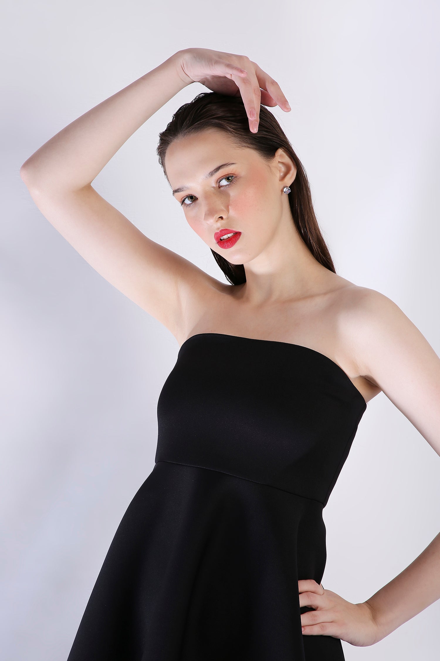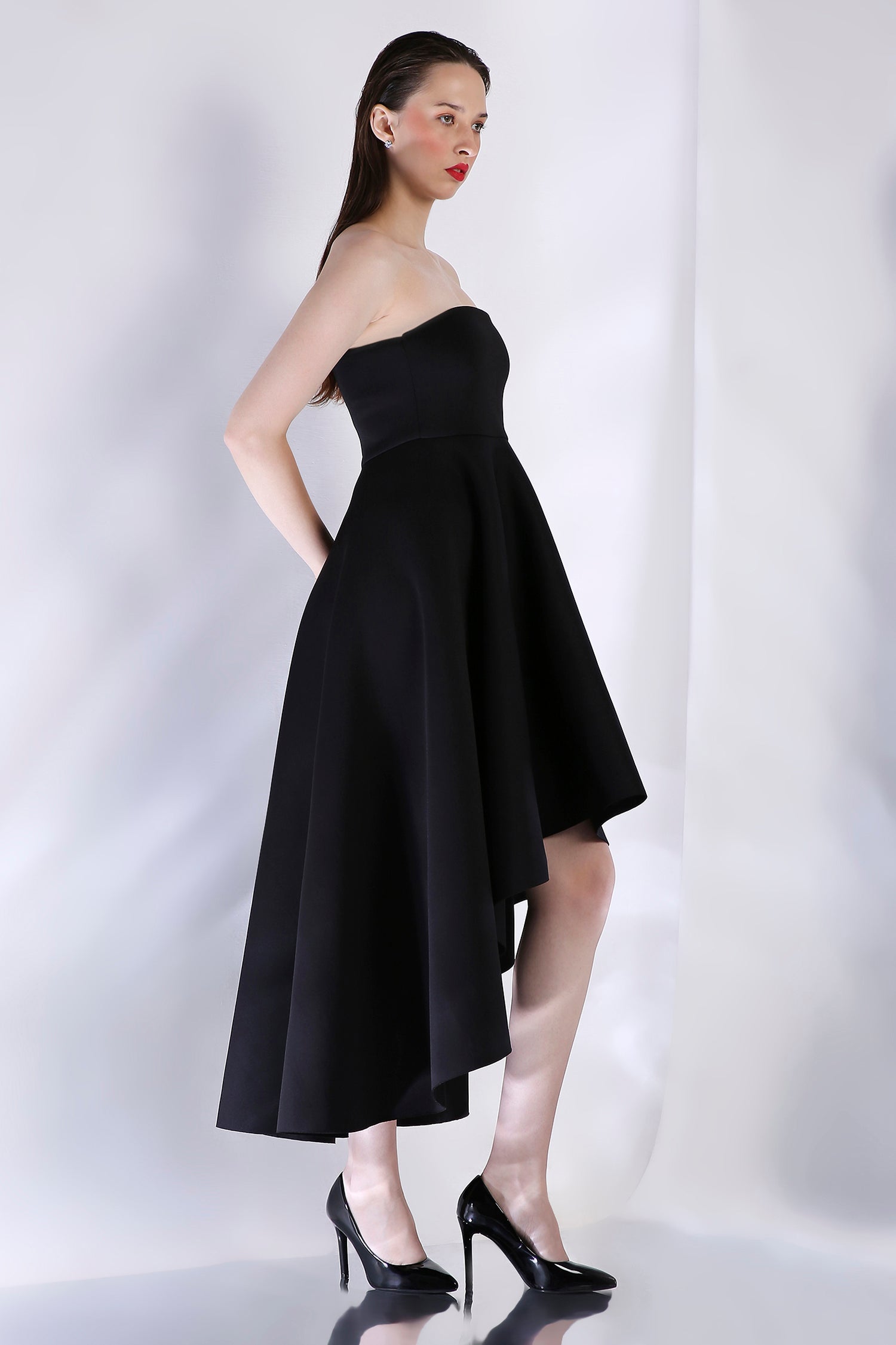 Introducing the Classic Imperial dress—a black, strapless high-low fit-and-flare piece designed to flatter every curve. This chic silhouette pairs beautifully with any of our signature wraps, available for separate purchase, allowing you to elevate the look for any occasion.
