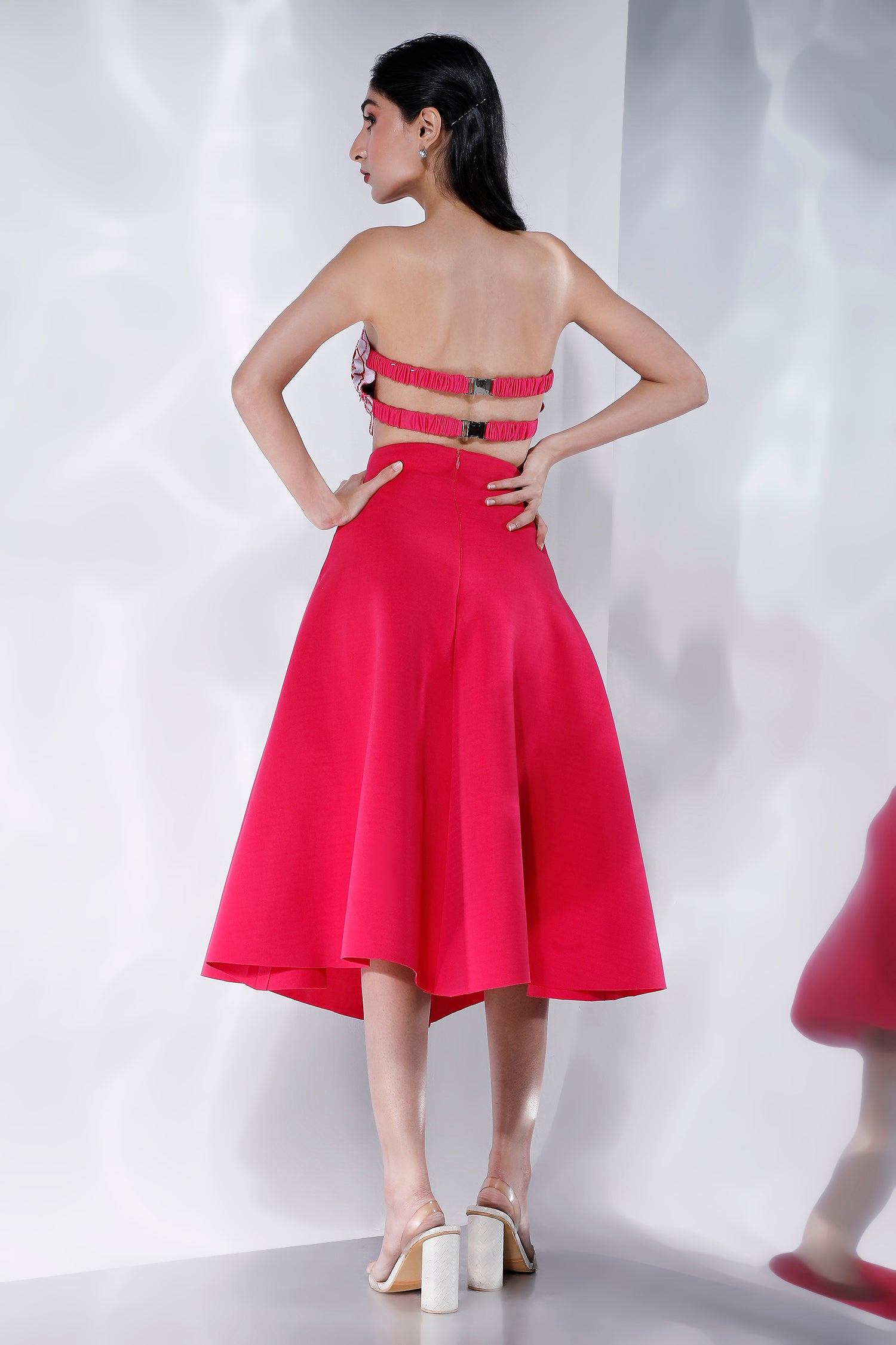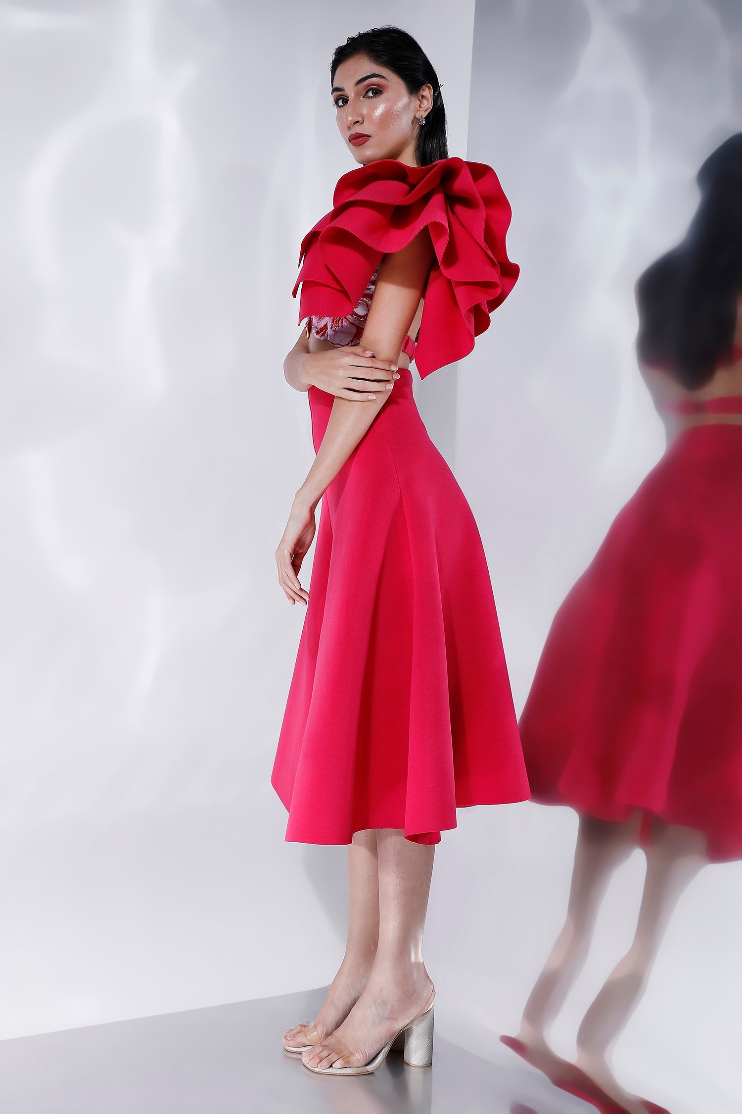 Featuring a set of a crop, structured skirt and detachable ruffles.