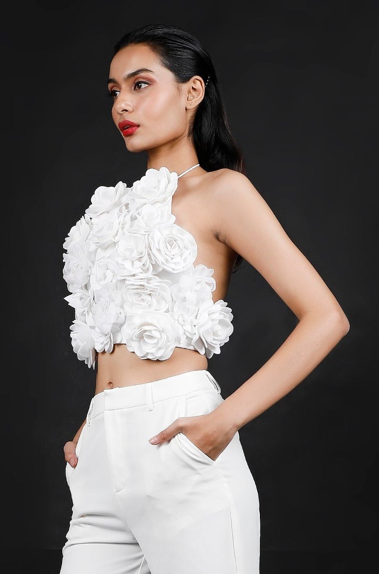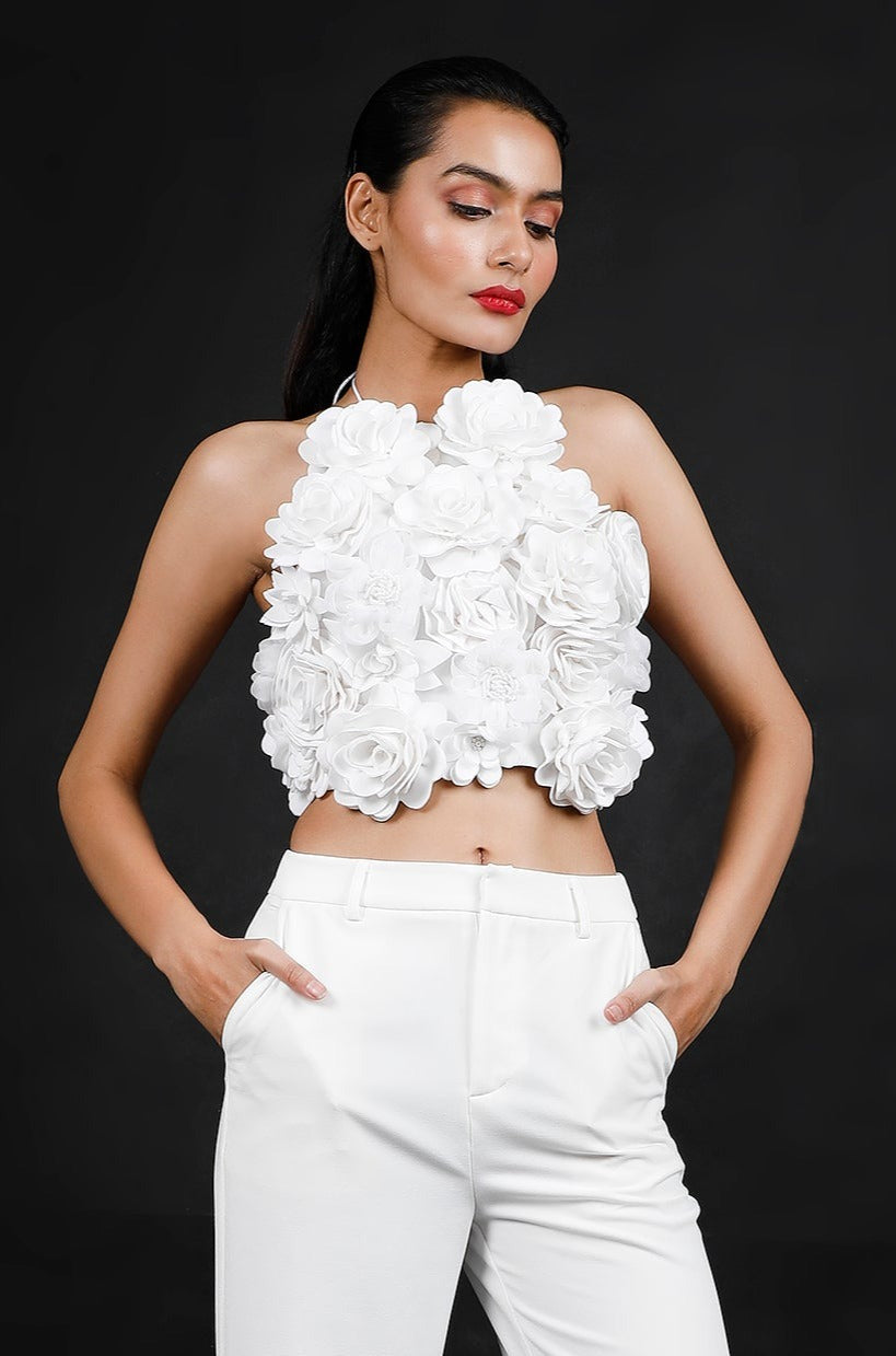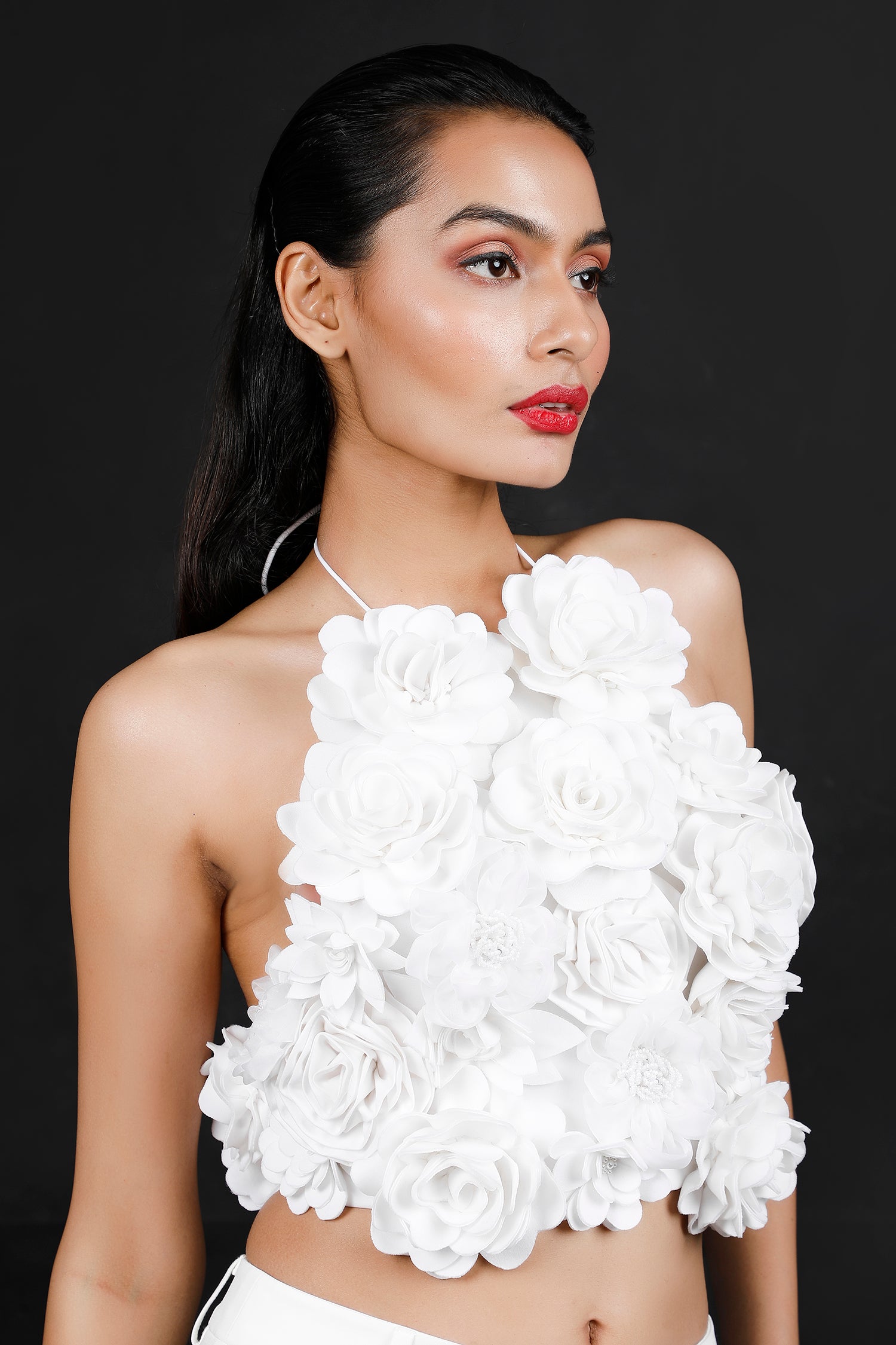 Featuring a backless crop with handmade flowers embroidered all over. The back is supported by drawstrings and a buckle closure.
