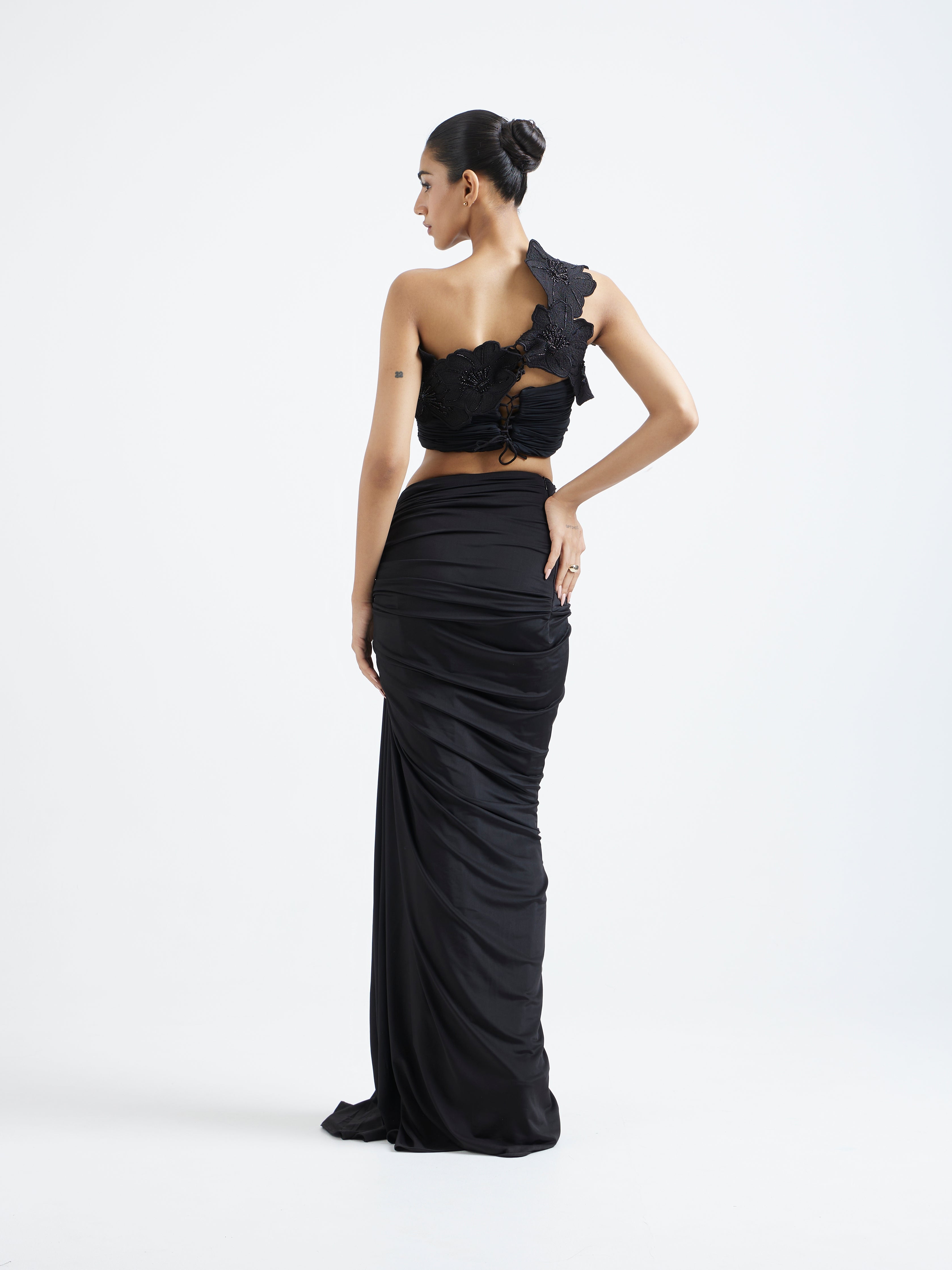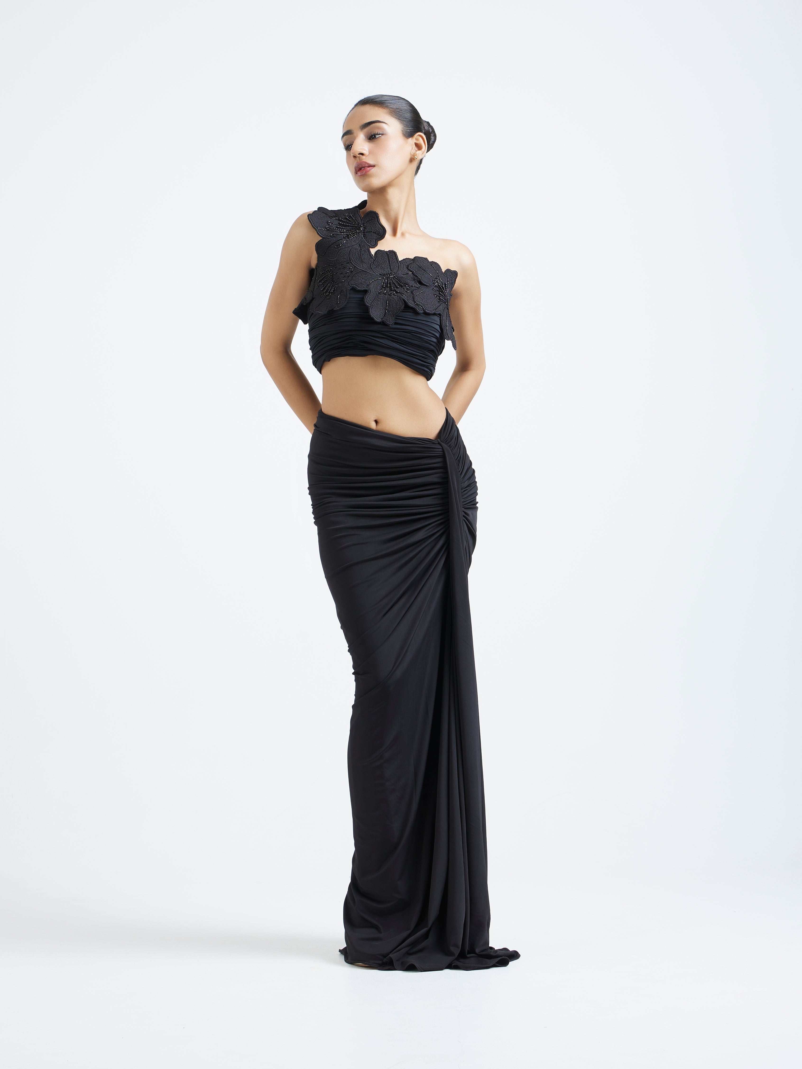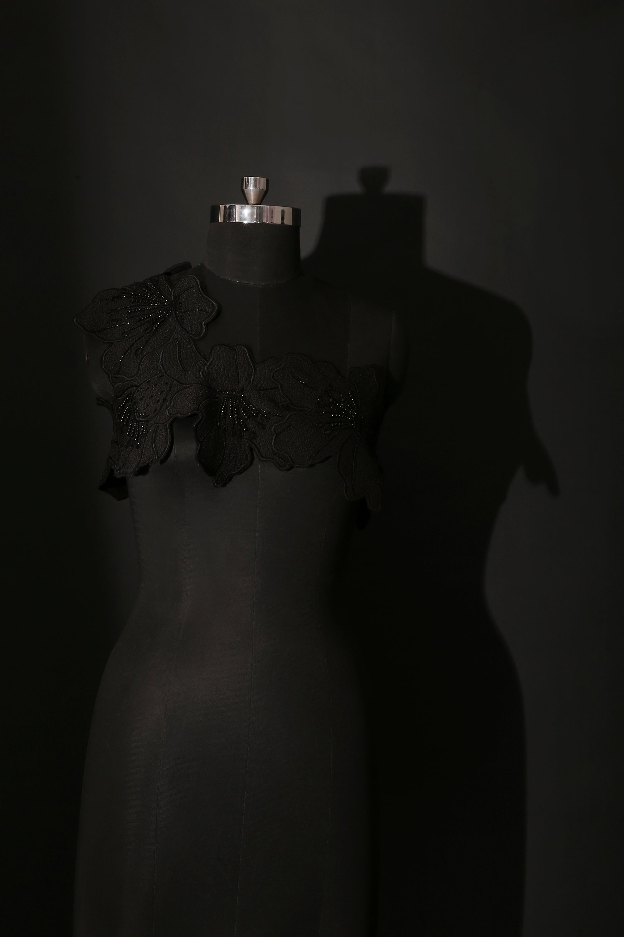 A sculpted floral overlay featuring hand-embroidered floral motifs in rich black tones.