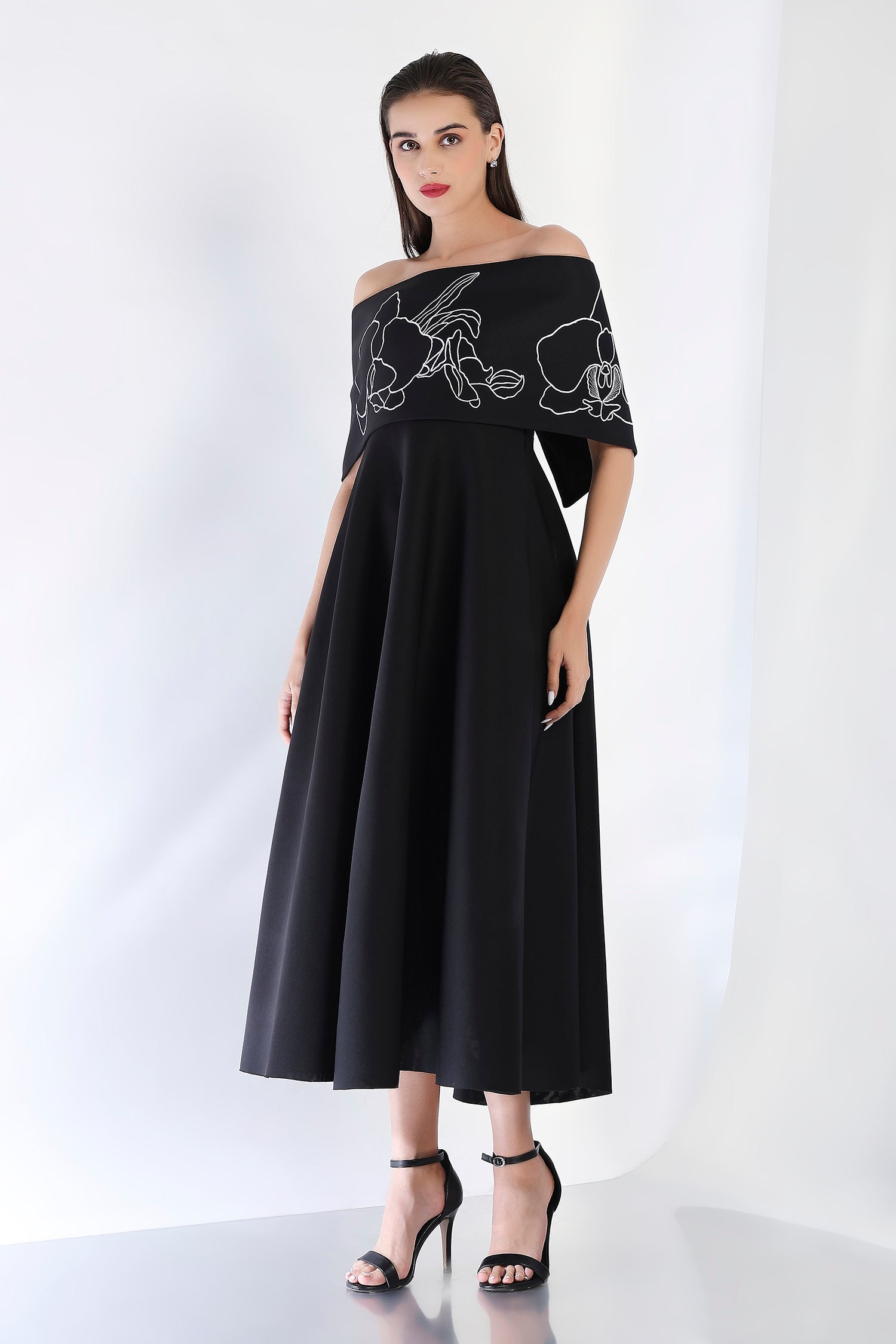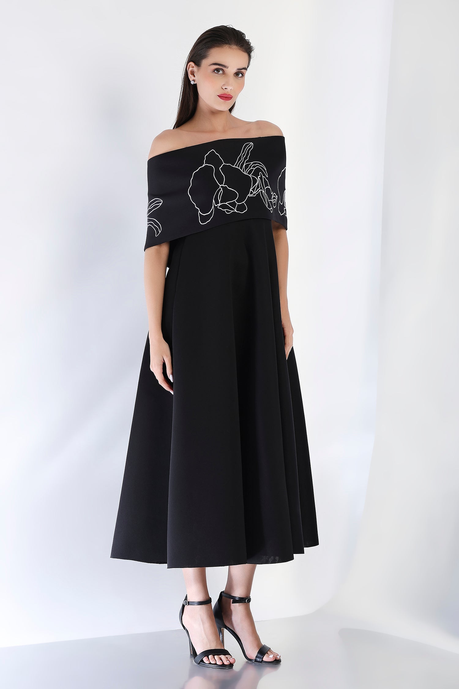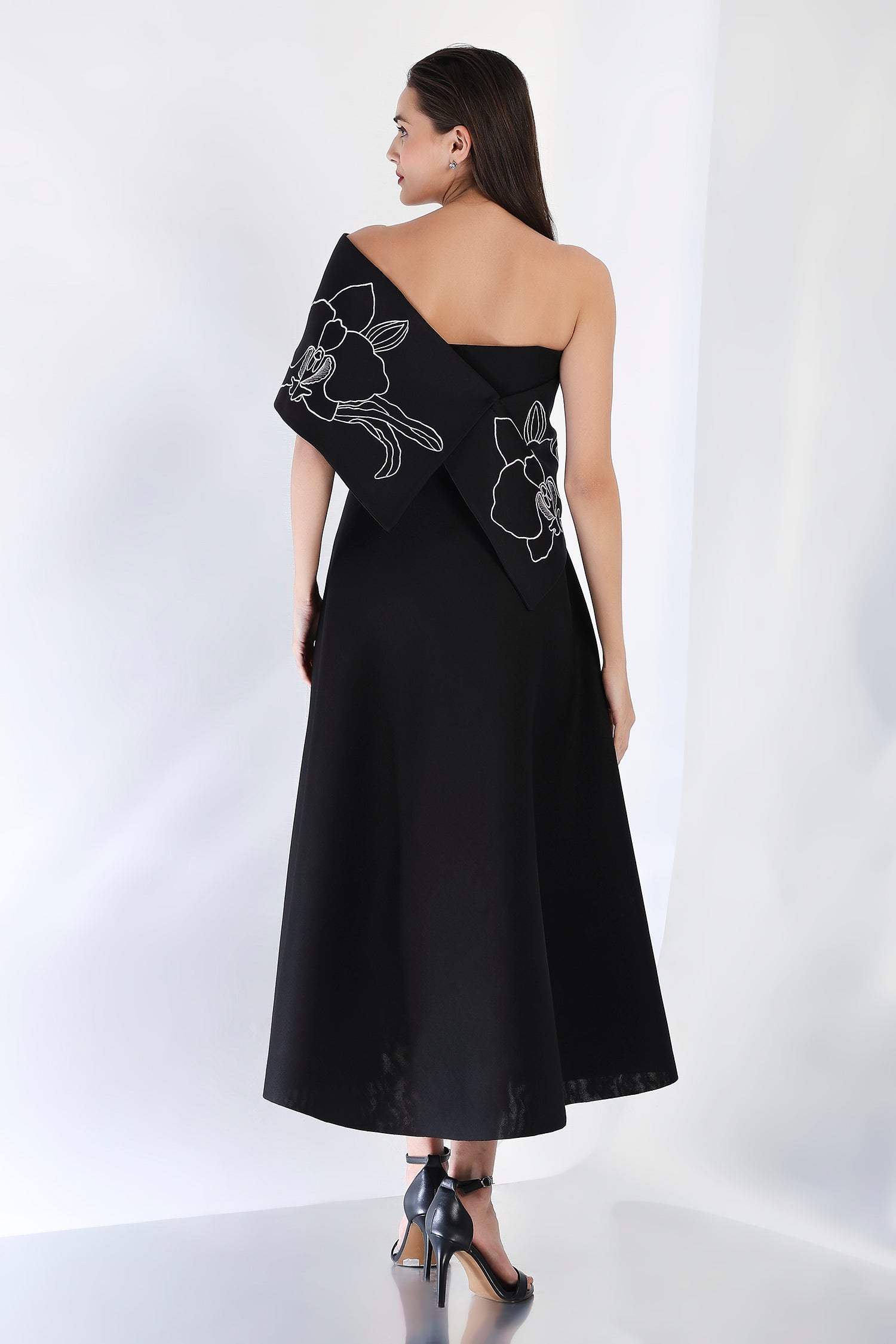 Sophisticated and striking, this strapless black midi dress features a flattering fit-and-flare design, complemented by the Vero embroidered wrap. The intricate embroidery and dual styling options—one-shoulder or off-shoulder—elevate this dress, making it a perfect choice for any refined evening occasion.