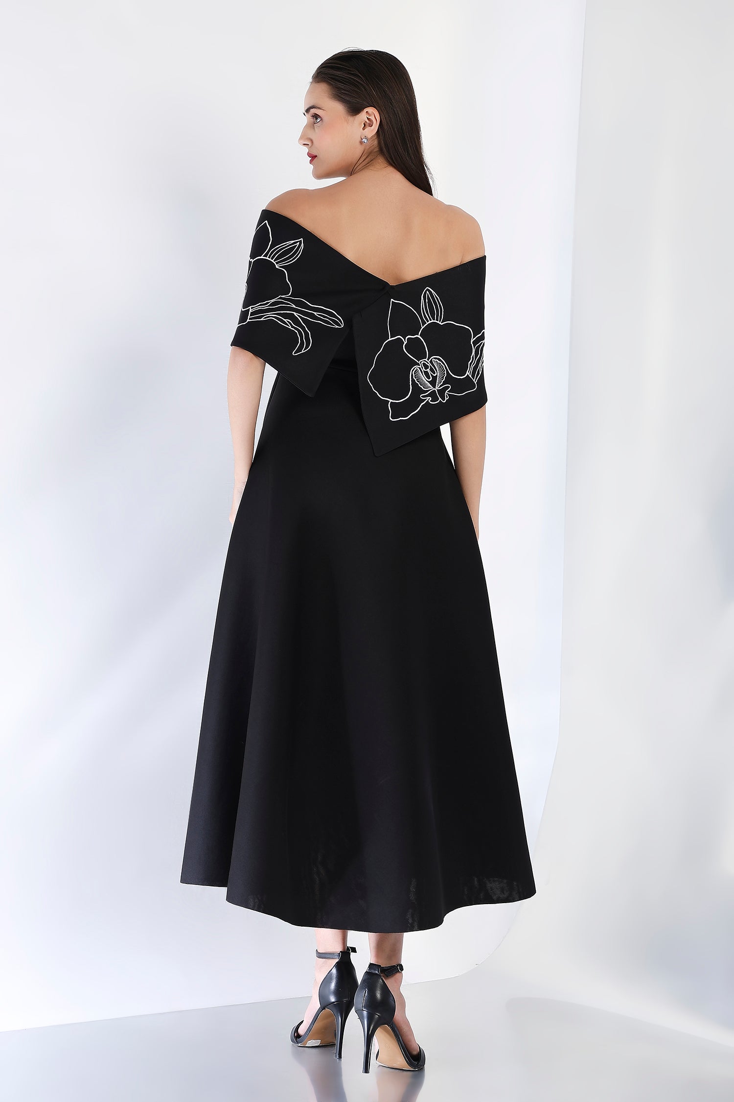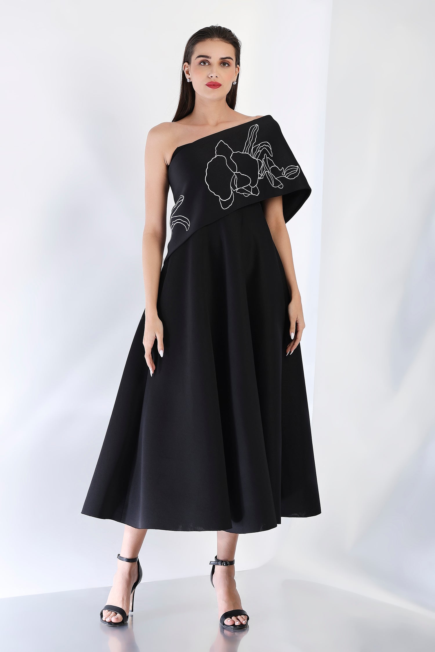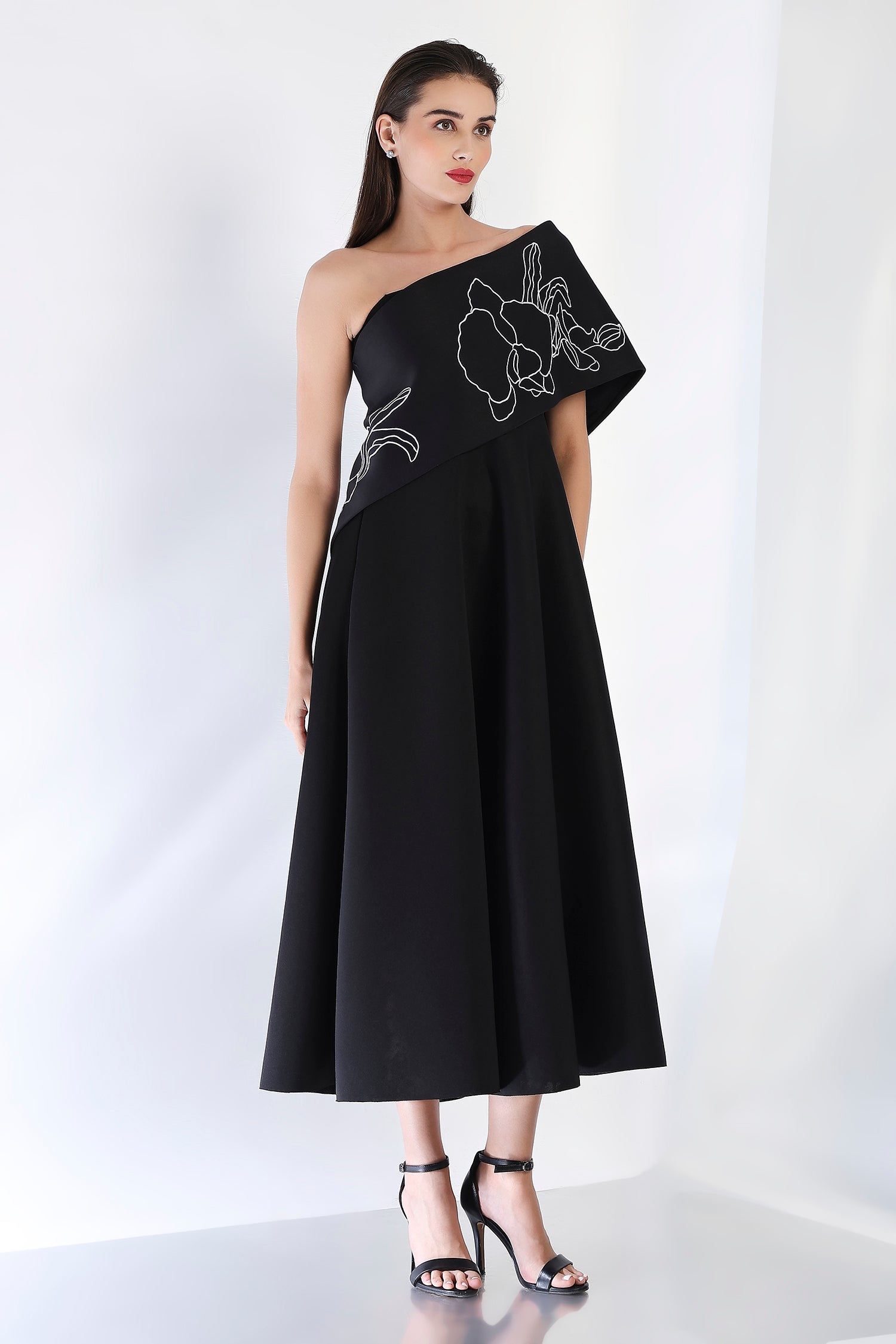 Sophisticated and striking, this strapless black midi dress features a flattering fit-and-flare design, complemented by the Vero embroidered wrap. The intricate embroidery and dual styling options—one-shoulder or off-shoulder—elevate this dress, making it a perfect choice for any refined evening occasion.