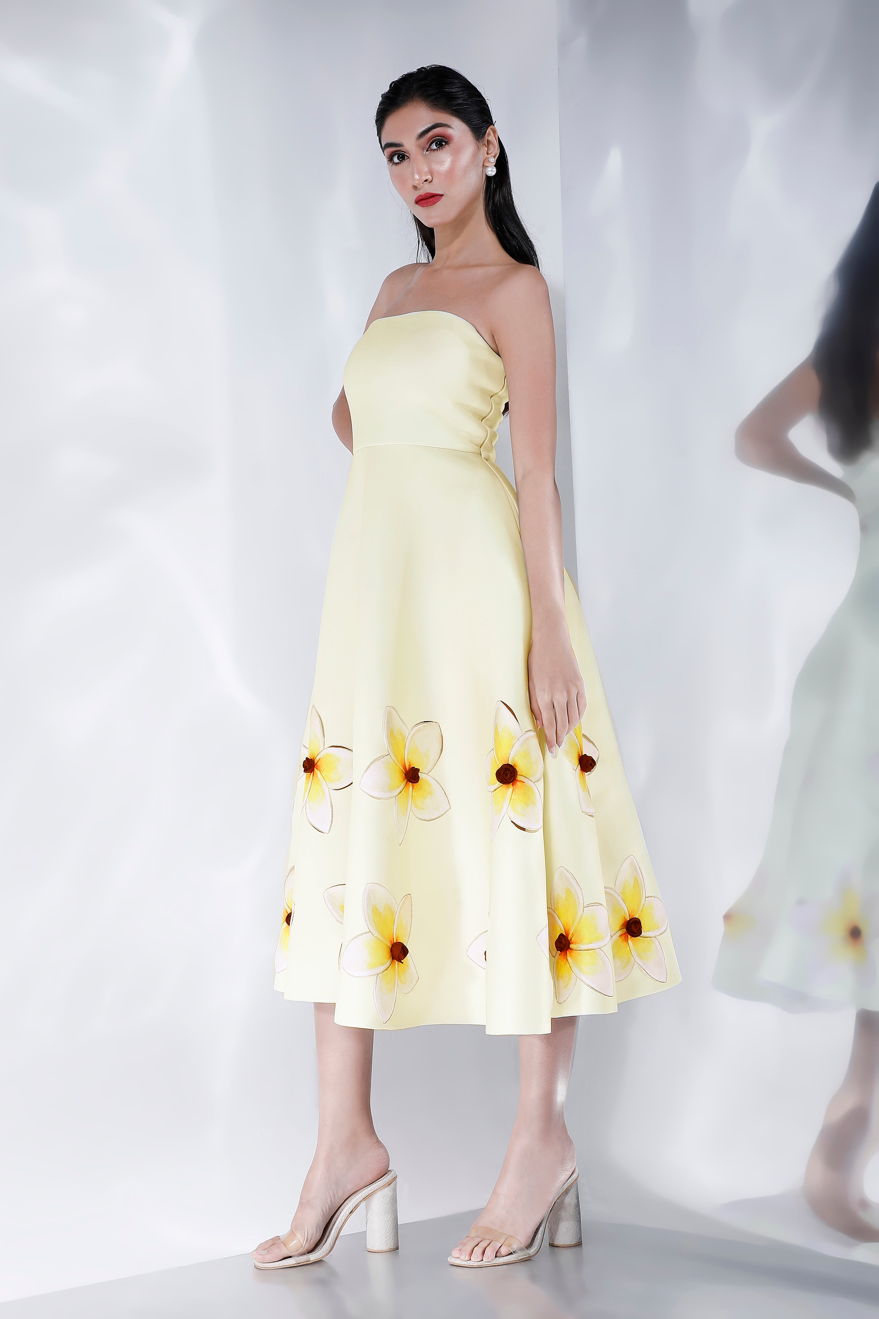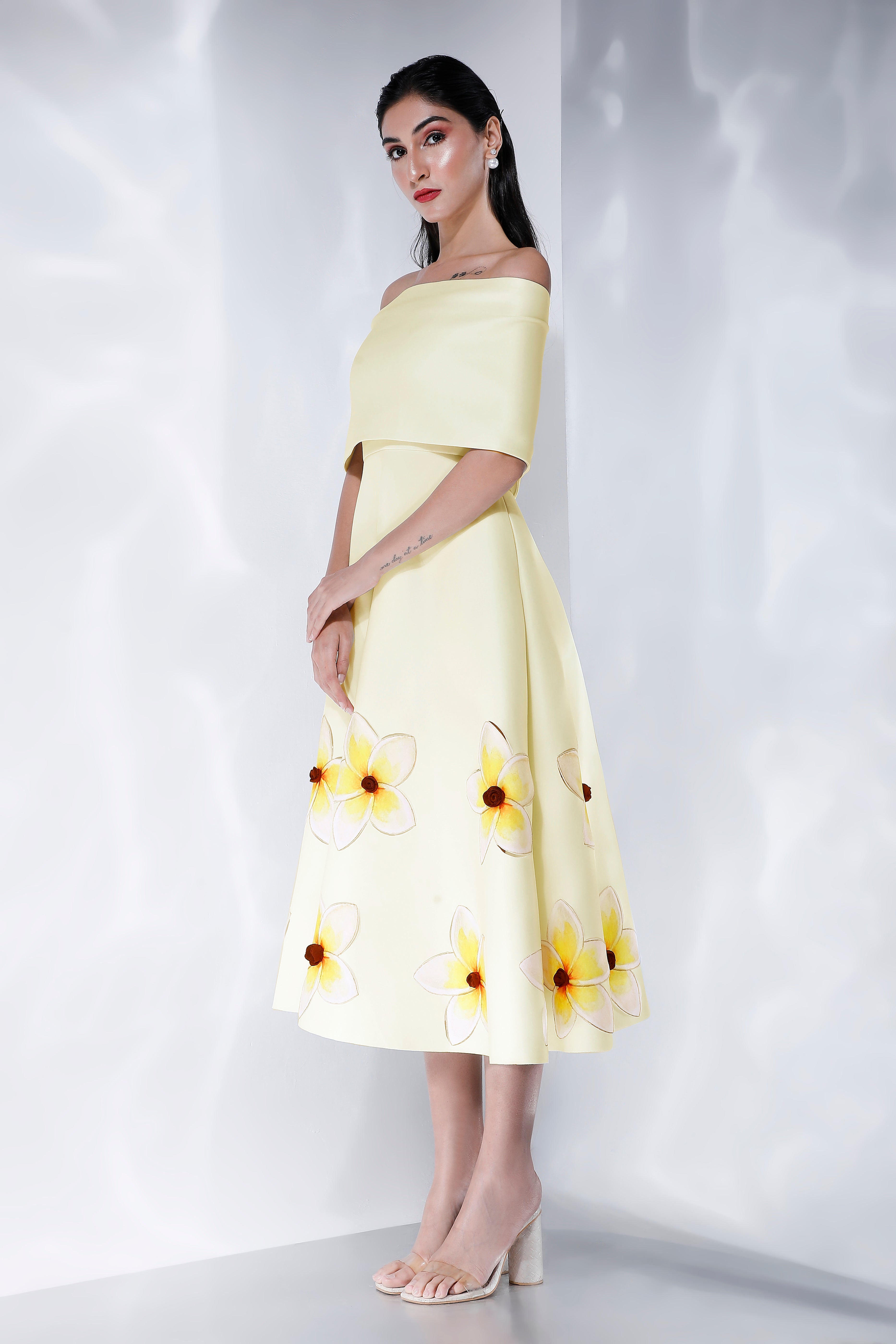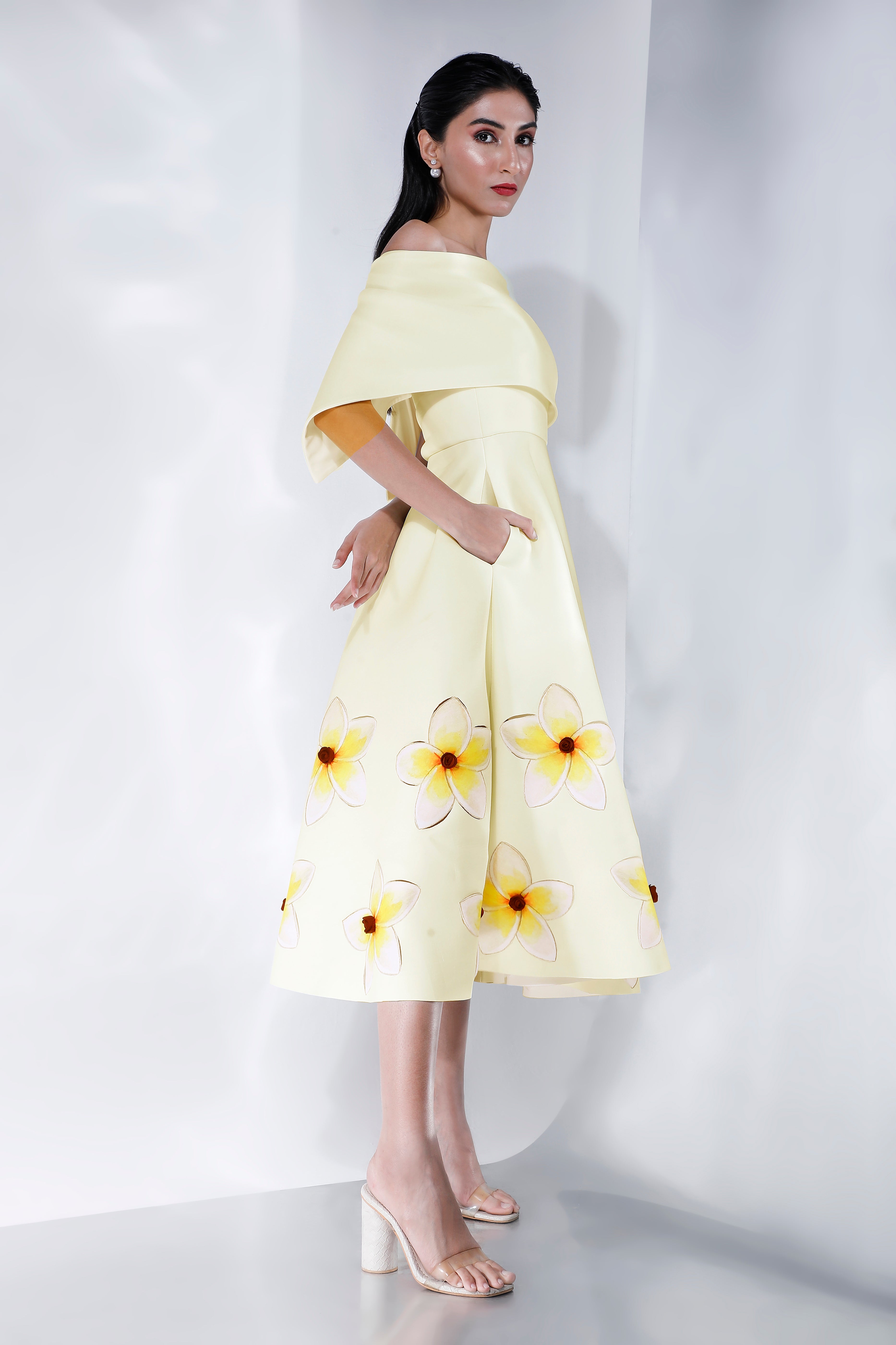 Cordelia is a fit and flare midi dress that combines modern style with classic floral motifs.